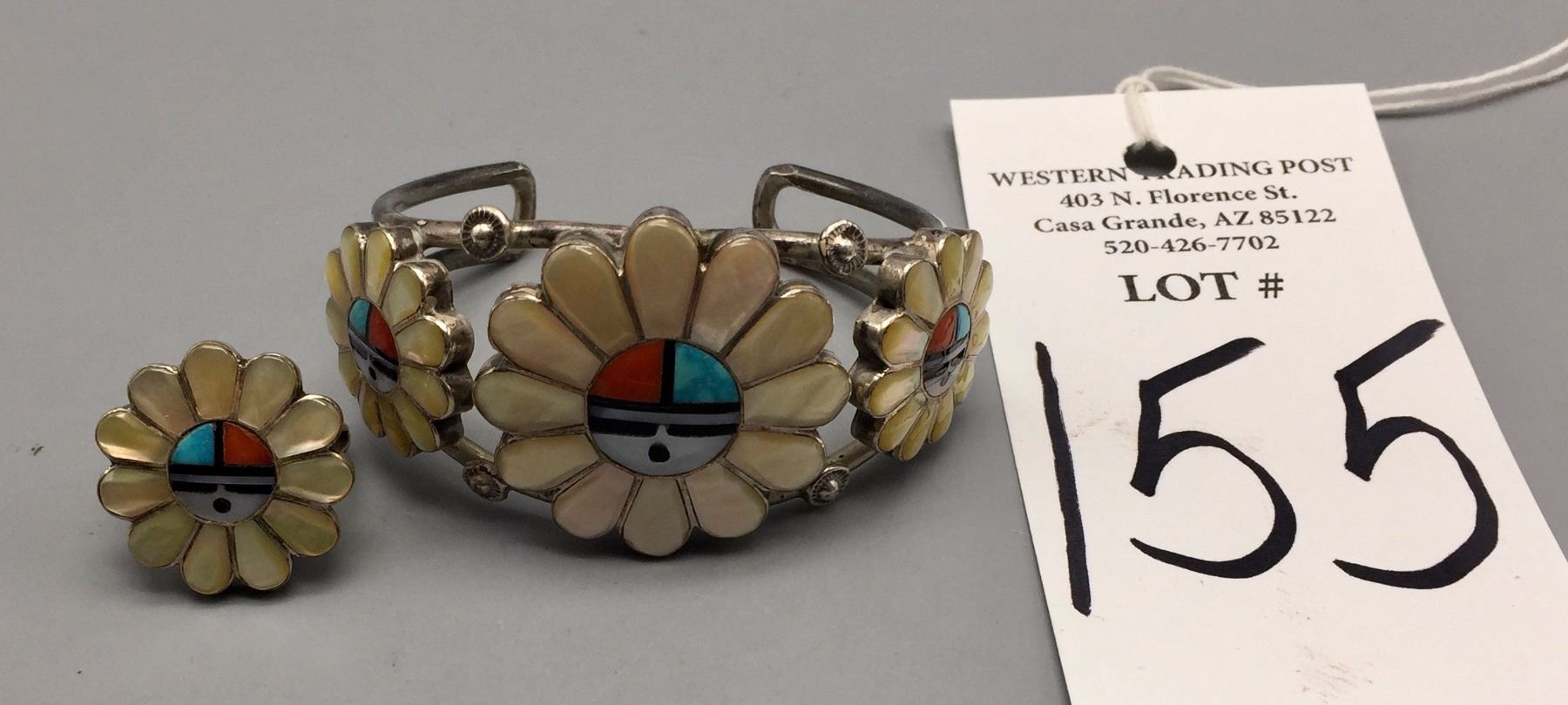Maker: Morris and Sadie Laahte, Zuni. Approx. Age: Circa 1970s. Size: Inside circumference is 5 3/4” plus 1” opening (fits a 6 3/4” wrist) 1 1/2” wide. Ring is size 6. Set weighs 47 1/2 g. Additional Info: Zuni sun face inlay. Matching ring and bracelet by known makers. Condition: Good for its age, normal wear expected. Please look closely at the pictures - they are an important part of our description. Shipping: There will be a $5 handling / packaging fee for shipping this lot. The actual cost of postage will be added on top of that.