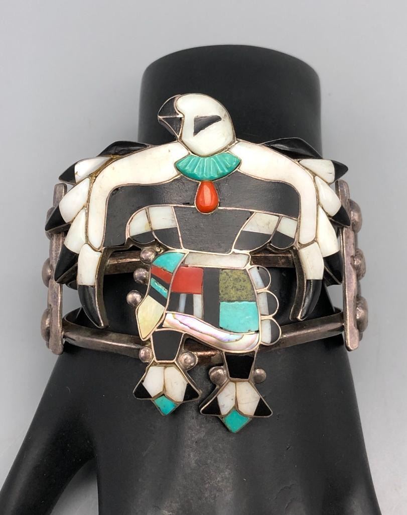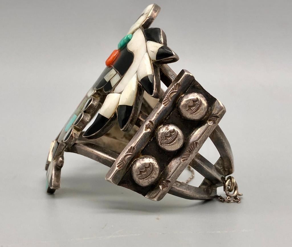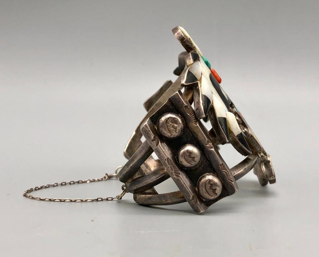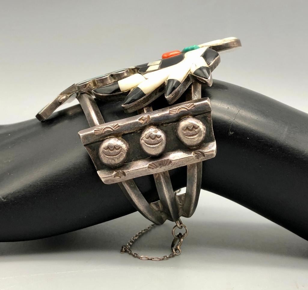 For sale in this lot is a Zuni inlay bracelet by CMP. This is a beautiful eagle dancer inlay bracelet set with shell, turquoise, coral and onyx. The bracelet has nicely carved and raised stones giving the piece some great dimension. It has a chain attached for extra security and is made from sterling silver.