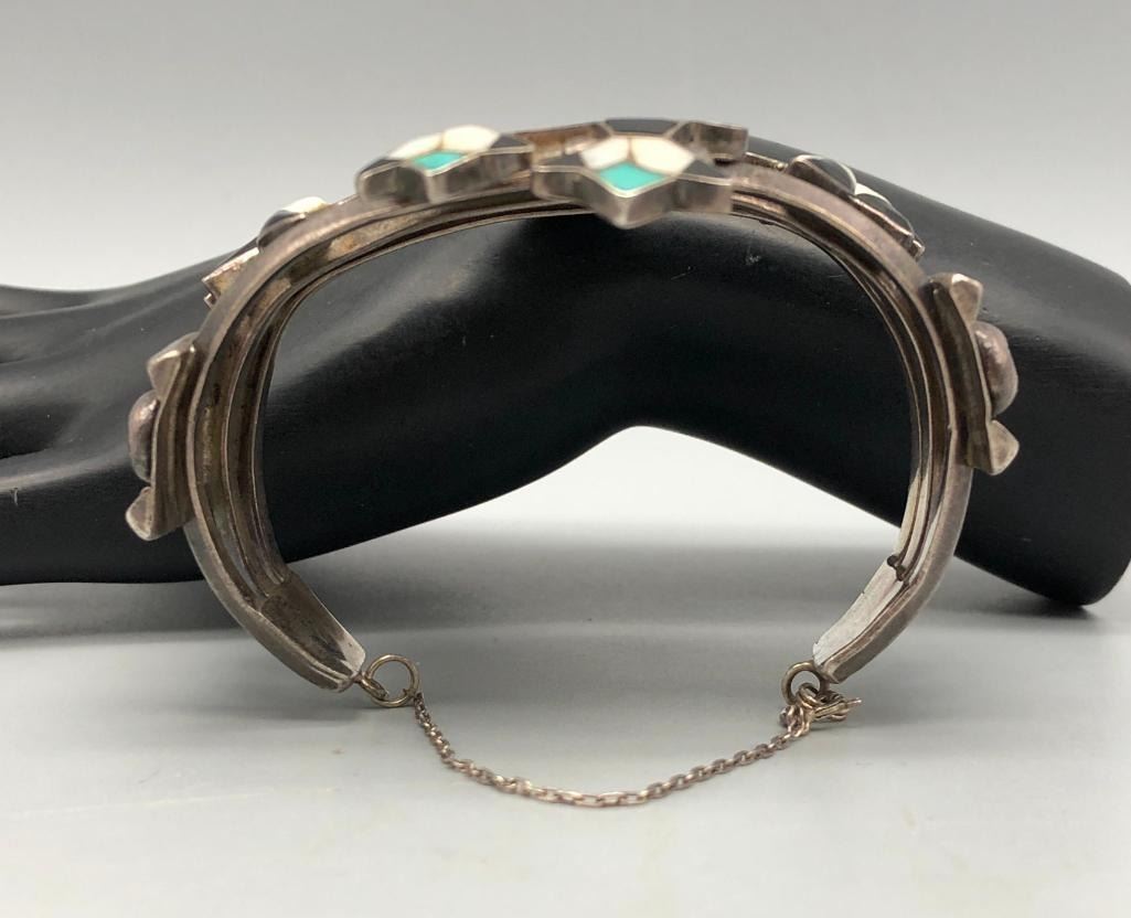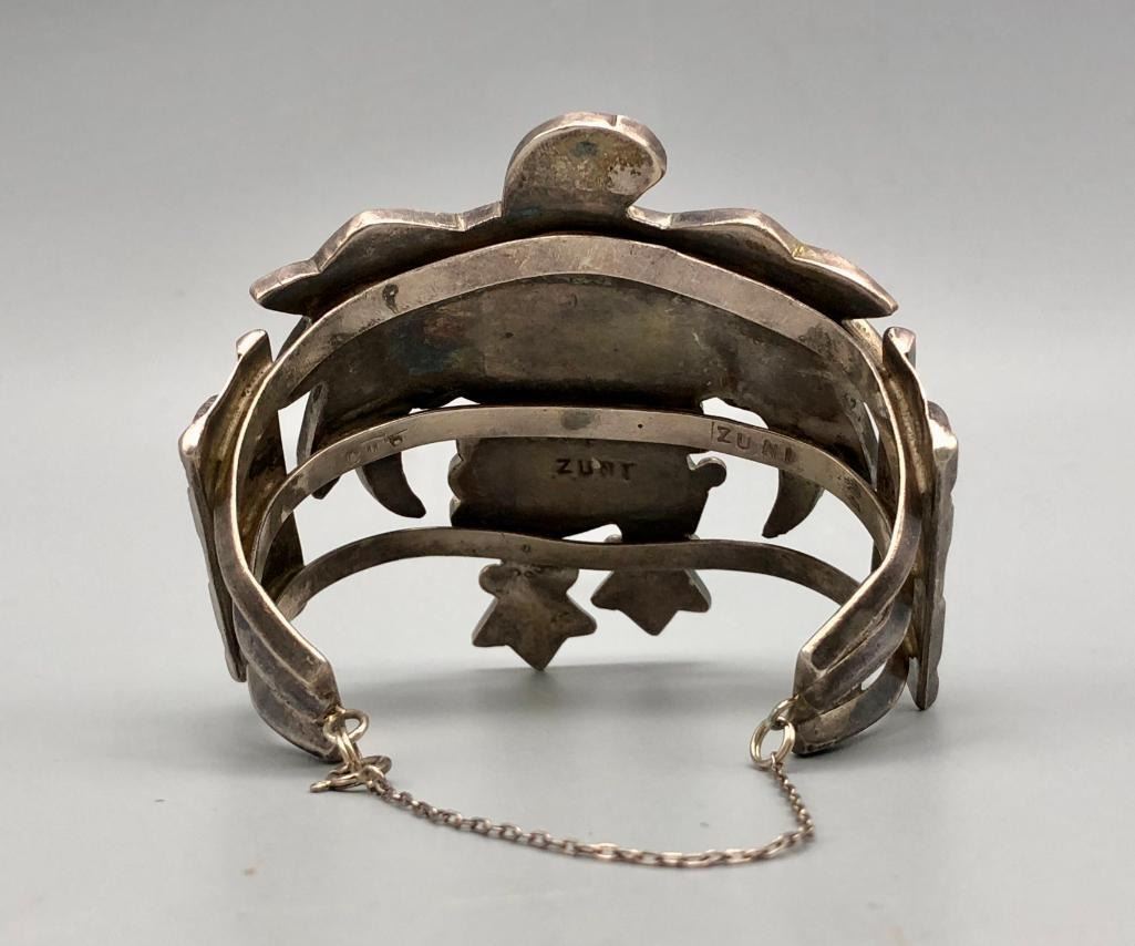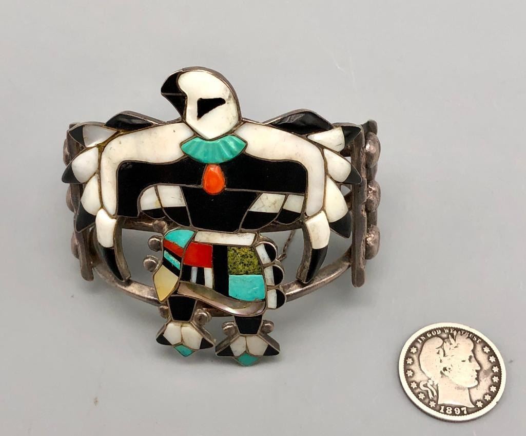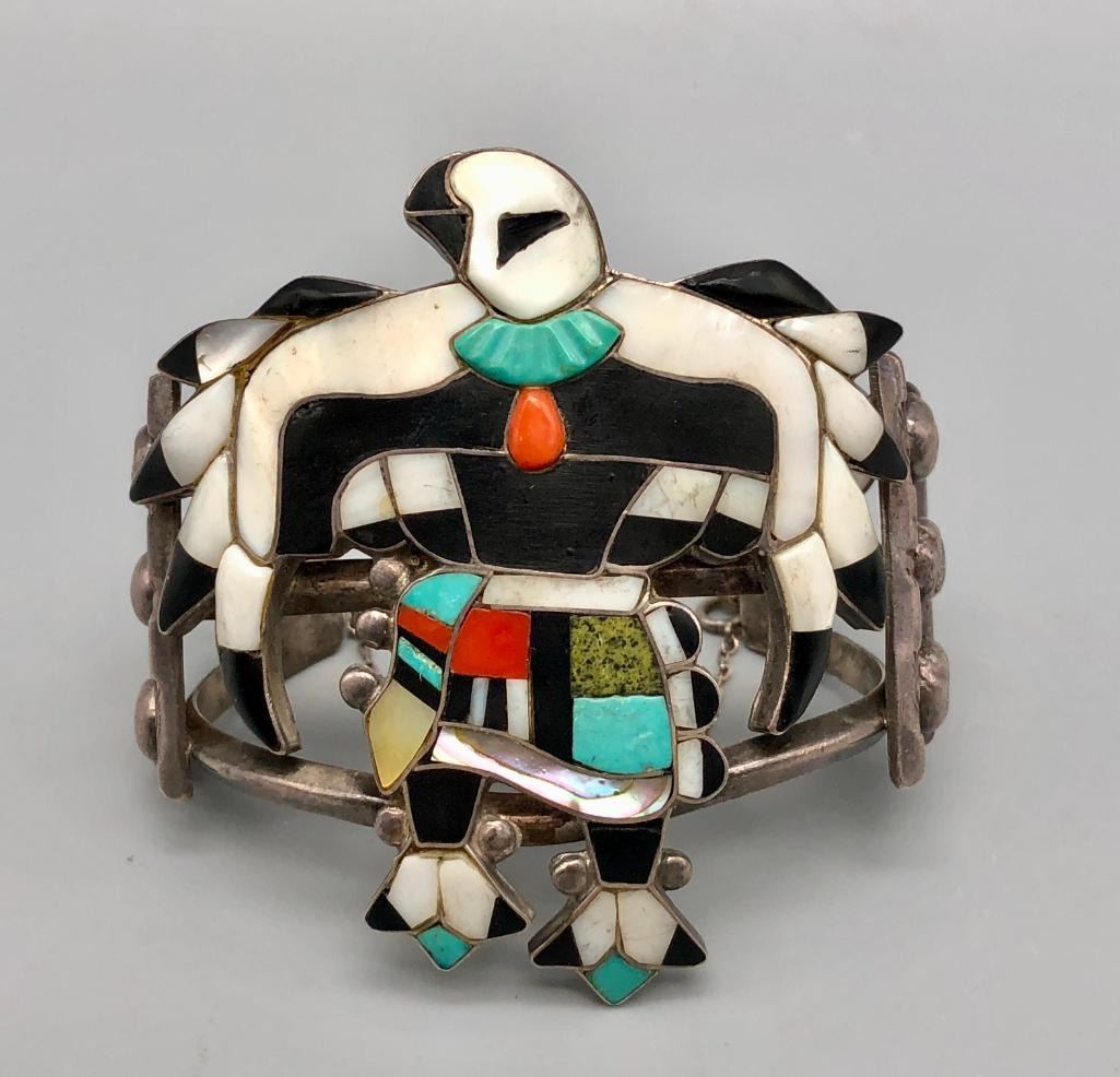 For sale in this lot is a Zuni inlay bracelet by CMP. This is a beautiful eagle dancer inlay bracelet set with shell, turquoise, coral and onyx. The bracelet has nicely carved and raised stones giving the piece some great dimension. It has a chain attached for extra security and is made from sterling silver.