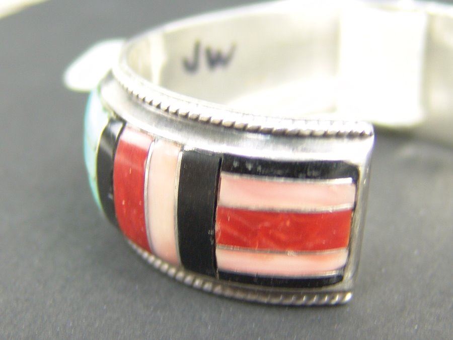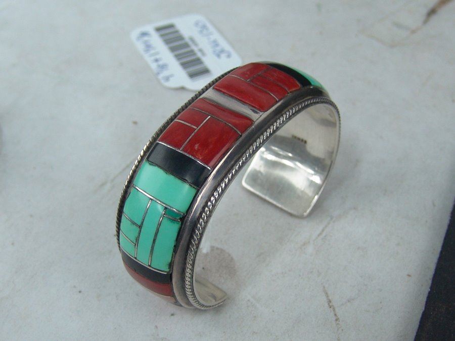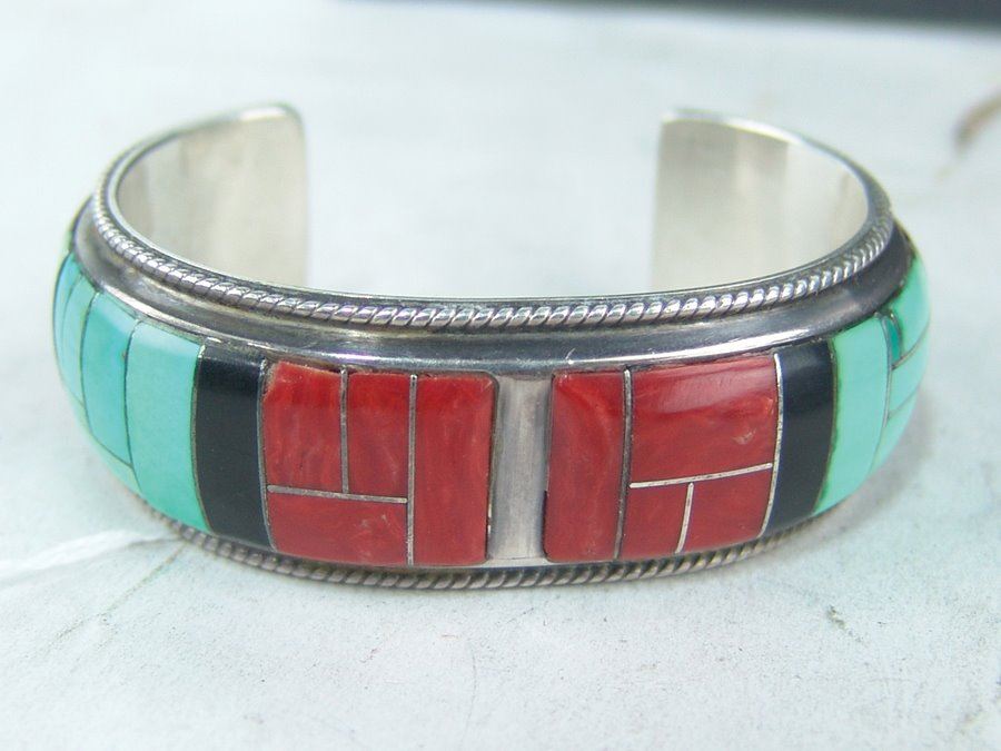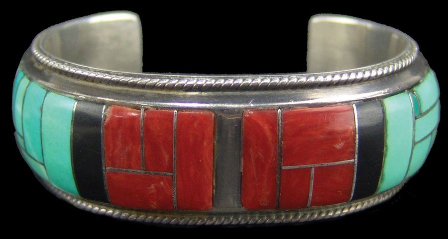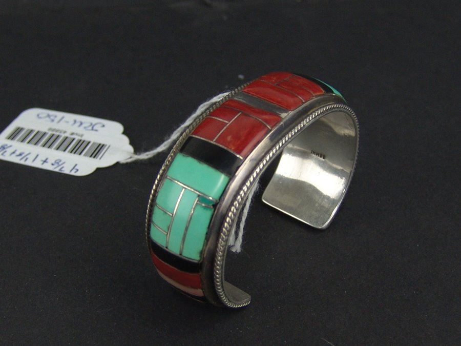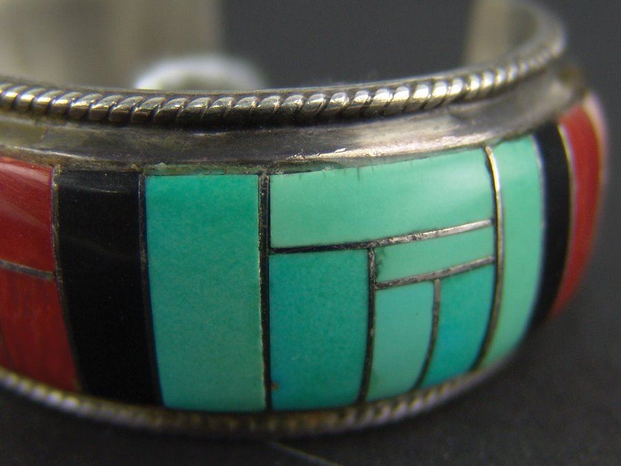 Fine, vintage, all silver cuff bracelet with tiny rope work edging and a large channel inlay top with turquoise, coral, jet, and shell stones. Very good condition, nice patina.,,4 7/8 " + 1 1/8 " x 7 /8 "