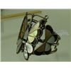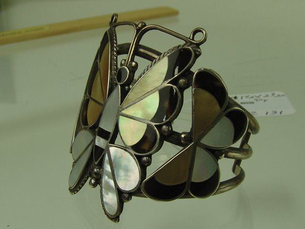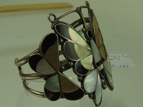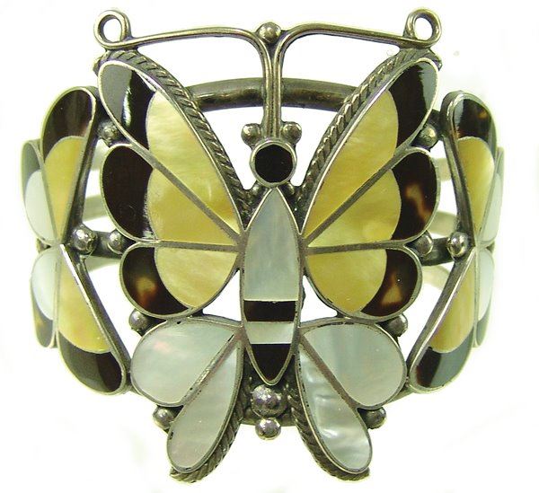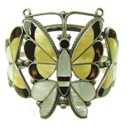 Very fine, all silver, 3-band bracelet done in traditional channel and mosaic inlay styles, and featuring butterflies or moths. Very good condition. Unsigned.