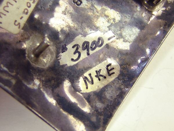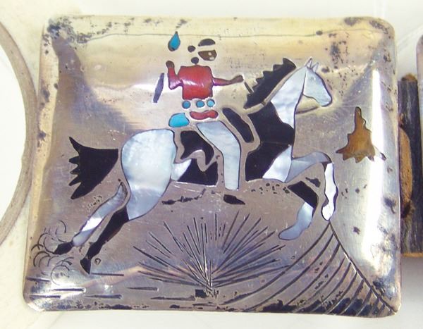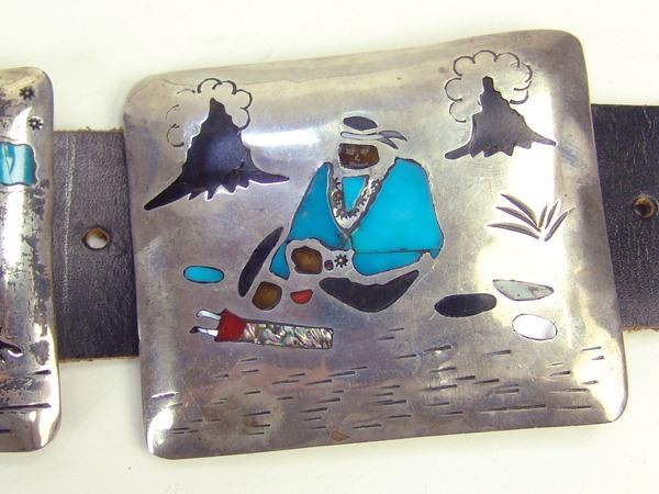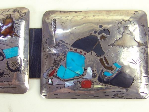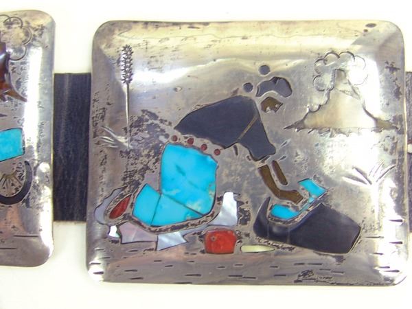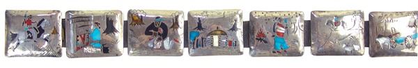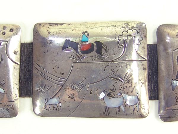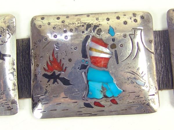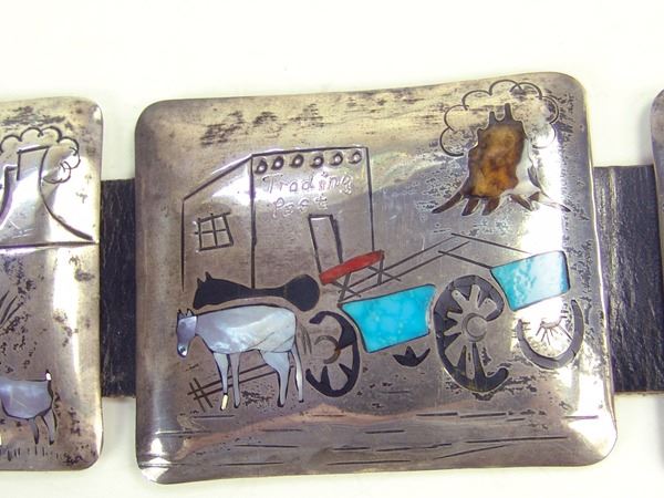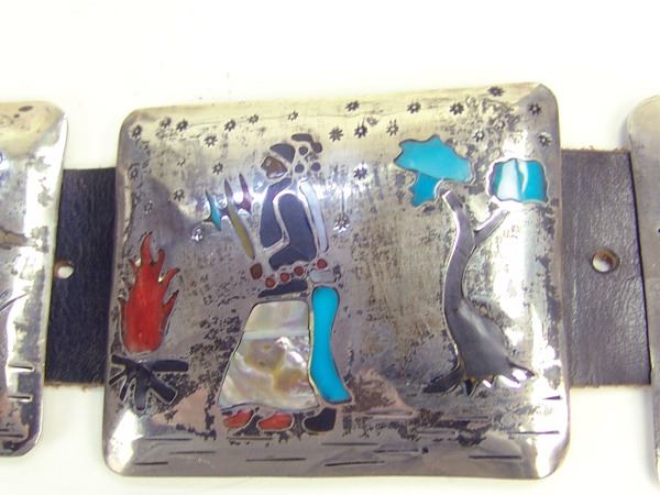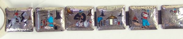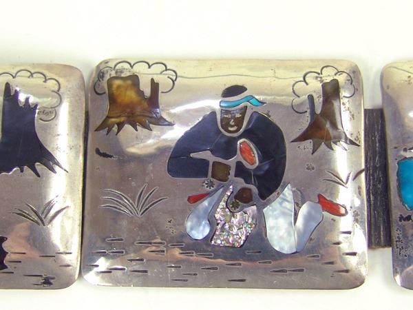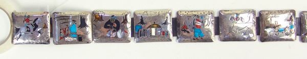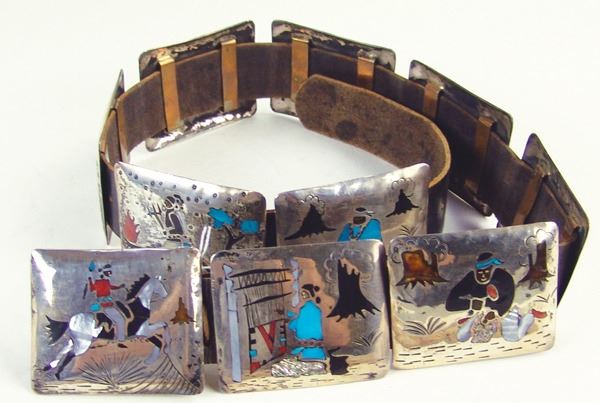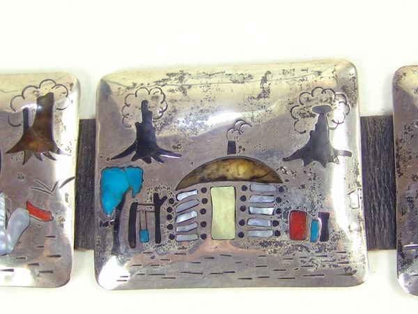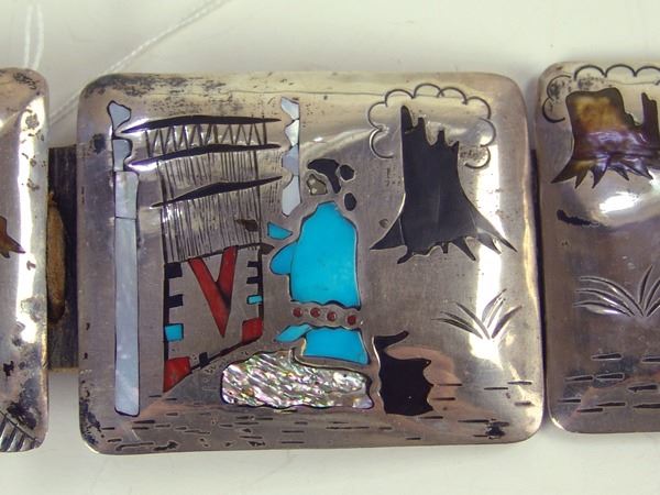 Outstanding, handwrought, all silver concho belt the ten, 2-1/2" x 3" rectangular conchos and buckle all with finely inlaid story scenes, showing, weavers, riders, dancers, etc. Very good condition, with good patina.Ca. 1970sFits up to 36"