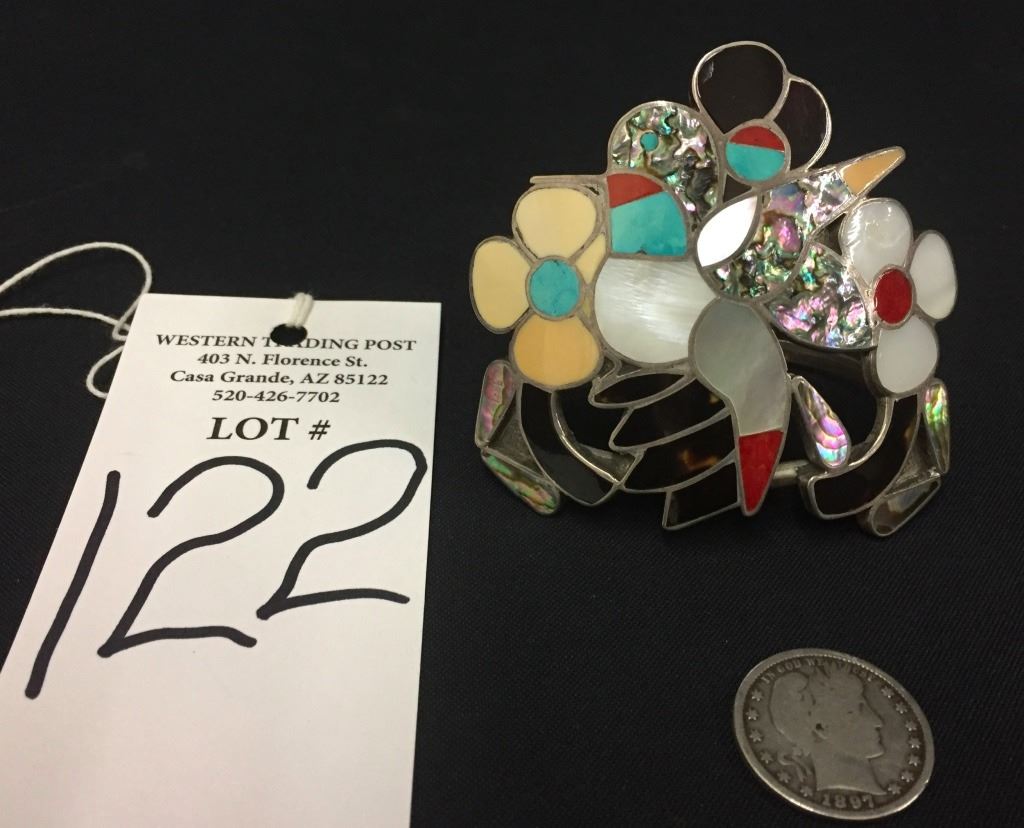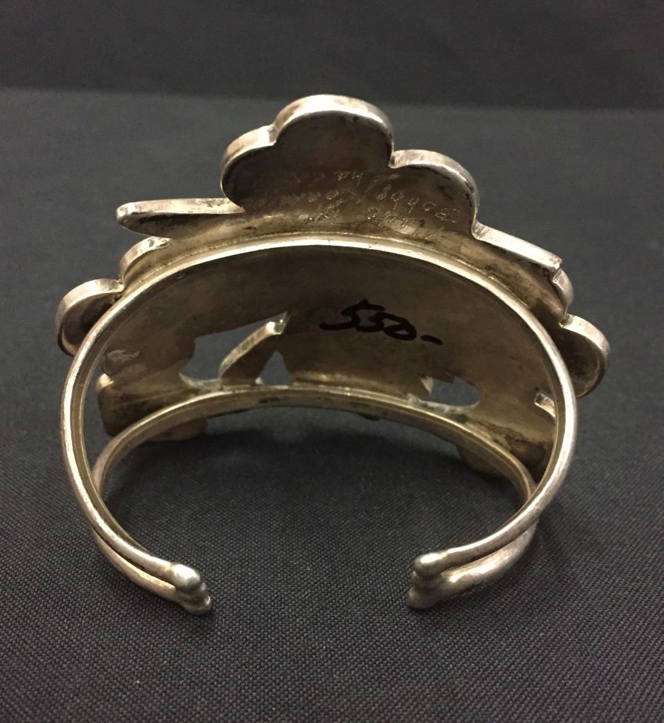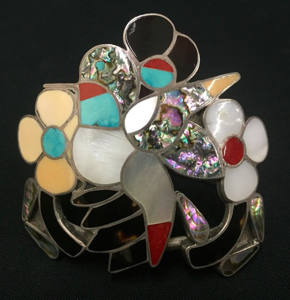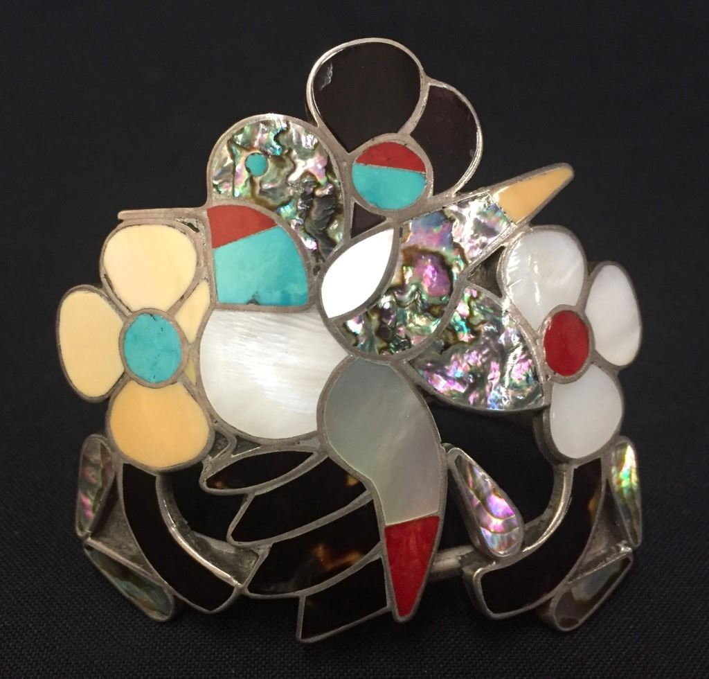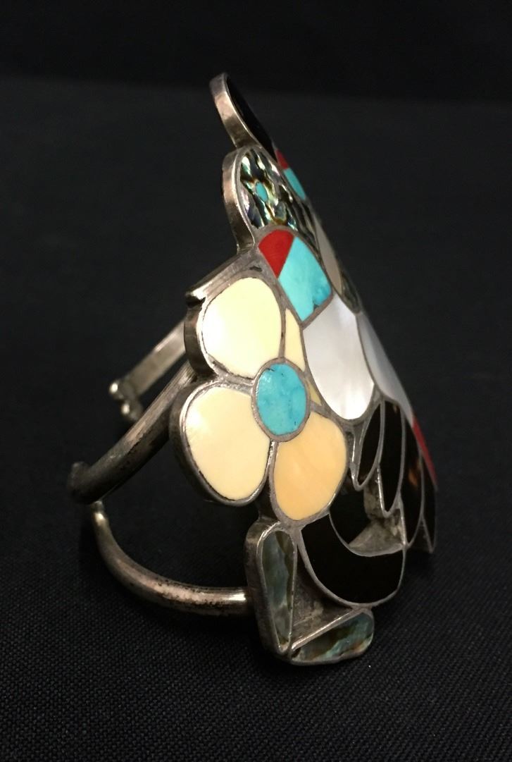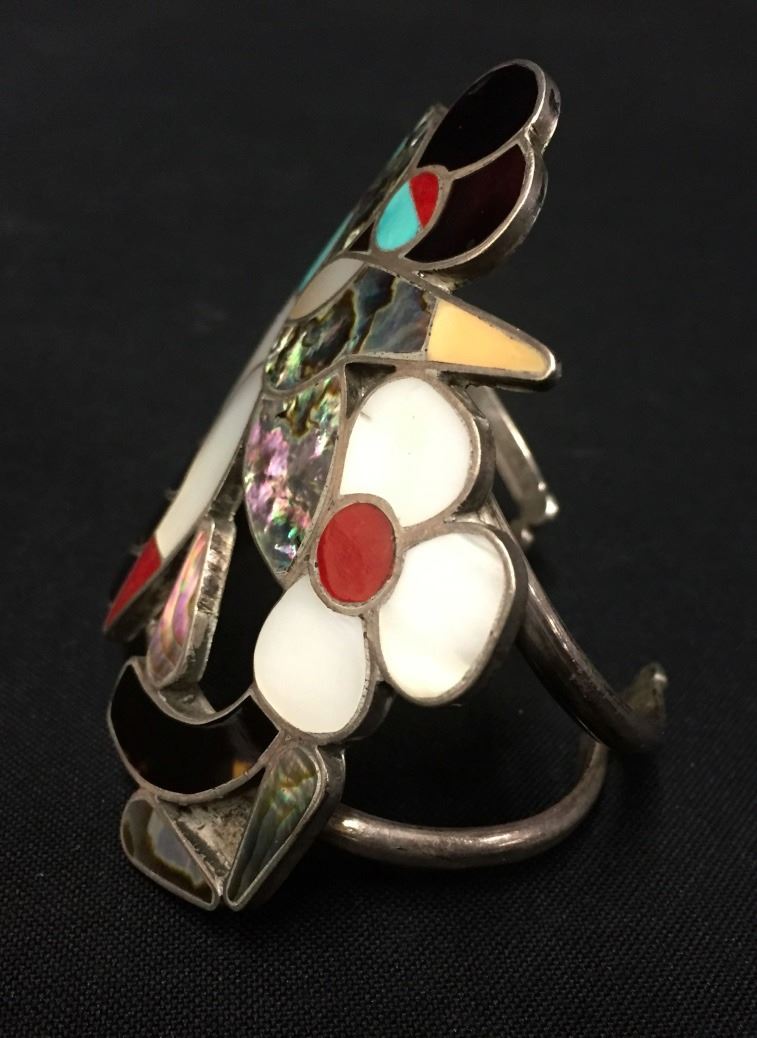 Maker: Bobby & Corraine Shack, Zuni. Approx. Age: Circa 1970s - 80s. Size: Measures 5.25” inside plus there is a 1” opening. It is 2.75” wide across the face and weighs 56g. Condition: Good. Additional Info: Fine inlay set in sterling silver by known Zuni artisans. Please look closely at the pictures - they are an important part of our description. Shipping: There will be a $5 handling / packaging fee for shipping this lot. The actual cost of postage will be added on top of that.