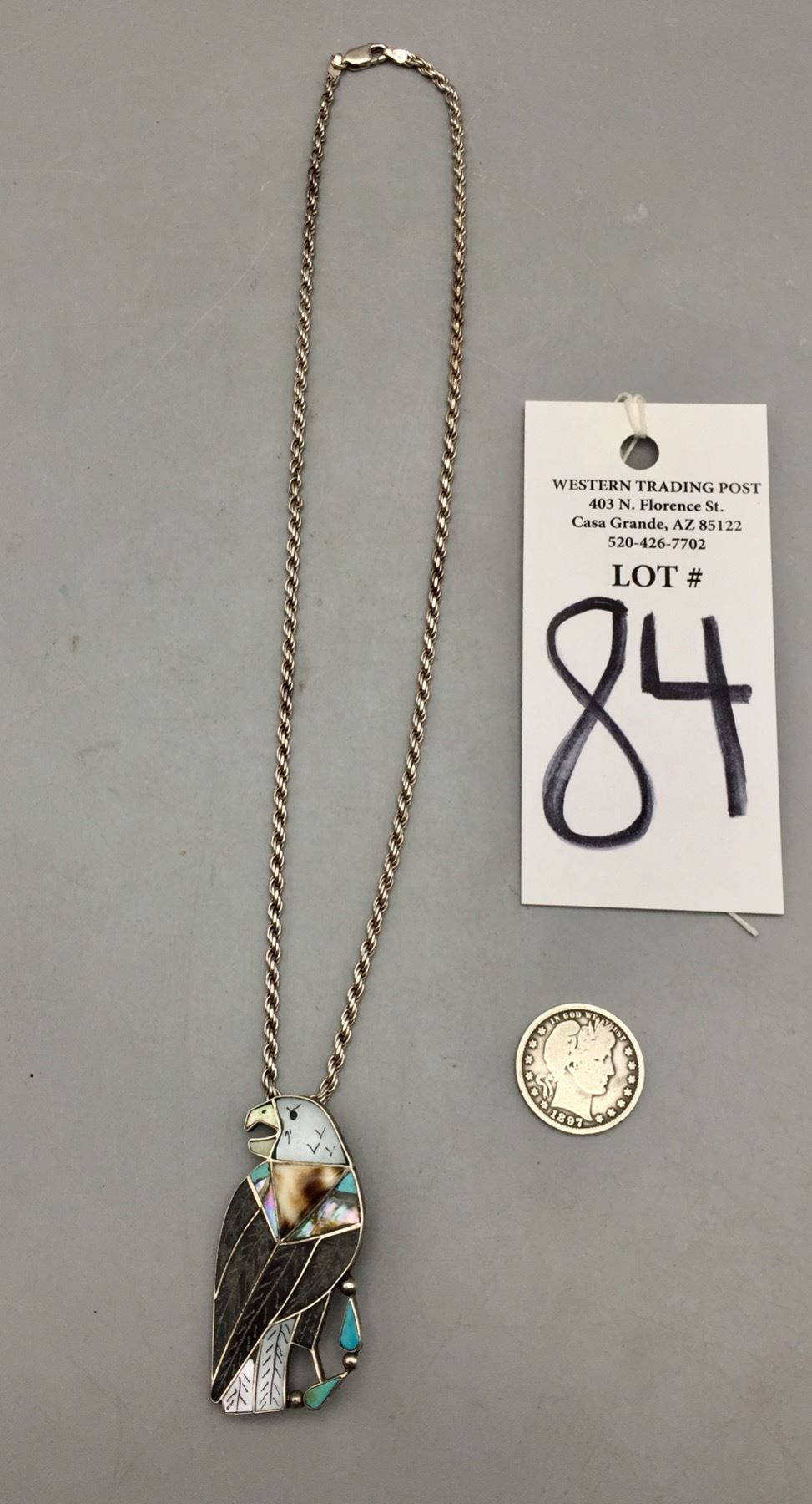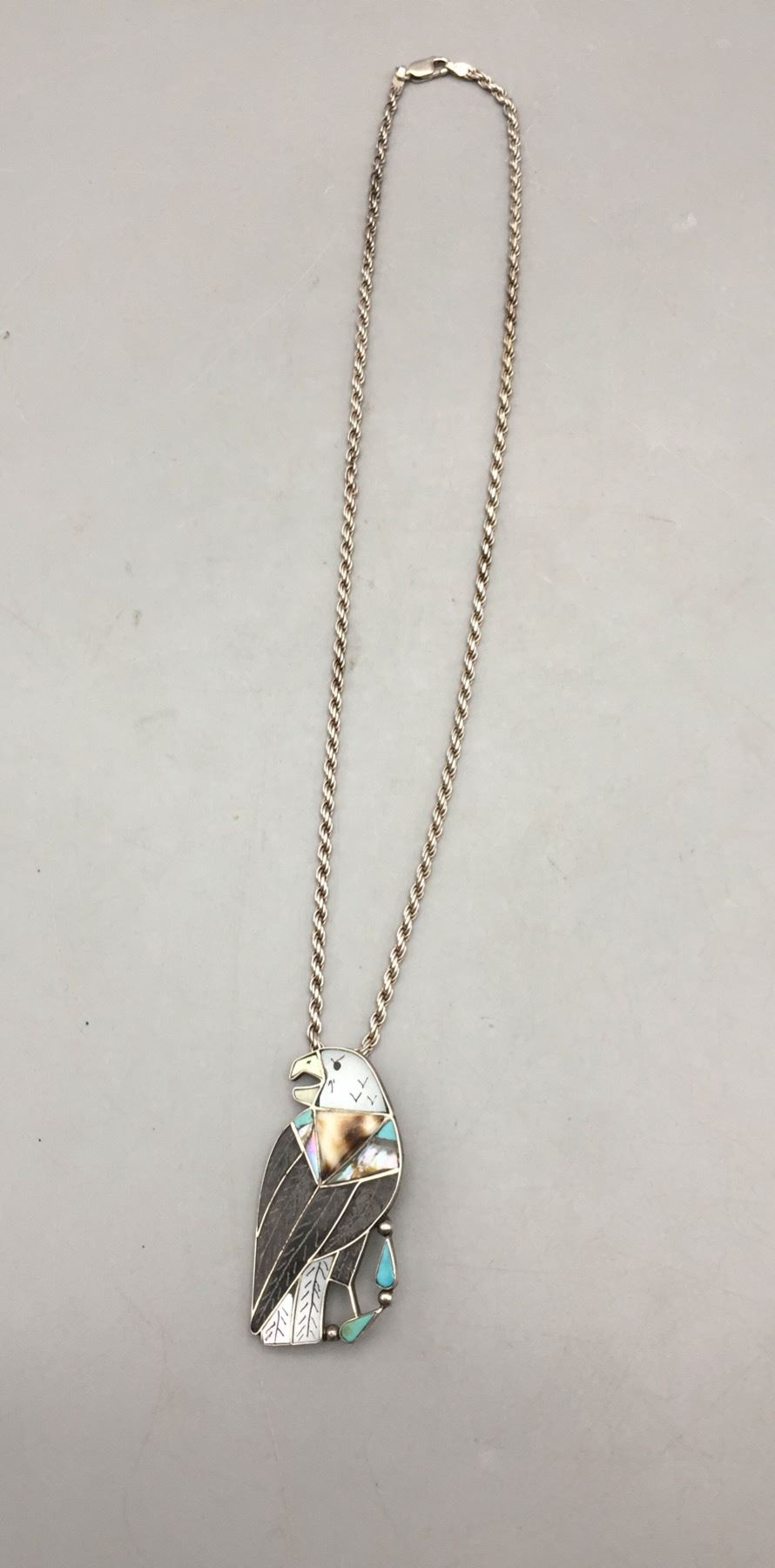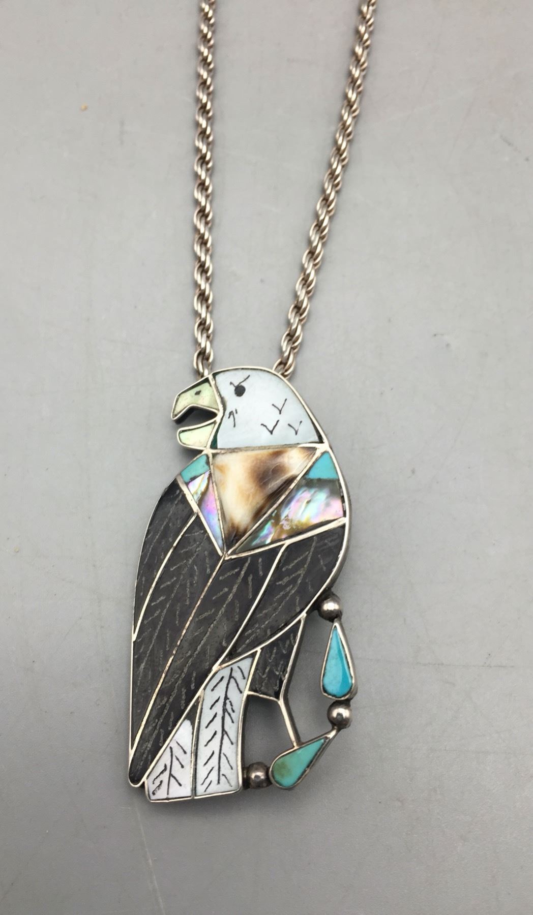 Description: For sale in this lot is a neat Zuni inlay eagle pin/pendant with a chain. It is set with shell, turquoise and onyx in sterling silver. Maker: C.D. Leekity, Zuni. Approx. Age: Fairly modern. Size: Fits a 19 inch neck. Pendant measures 2-1/8 inches long x 1-1/8 inches wide. Weighs 24 grams. Condition: Good for its age, normal wear expected. Please look closely at the pictures - they are an important part of our description. Shipping: There will be a $5 handling, packaging fee for shipping this lot. The actual cost of postage will be added on top of that.