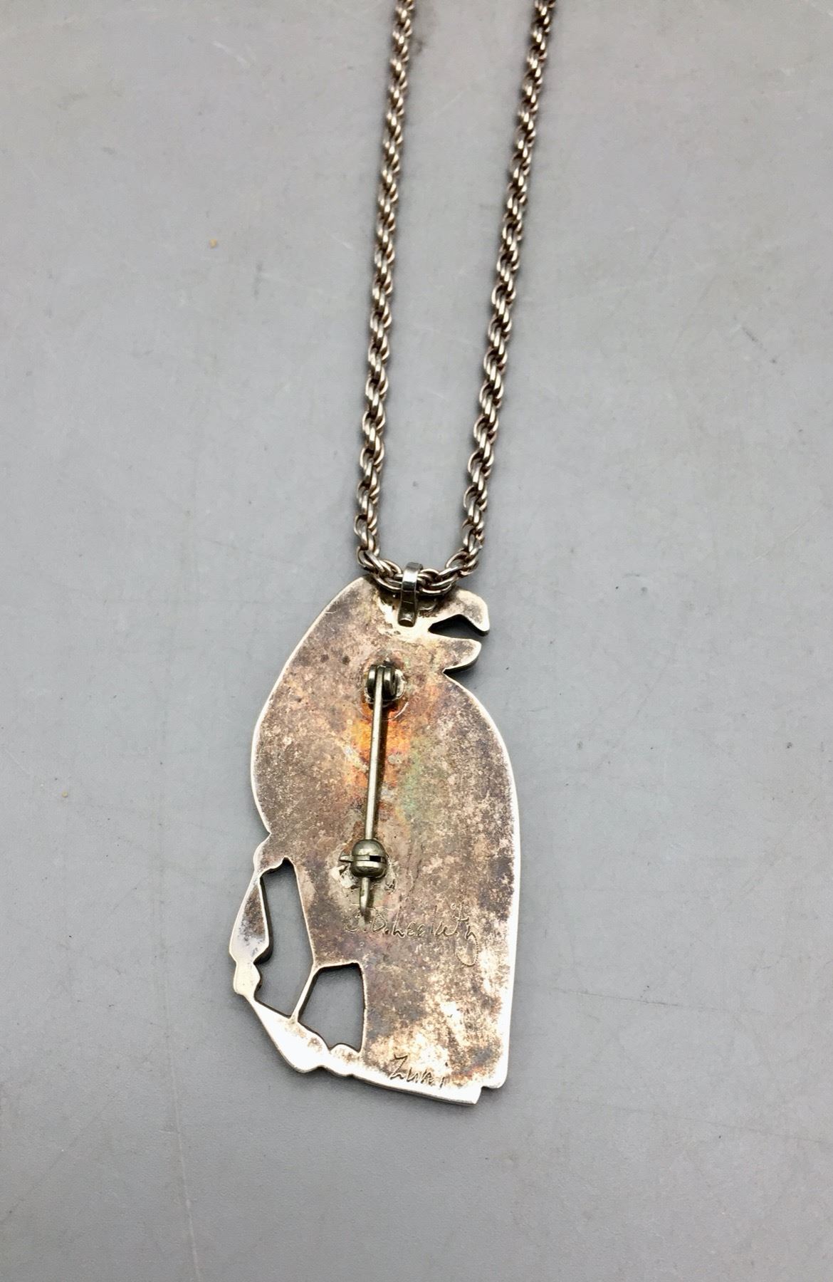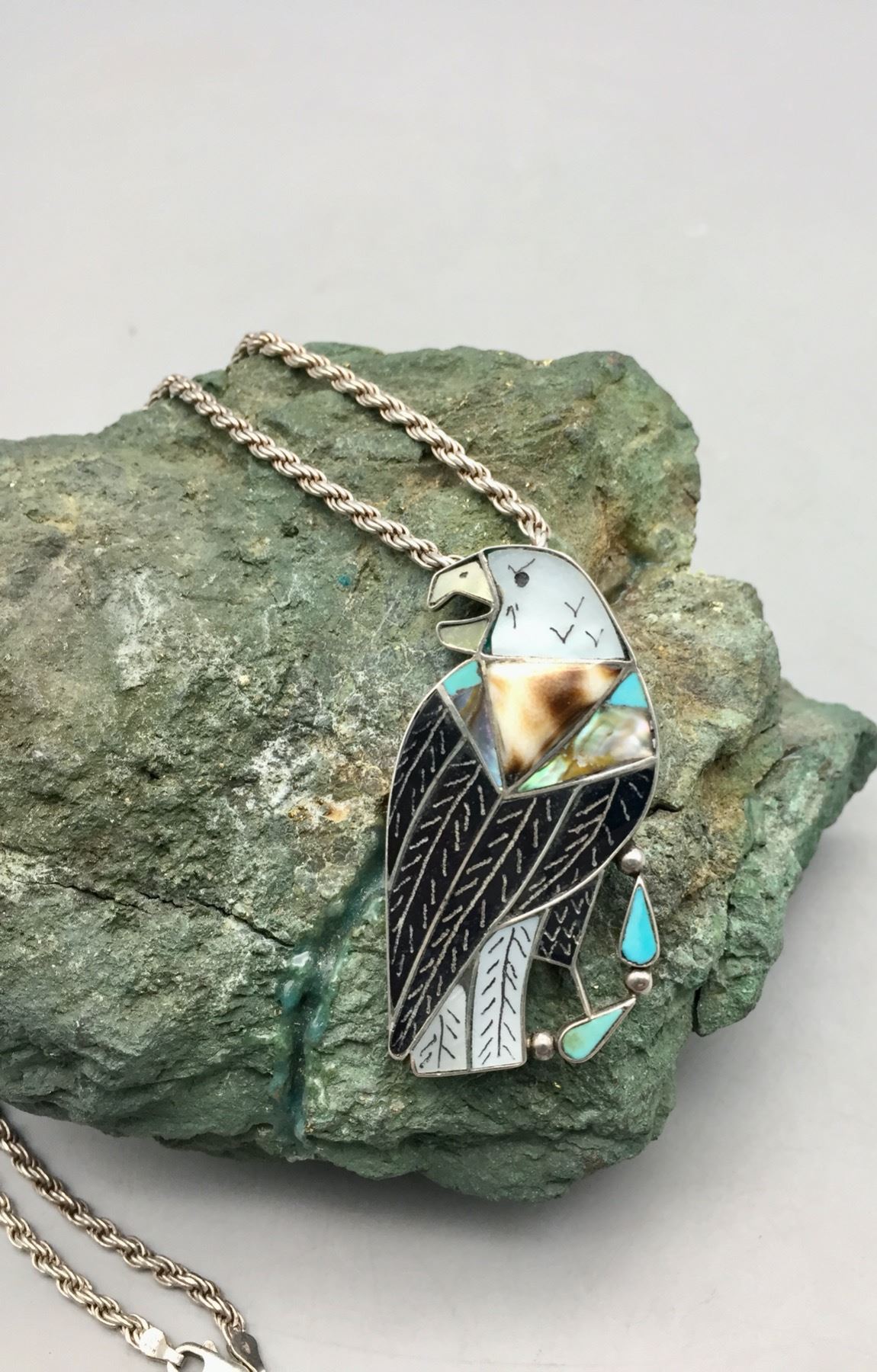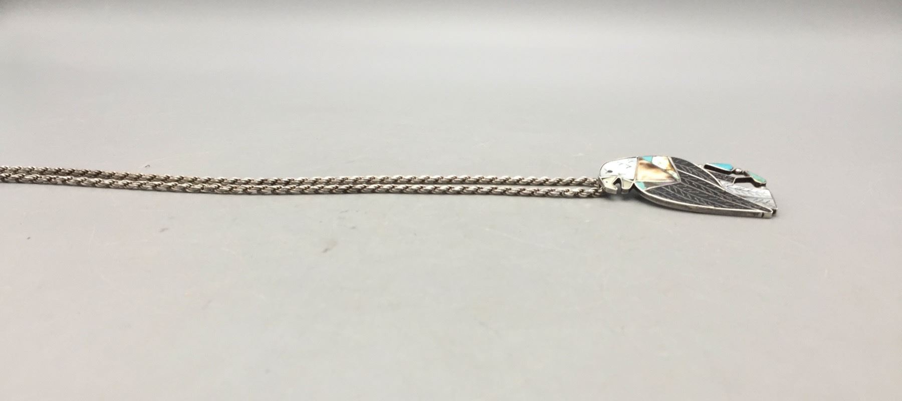 Description: For sale in this lot is a neat Zuni inlay eagle pin/pendant with a chain. It is set with shell, turquoise and onyx in sterling silver. Maker: C.D. Leekity, Zuni. Approx. Age: Fairly modern. Size: Fits a 19 inch neck. Pendant measures 2-1/8 inches long x 1-1/8 inches wide. Weighs 24 grams. Condition: Good for its age, normal wear expected. Please look closely at the pictures - they are an important part of our description. Shipping: There will be a $5 handling, packaging fee for shipping this lot. The actual cost of postage will be added on top of that.