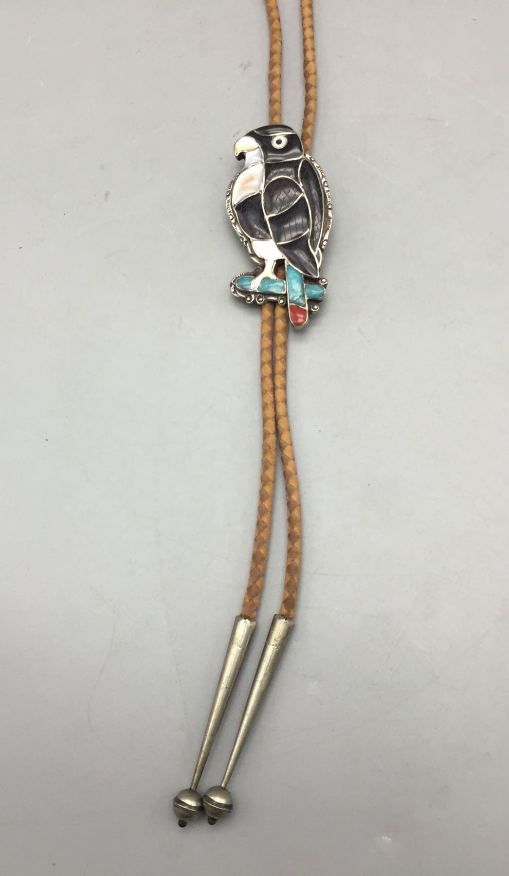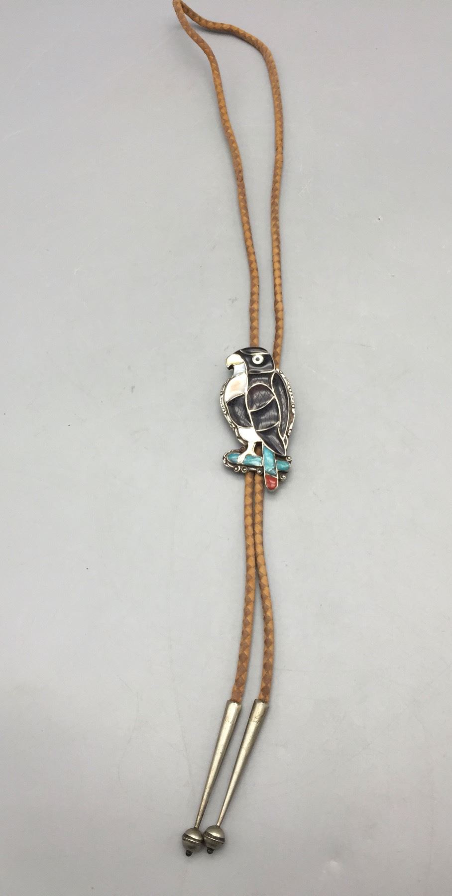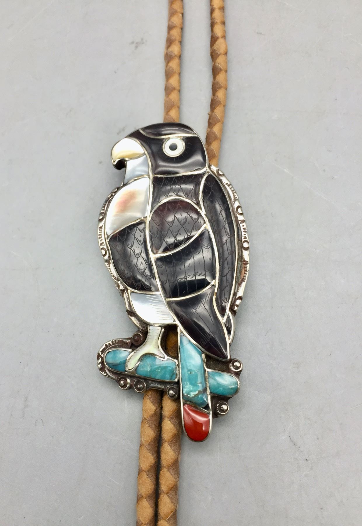 Description: Offered for sale in this lot is a beautiful Zuni inlay hawk themed bolo tie set with inlaid shell, turquoise, coral and onyx in sterling silver. Maker: Unmarked. Approx. Age: Circa 1970s. Size: Cord measures 37 inches long with tips. Slide measures 2-7/8 inches long x 1-3/8 inches wide. Weighs 37.9 grams. Condition: Good for its age, normal wear expected. Please look closely at the pictures - they are an important part of our description. Shipping: There will be a $5 handling, packaging fee for shipping this lot. The actual cost of postage will be added on top of that.