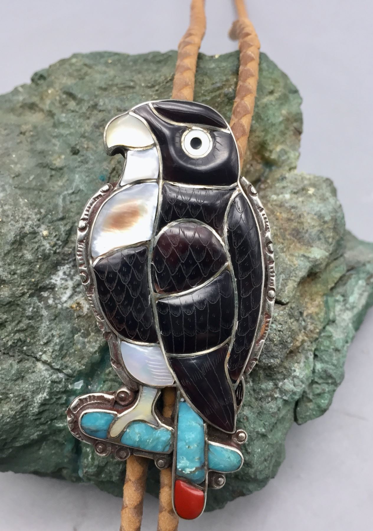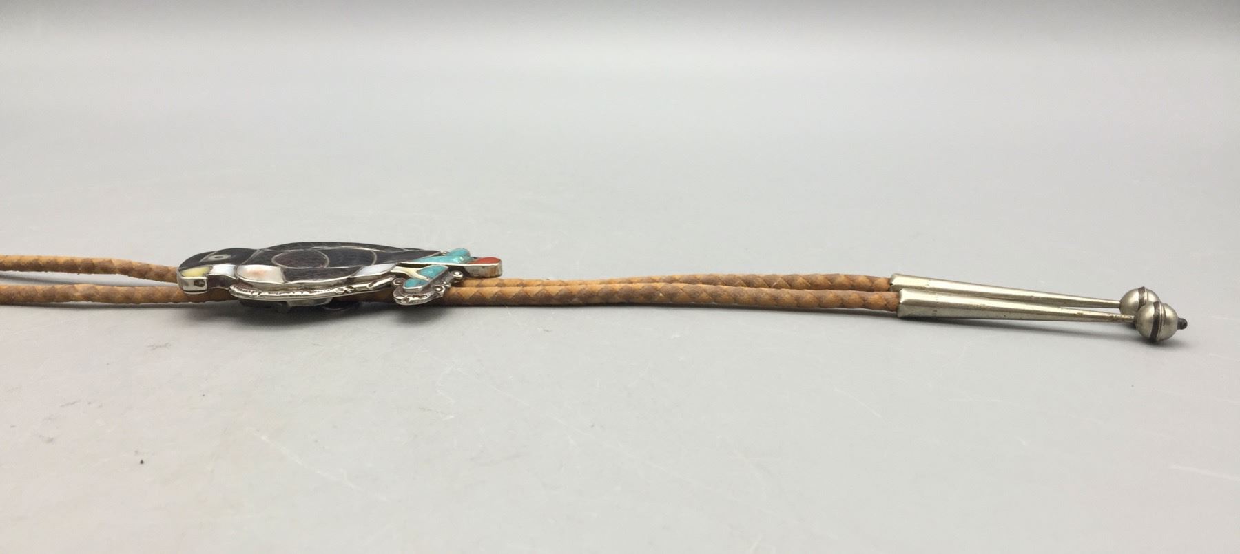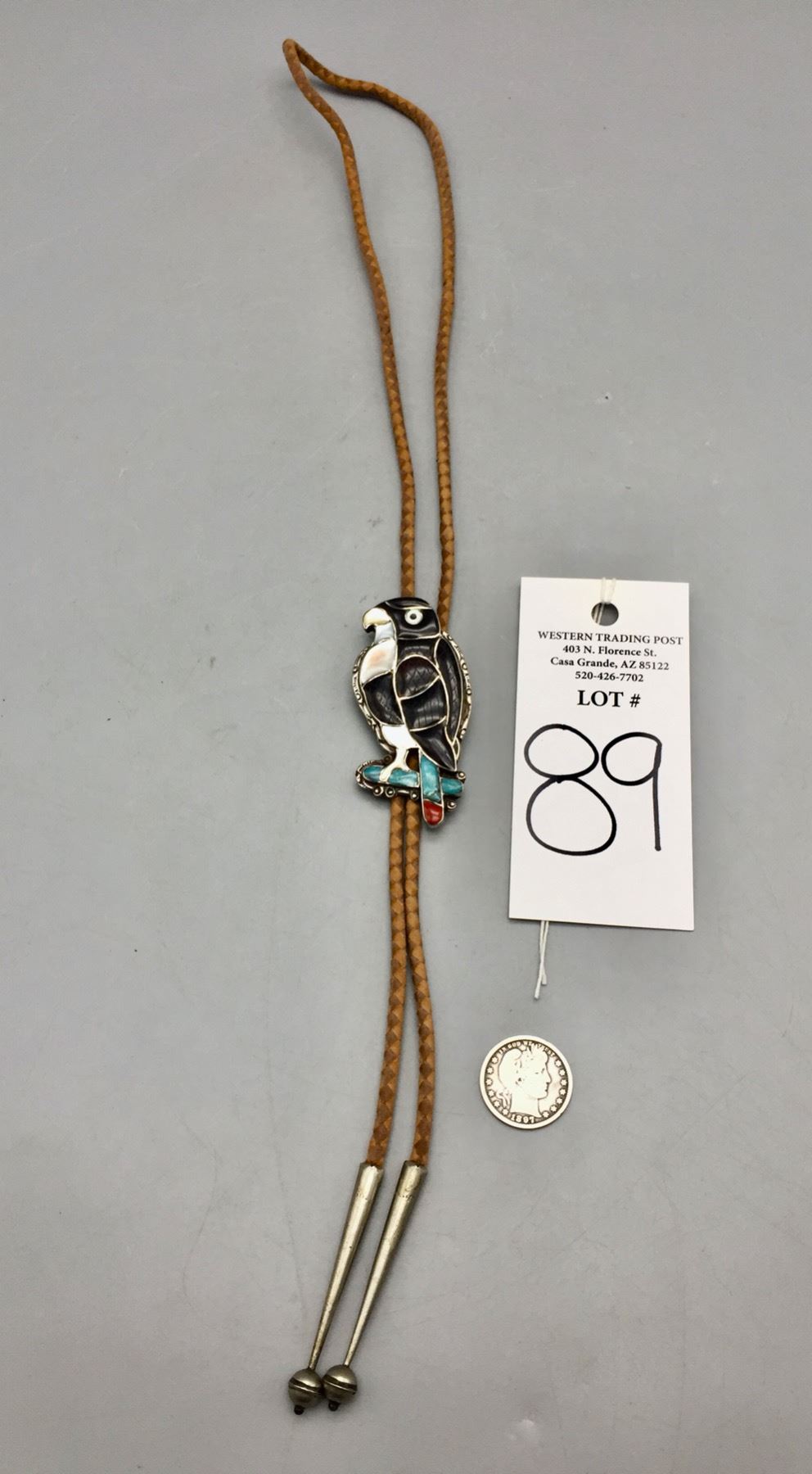 Description: Offered for sale in this lot is a beautiful Zuni inlay hawk themed bolo tie set with inlaid shell, turquoise, coral and onyx in sterling silver. Maker: Unmarked. Approx. Age: Circa 1970s. Size: Cord measures 37 inches long with tips. Slide measures 2-7/8 inches long x 1-3/8 inches wide. Weighs 37.9 grams. Condition: Good for its age, normal wear expected. Please look closely at the pictures - they are an important part of our description. Shipping: There will be a $5 handling, packaging fee for shipping this lot. The actual cost of postage will be added on top of that.