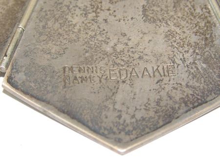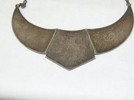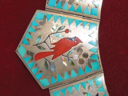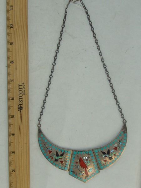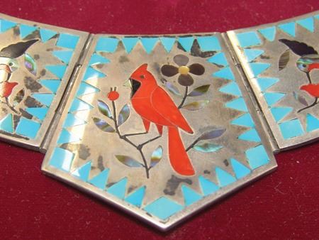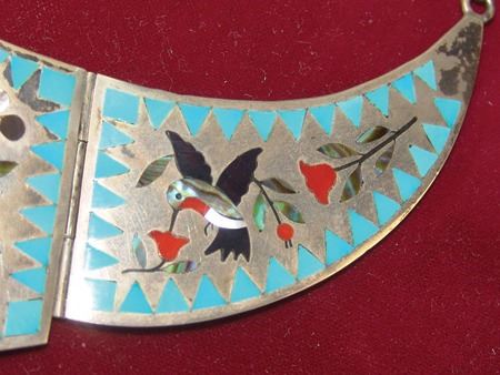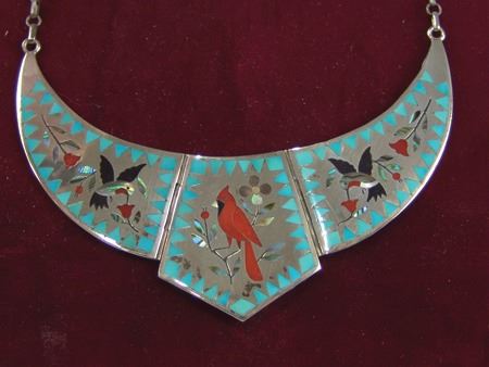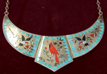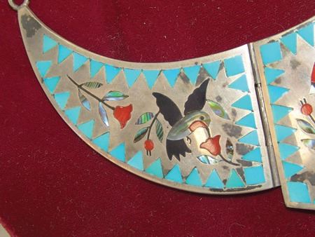Ca. 1970s-1980s, Very fine mosaic inlay three-part all-silver necklace with central cardinal figure, hummingbirds, and roses. Very good condition. Pendant 5" x 3"