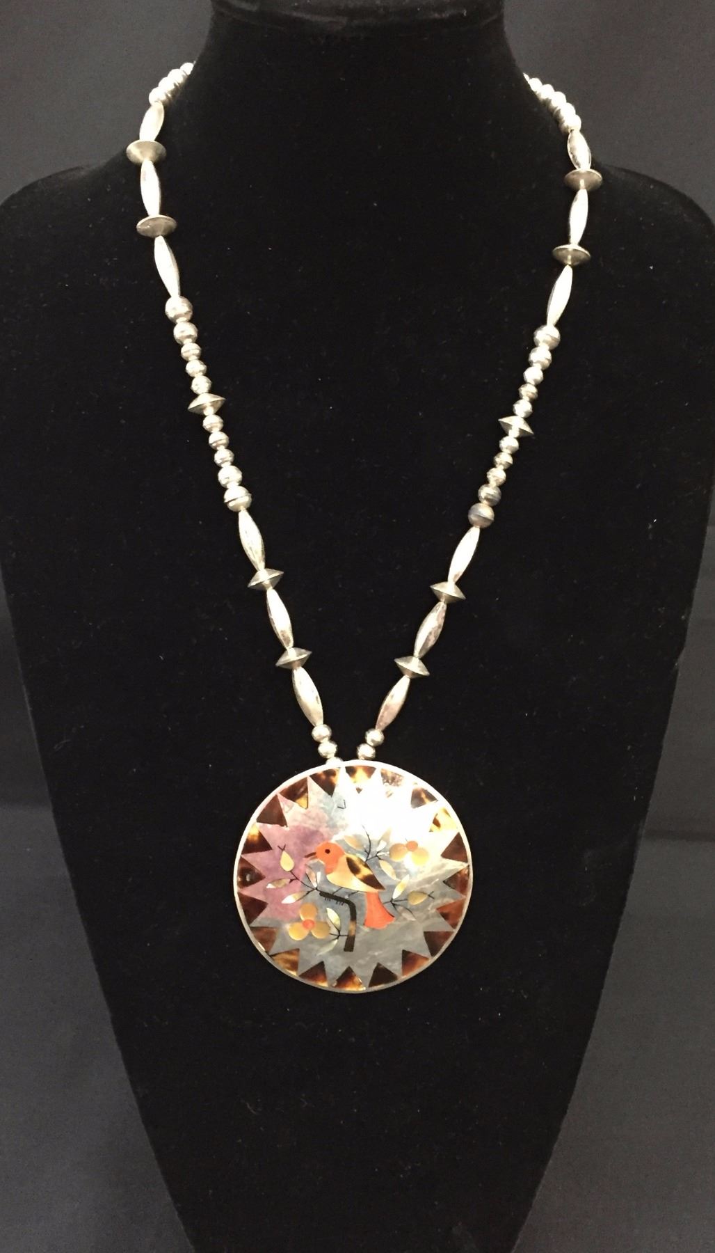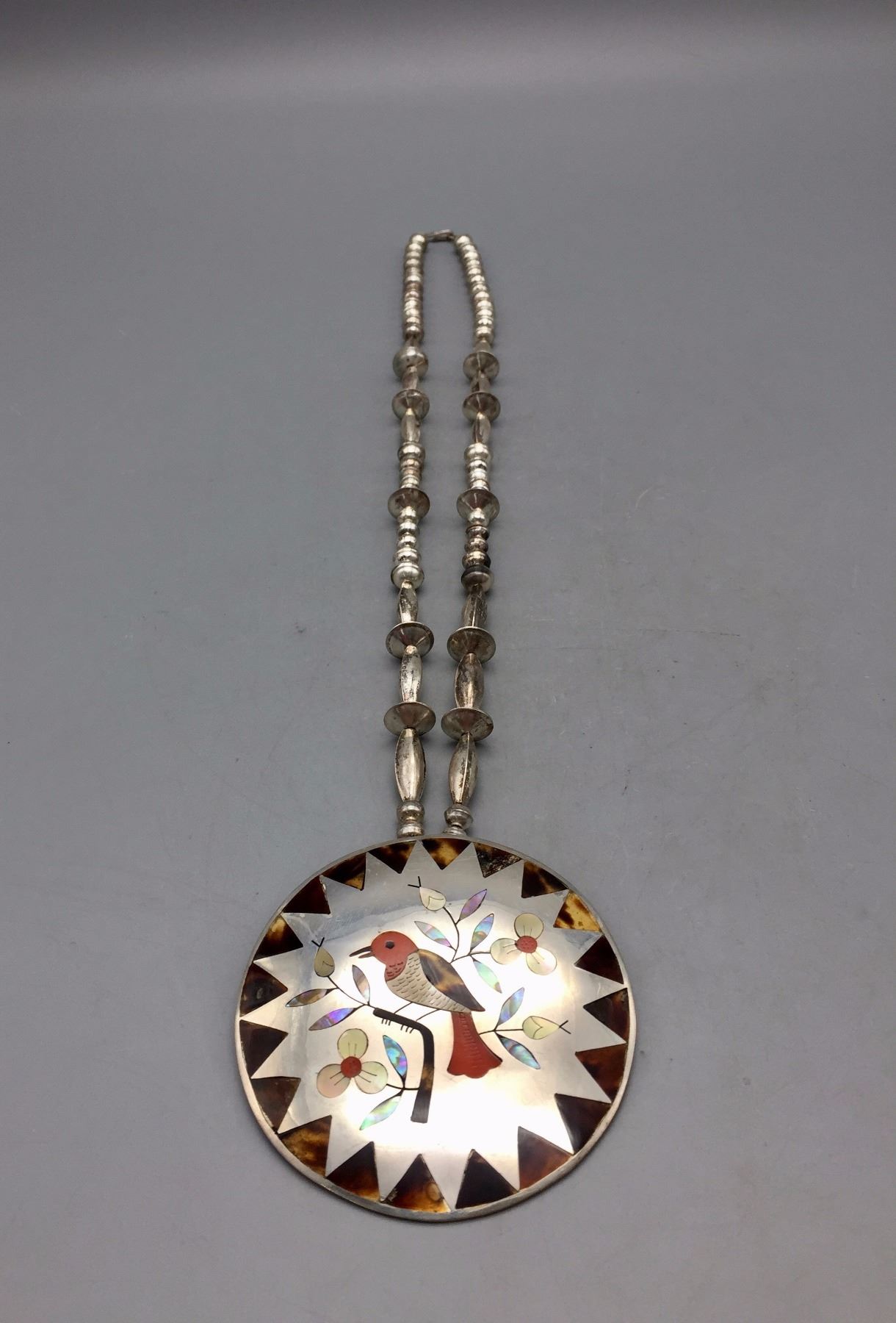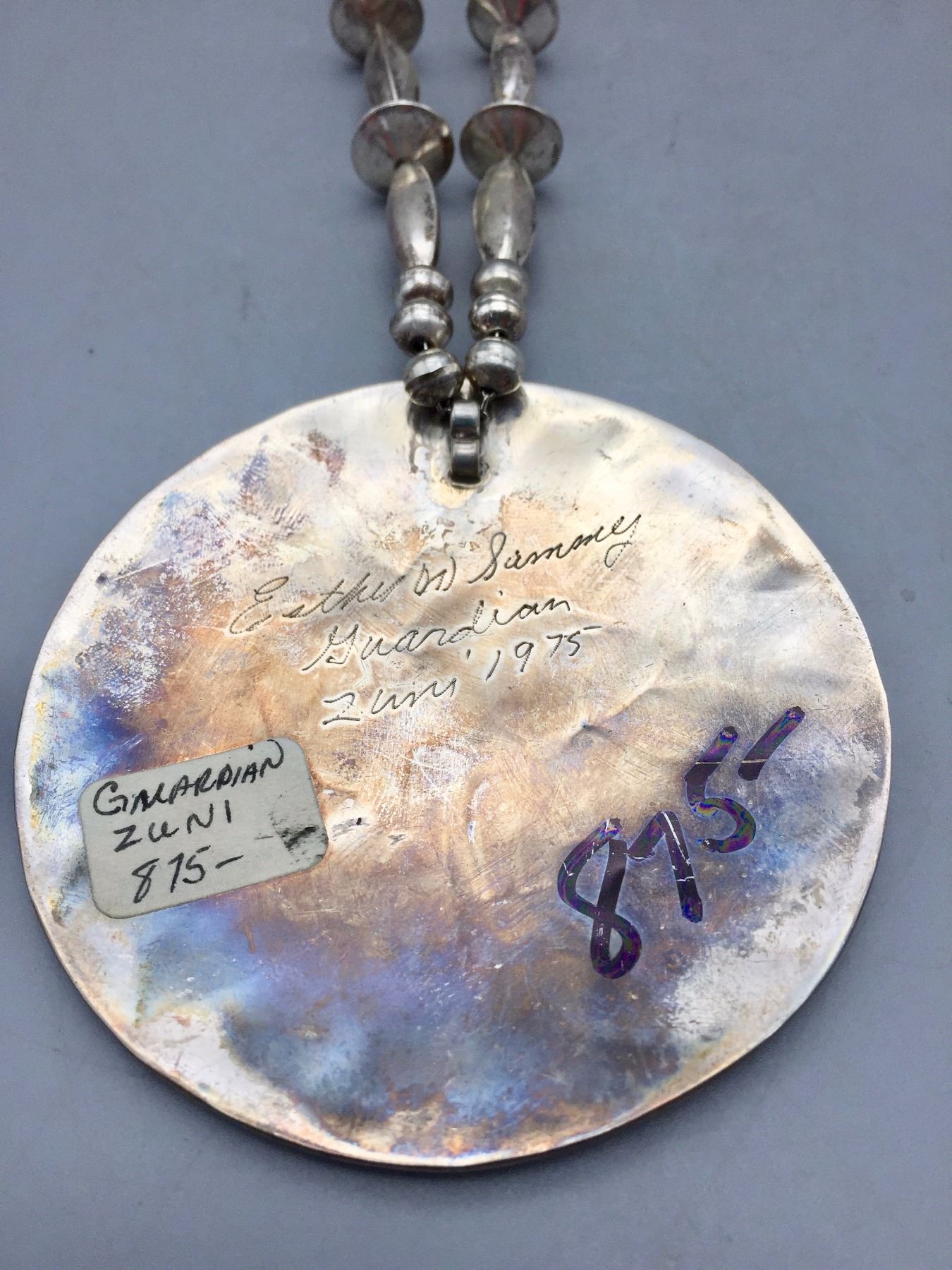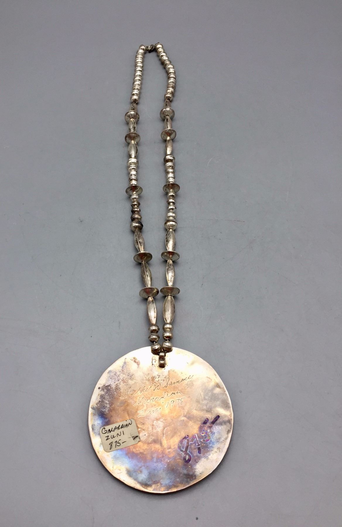 Description: Very nice Zuni multi-stone inlay necklace with a bird motif. Tested as sterling silver. New, old stock. Been in a vault since the 1970s! Maker: Esther and Sammy Guardian, Zuni. Approx. Age: 1975. Size: Fits a 24” neck. Weighs 80.3 grams. Condition: Good. Please look closely at the pictures - they are an important part of our description. Shipping: There will be a $5 handling / packaging fee for shipping this lot. The actual cost of postage will be added on top of that.