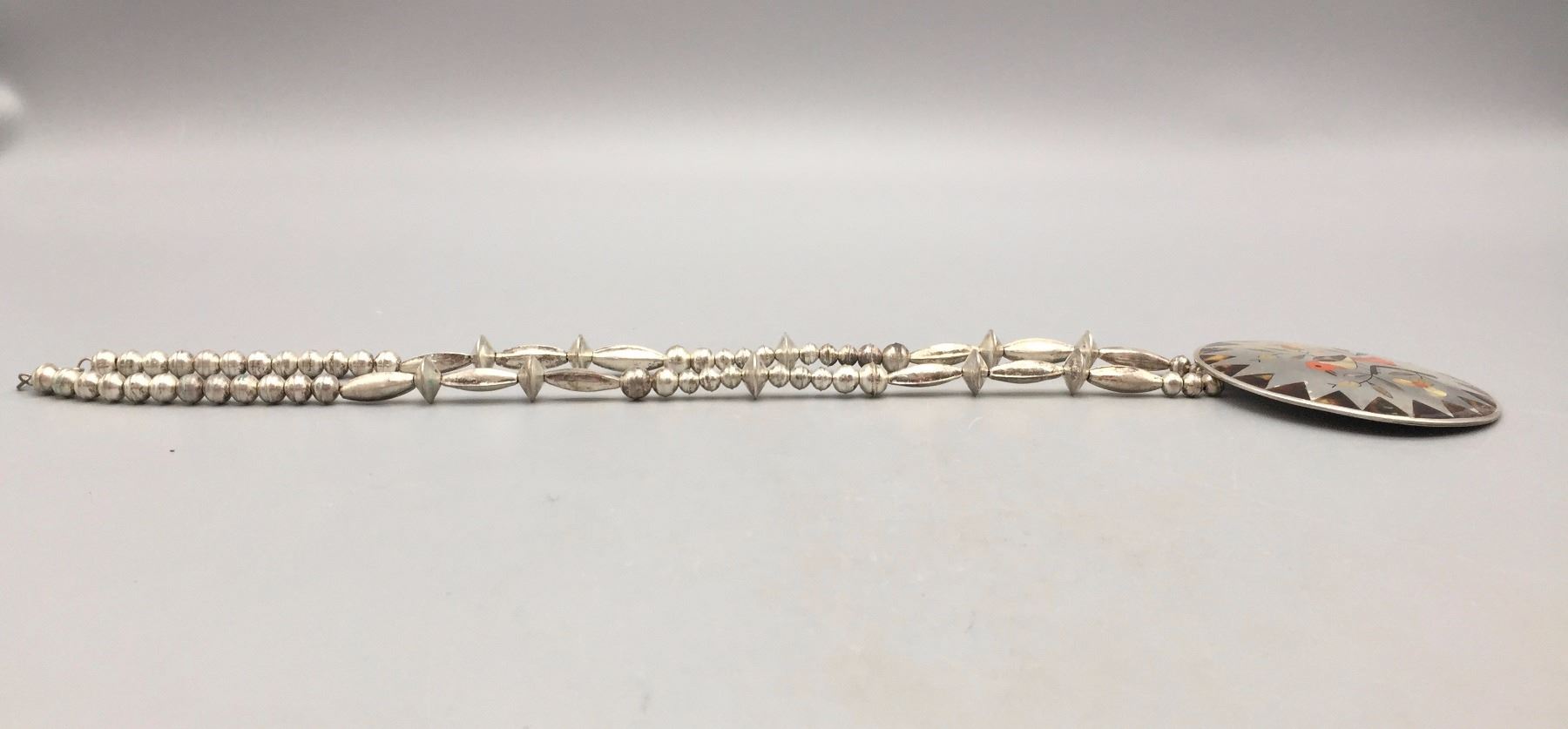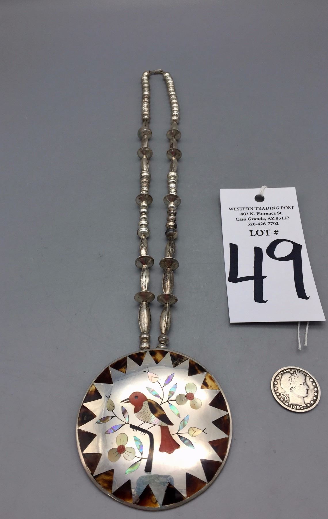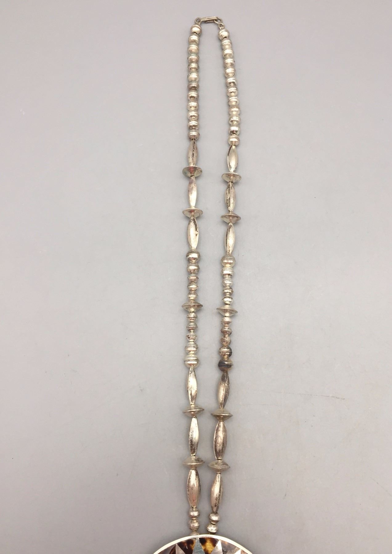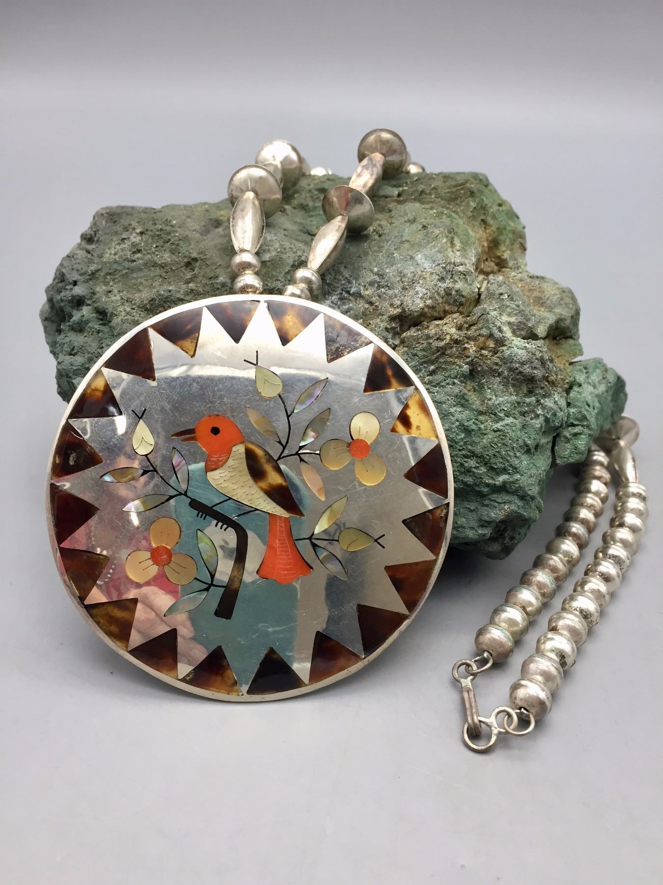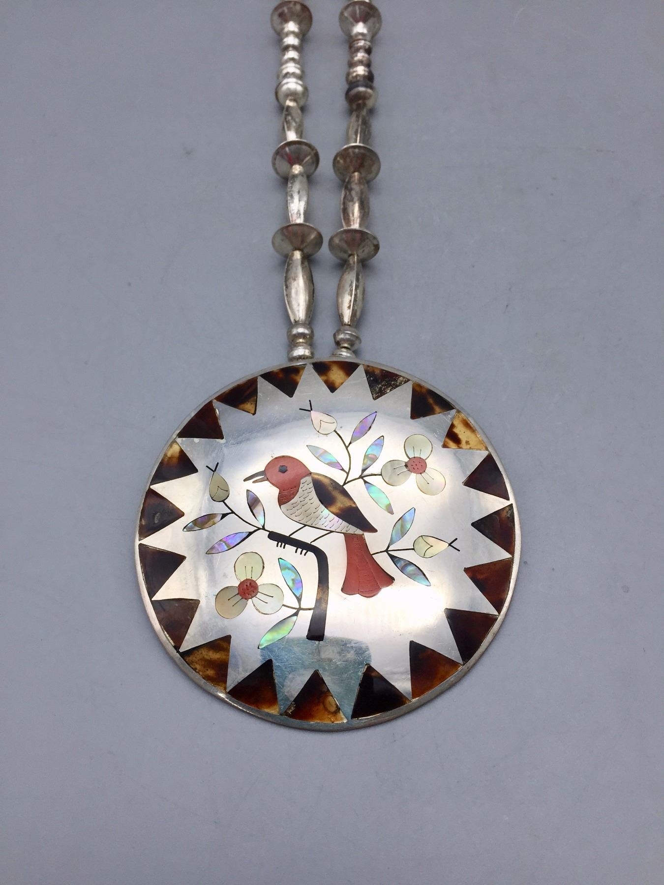 Description: Very nice Zuni multi-stone inlay necklace with a bird motif. Tested as sterling silver. New, old stock. Been in a vault since the 1970s! Maker: Esther and Sammy Guardian, Zuni. Approx. Age: 1975. Size: Fits a 24” neck. Weighs 80.3 grams. Condition: Good. Please look closely at the pictures - they are an important part of our description. Shipping: There will be a $5 handling / packaging fee for shipping this lot. The actual cost of postage will be added on top of that.