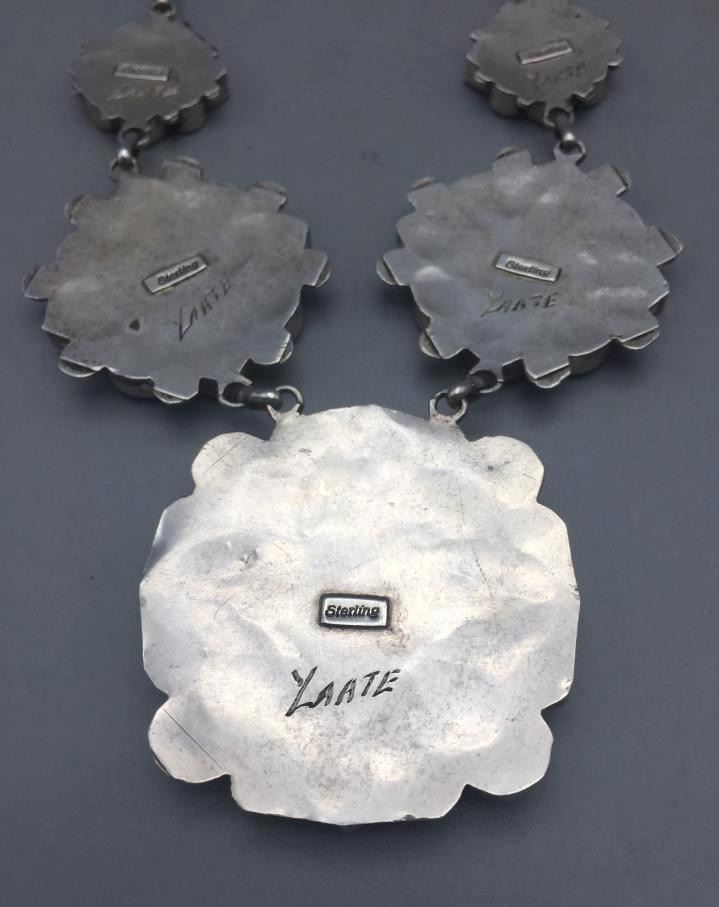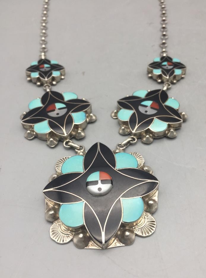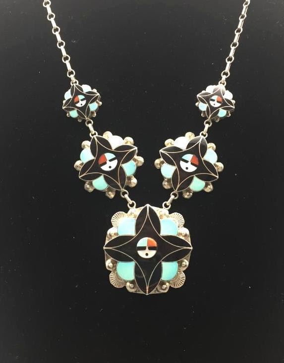 Description: Offered here is a Zuni inlay necklace. It features a Zuni Sunface design and is set with turquoise, onyx, coral, and mother of pearl. Each piece is marked sterling and YLAATE (in script). Maker: Marked, YLAATE. Approx. Age: Fairly Modern. Size: Fits a 22 inch neck. Weighs 65.1 grams. Condition: Good for its age, normal wear expected. Please look closely at the pictures - they are an important part of our description. Shipping: There will be a $5 handling / packaging fee for shipping this lot. The actual cost of postage will be added on top of that.