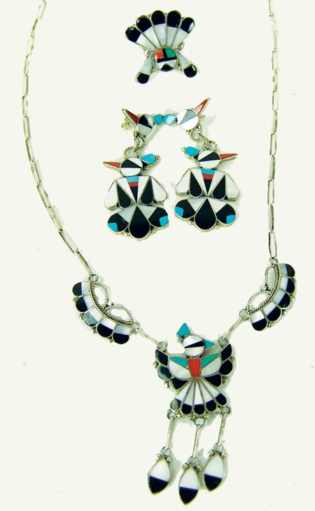 Circa Late 1900s, Very fine turquoise, coral, mother-of-pearl, and jet inlay necklace with bird pendant and wing sections with matching earrings, plus a matching Chief's head ring. All very good condition. 16" long, 5-1/2 ring size