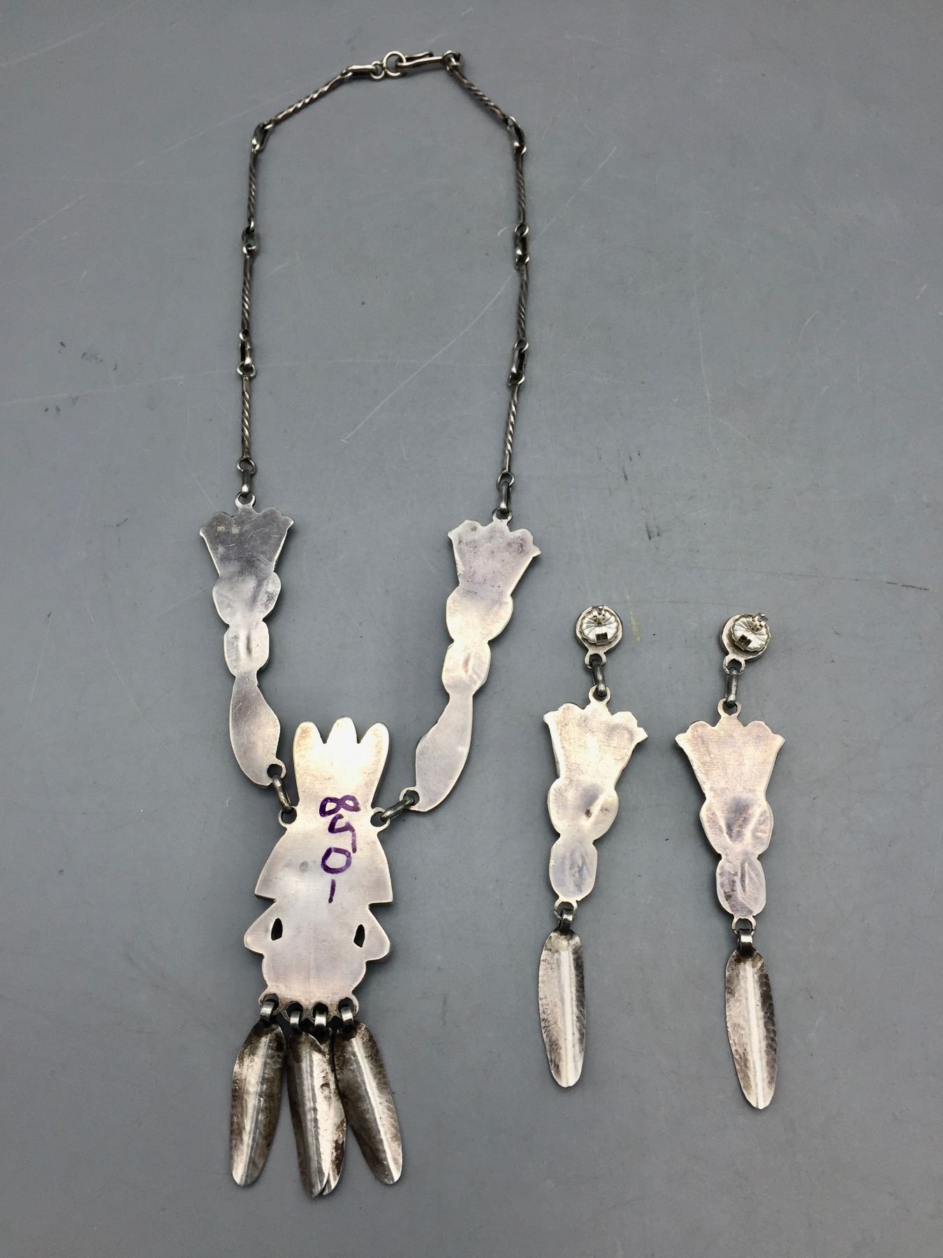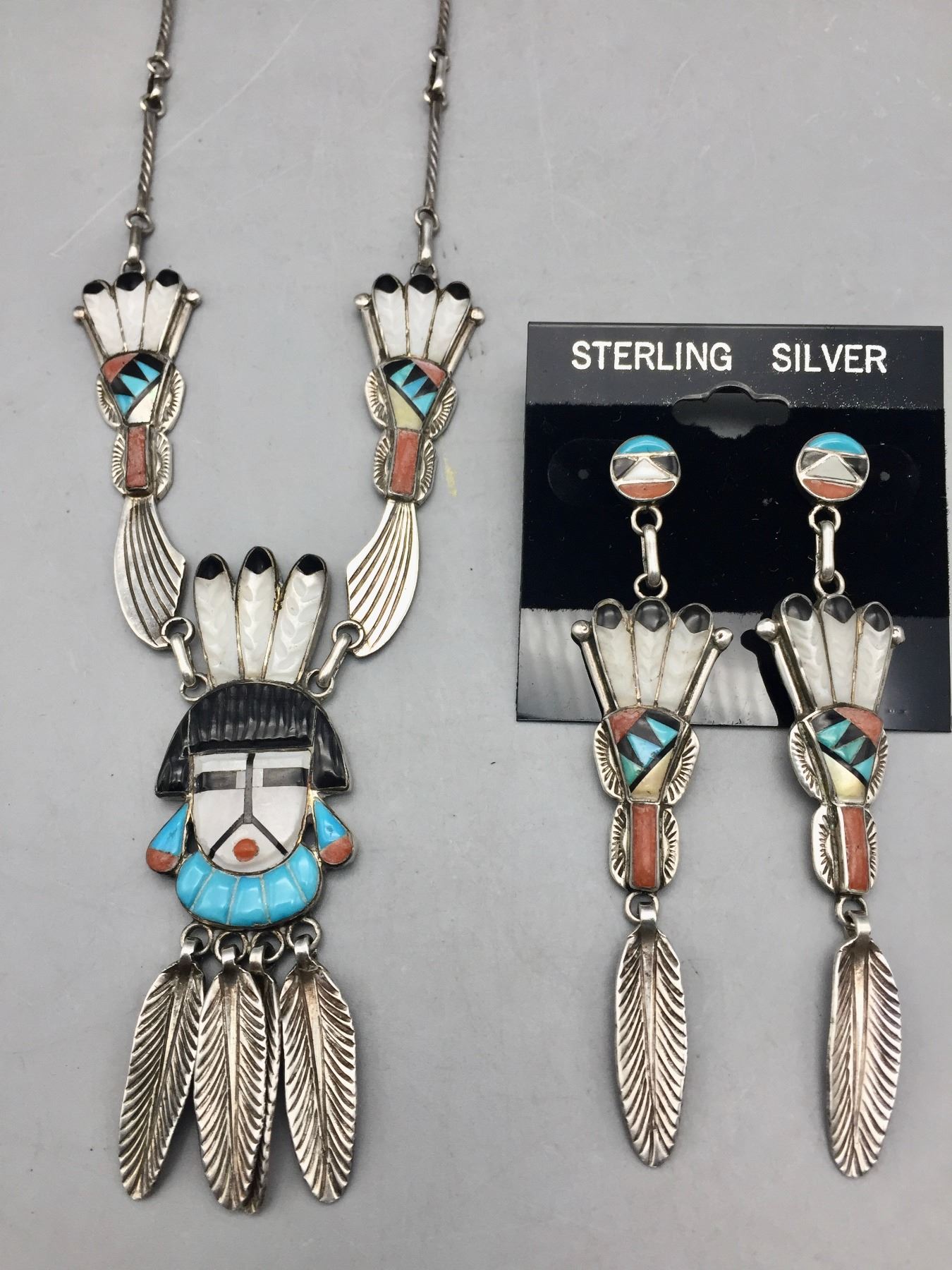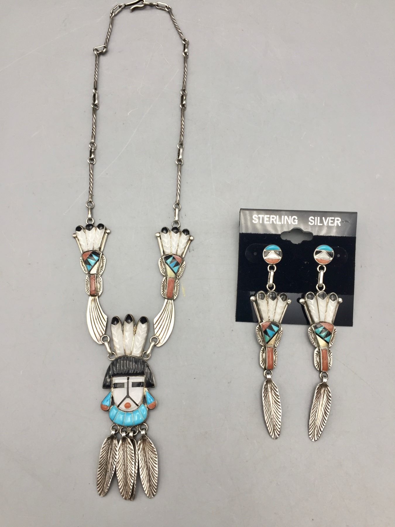 Description: Included in this lot is a Zuni inlay necklace and earrings set. They featuring turquoise, coral, black onyx, and mother of pearl, surrounded by hand crafted sterling silver. Nice set! Maker: Unknown Zuni artist. Approx. Age: Circa 1970s. Size: Fits a 15” neck. Pendant measures 1”w x 2-7/8” long. Earrings measure 3/4”w x 3-1/8” long. Combined weight of 40.1 grams. Condition: Good for their age, normal wear expected. Please look closely at the pictures - they are an important part of our description. Shipping: There will be a $5 handling / packaging fee for shipping this lot. The actual cost of postage will be added on top of that.