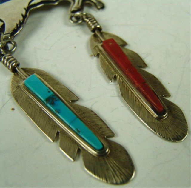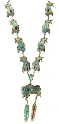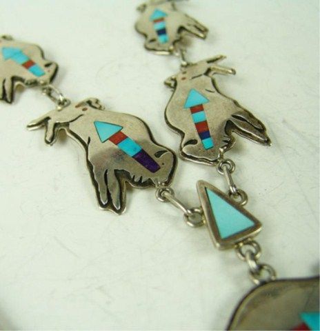 Zuni Inlay Necklace, Zuni Inlay Necklace Unique original design silver overlay section necklace with buffalo figures, the larger pendant with feather drops. Each with a heart line inlay arrow. Signed "SJG89." Very good condition, light use. Circa: Ca. 1989 Size: 25", pendant 5-1/2" x 2-1/2"