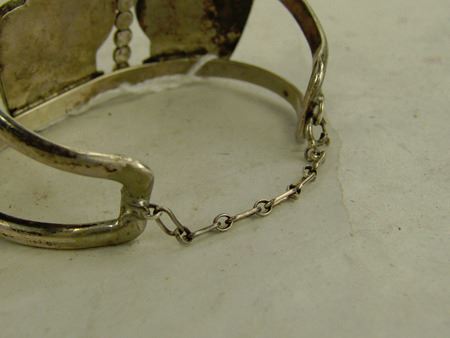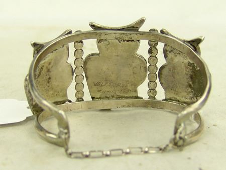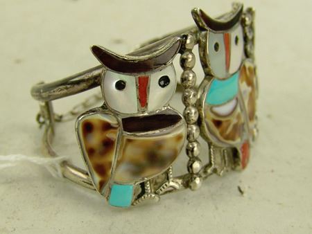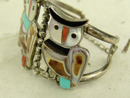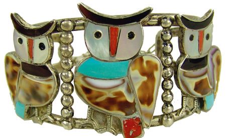 Ca. 1970s, Classic all-silver bracelet with three different owl figures done in traditional channel inlay style. Very good condition. 5-3/8" + 1-3/8" x 1-3/4"