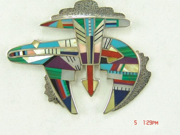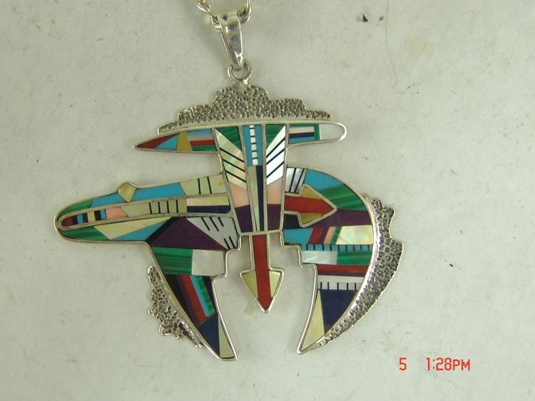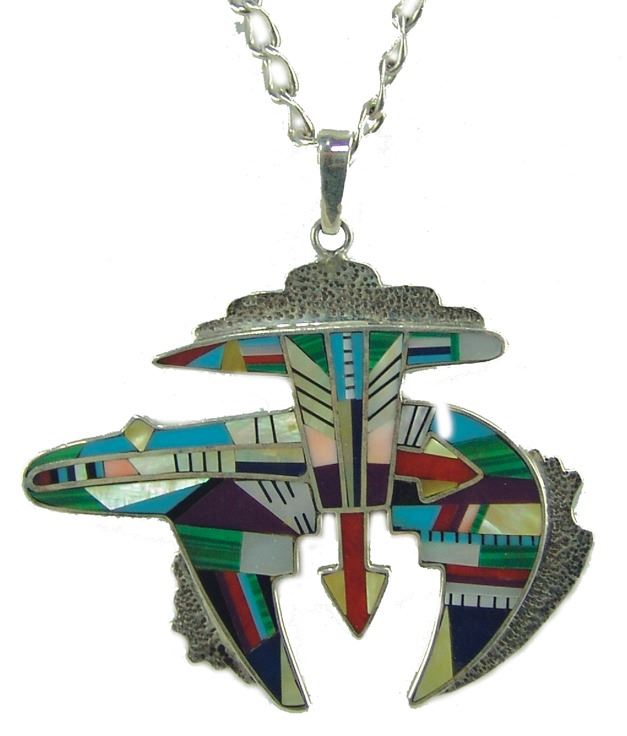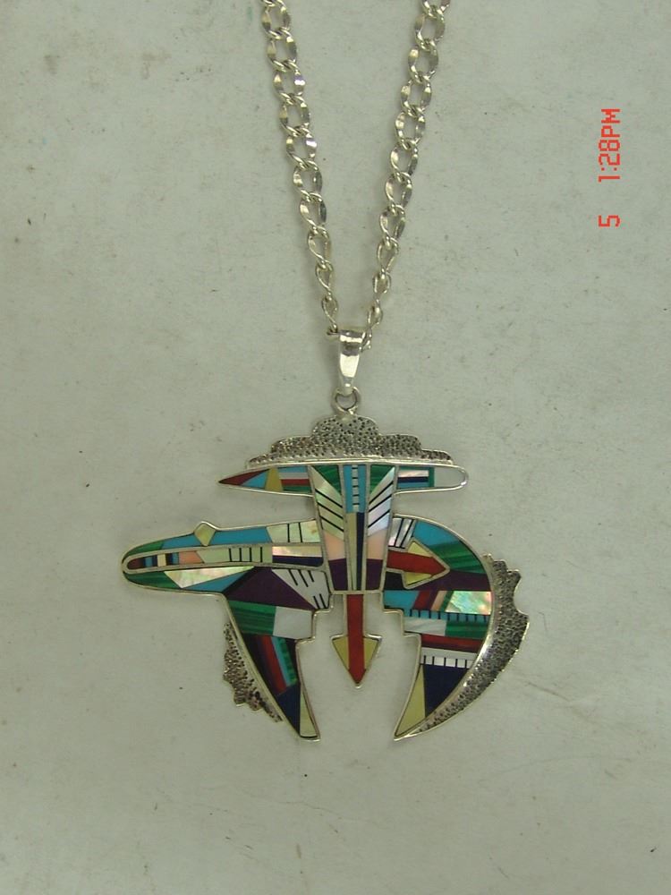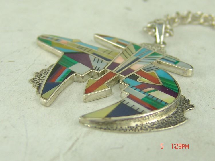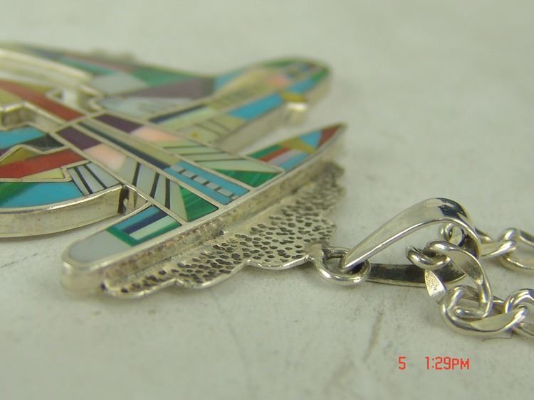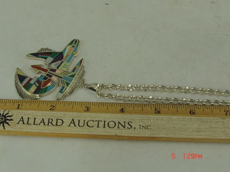 Very fine all-silver heartline bear pendant with traditional channel and mosaic inlay and with silver link chain. Excellent condition.,Late 1900s,26" plus pendant
