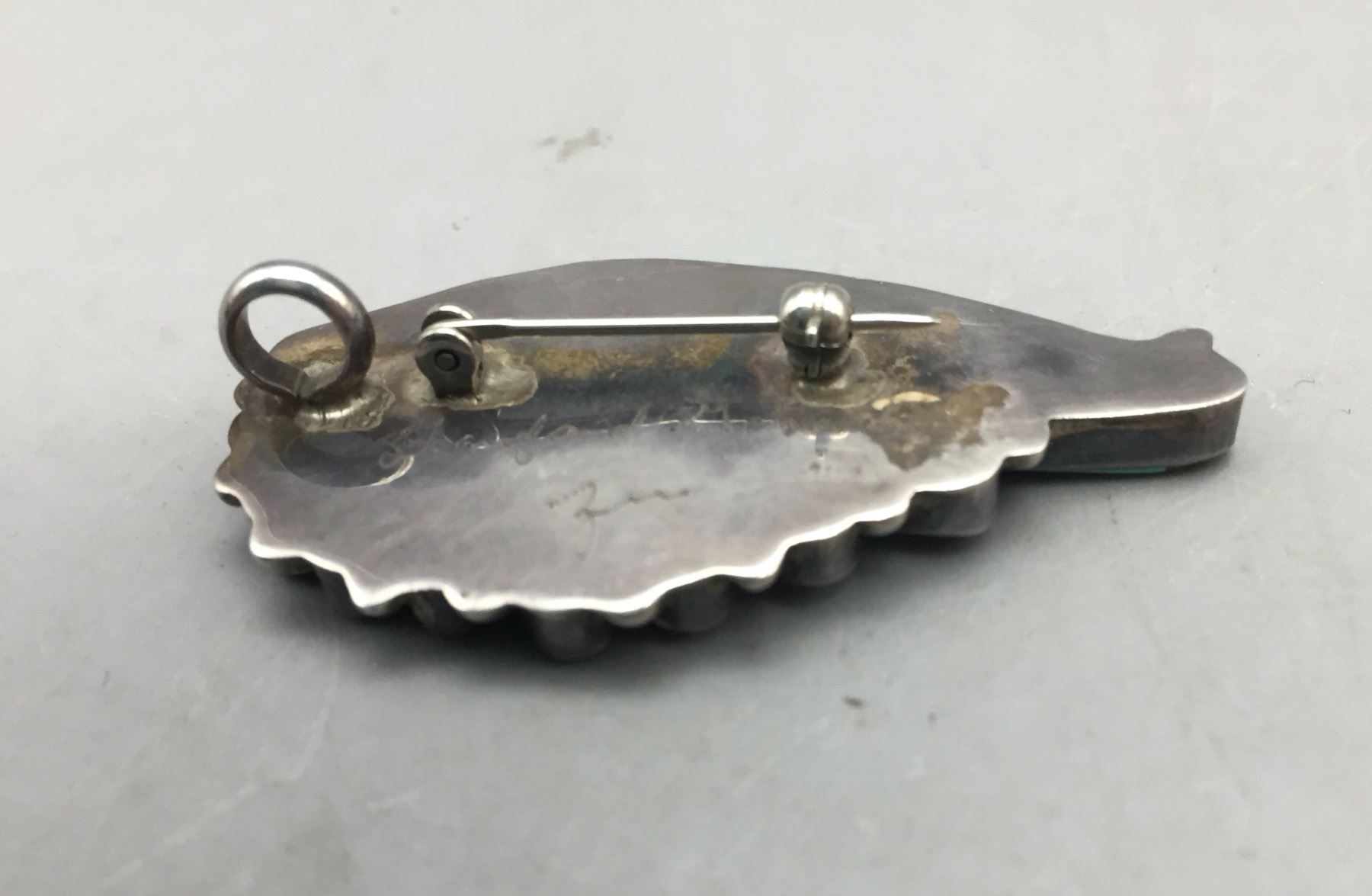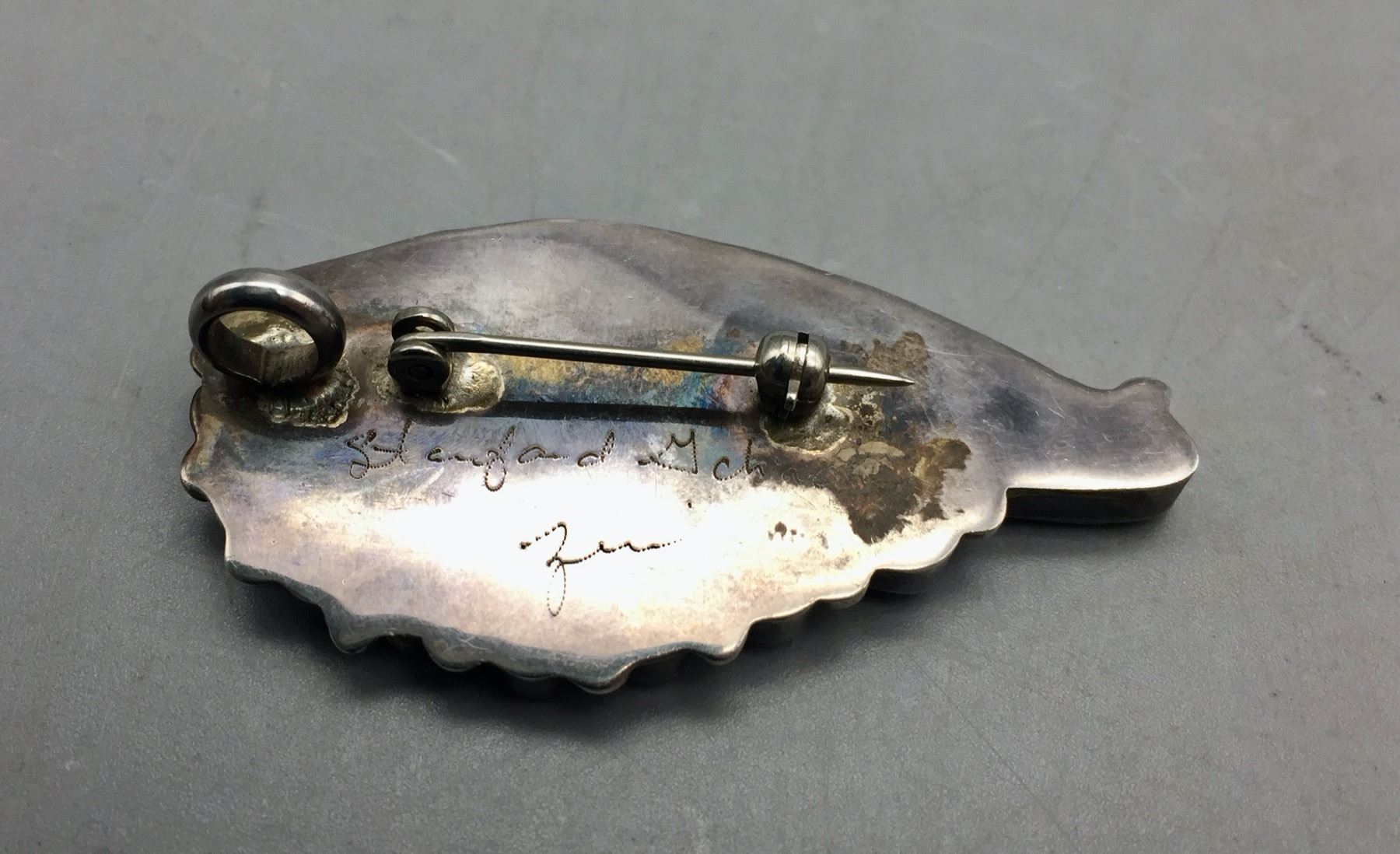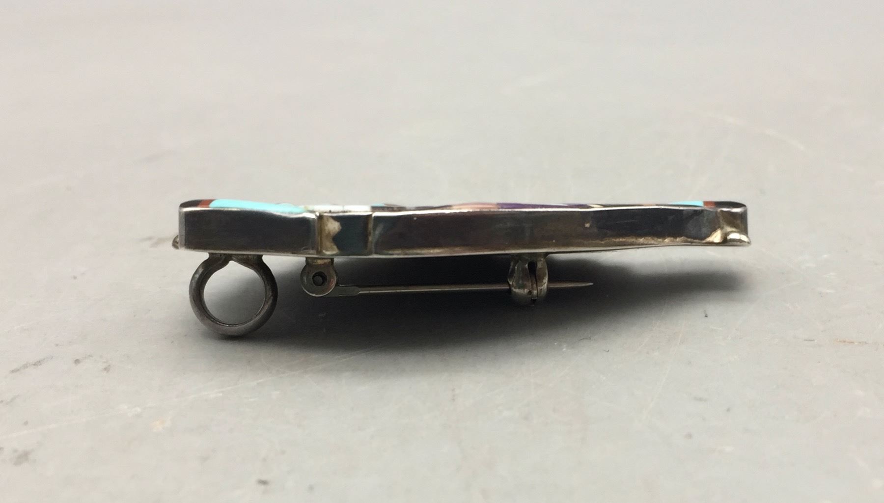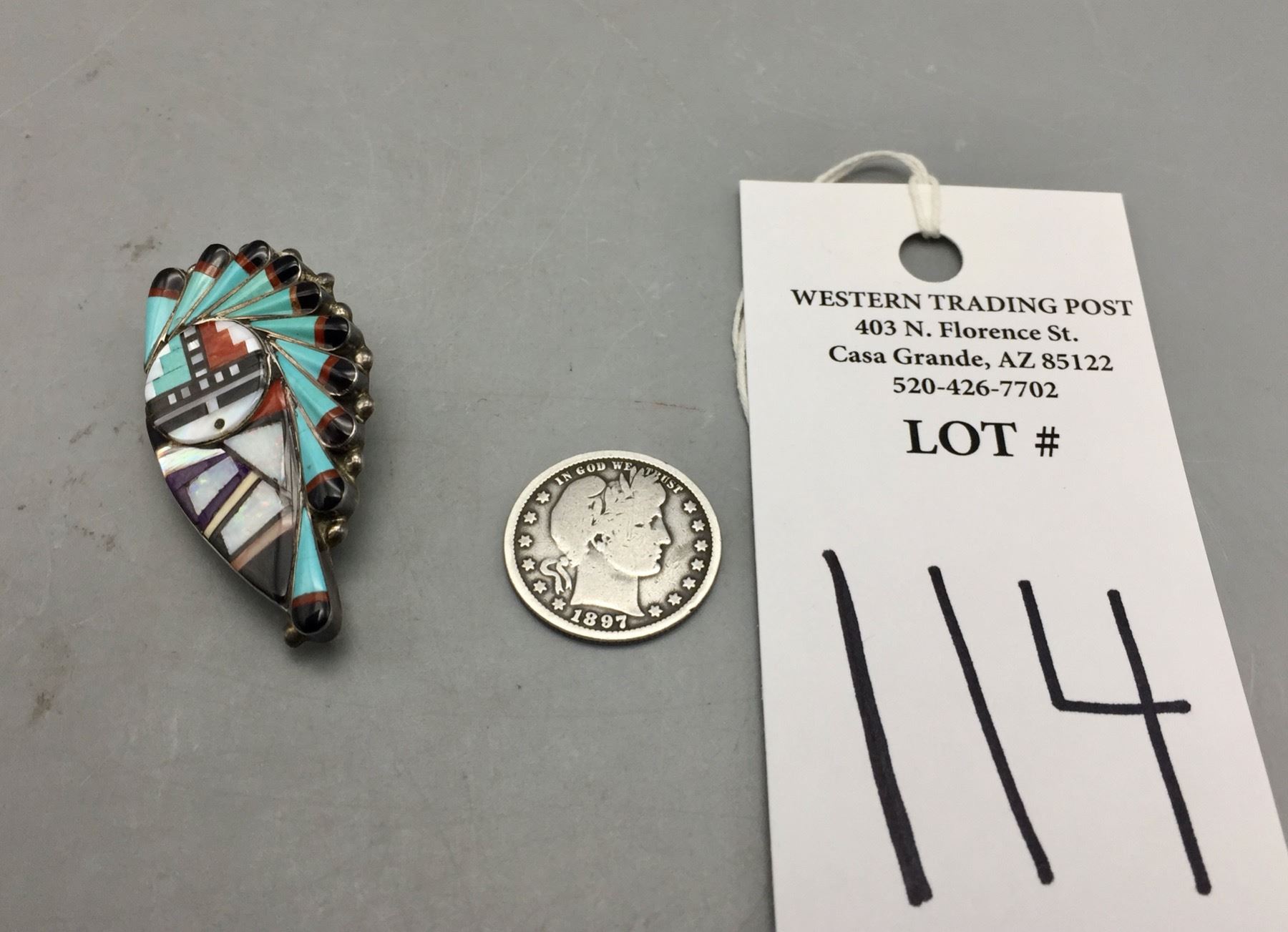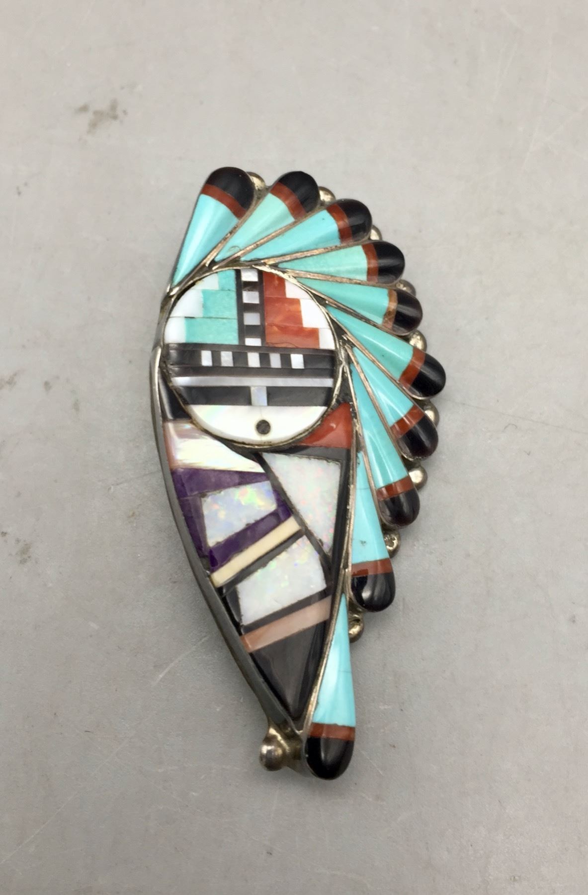 Description: Offered for sale in this lot is this gorgeous Zuni inlay pin/pendant. This is a well crafted piece set with shell, onyx, coral, turquoise and mother of pearl in sterling silver. Maker: Stanford Gchachu, Zuni. Approx. Age: Modern. Size: Measures 2 inches long x 1 inch wide. Weighs 11.8 grams. Condition: Good for its age, normal wear expected. Please look closely at the pictures - they are an important part of our description. Shipping: There will be a $5 handling, packaging fee for shipping this lot. The actual cost of postage will be added on top of that.