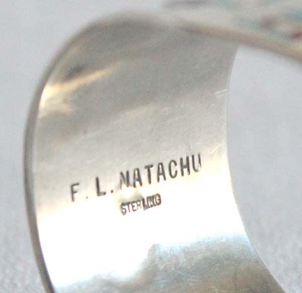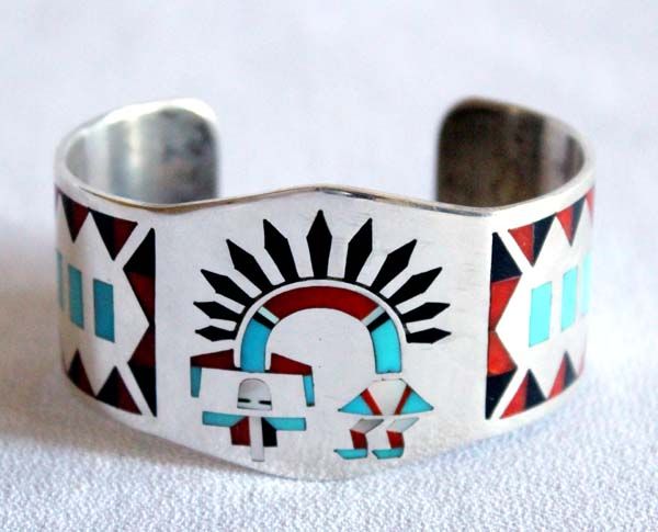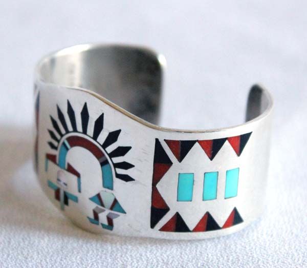 Zuni Inlay Rainbow Man Bracelet by Fred and Lolita Natachu, inside measures 6'' which includes opening x 1.25''W and is not adjustable, here is a beautiful piece of work by famous Zuni inlay artists Fred and Lolita Natachu. The cuff features the ''Rainbow Man'', a supreme kachina representing harmony and beauty. exquisite inlay work of coral, jet, turquoise, and mother of pearl, hallmarked F.L. Natachu and stamped sterling, Artist Bio: Lolita is the daughter of Jacob Haloo. Her sisters, Dolly Banteah, Rolanda Haloo and Nancy Lasconsello, are also recognized Zuni artisans. Fred and Lolita stamp their work with F. L. NATACHU. Definitely a work of art!