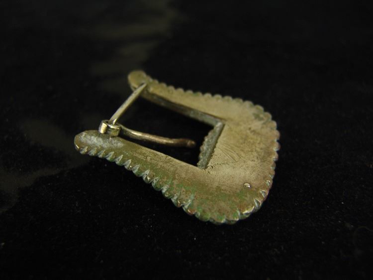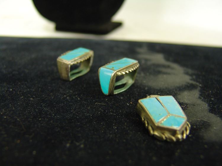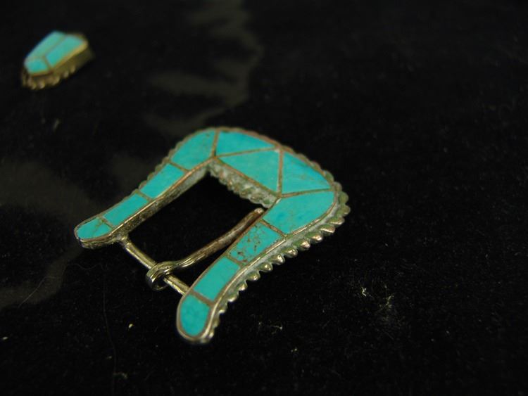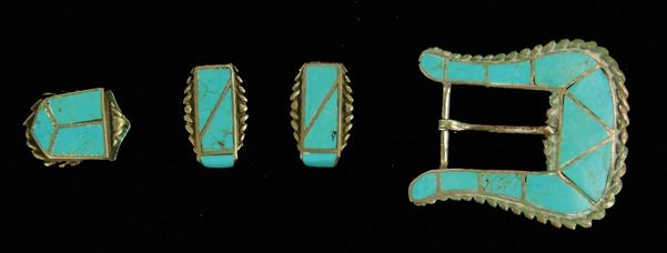Wonderful early Santa Fe style Zuni inlay turquoise u-shaped buckle with matching keepers (2) and tip. Very good used condition.,Ca. 1940s,Fits 3/4" belt