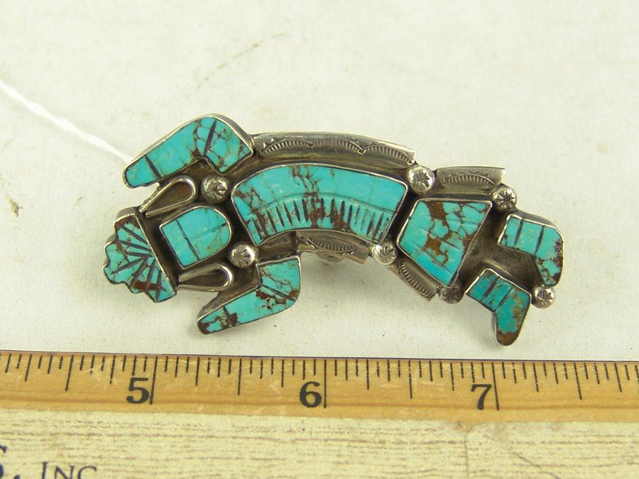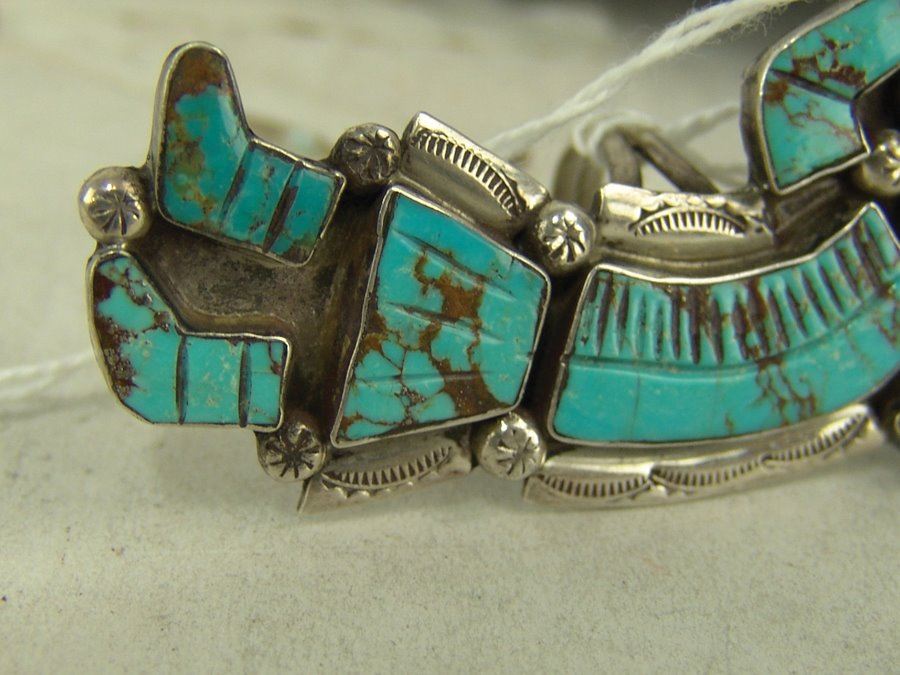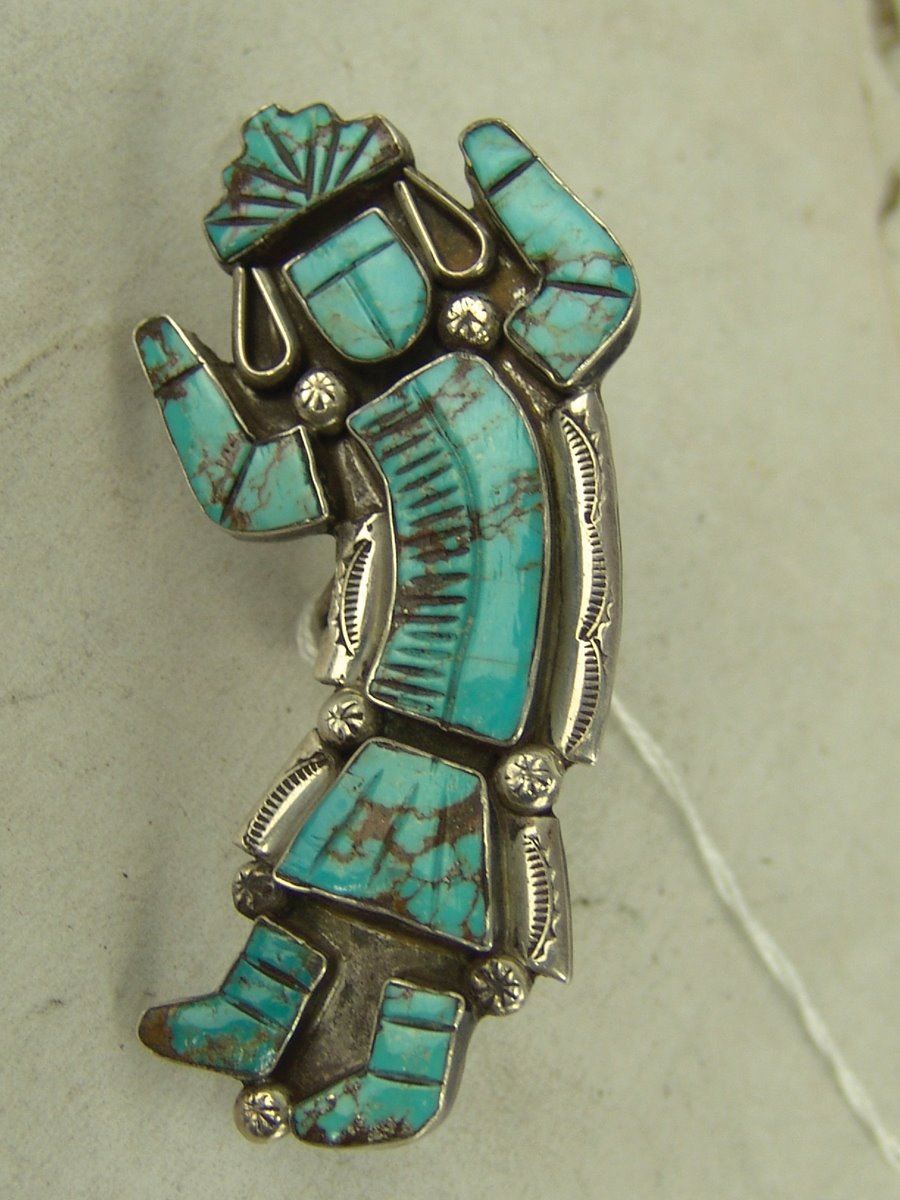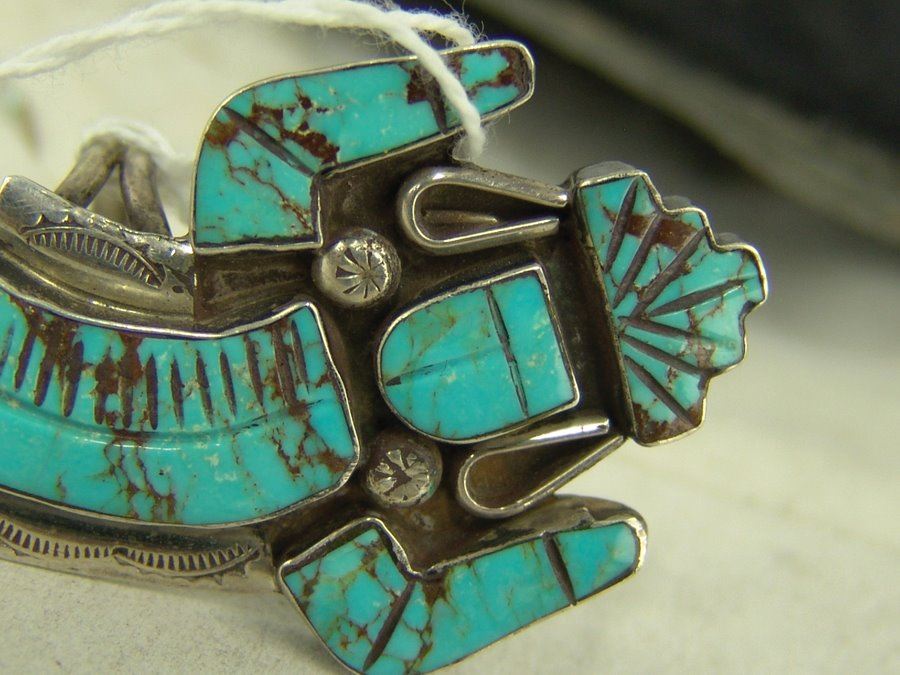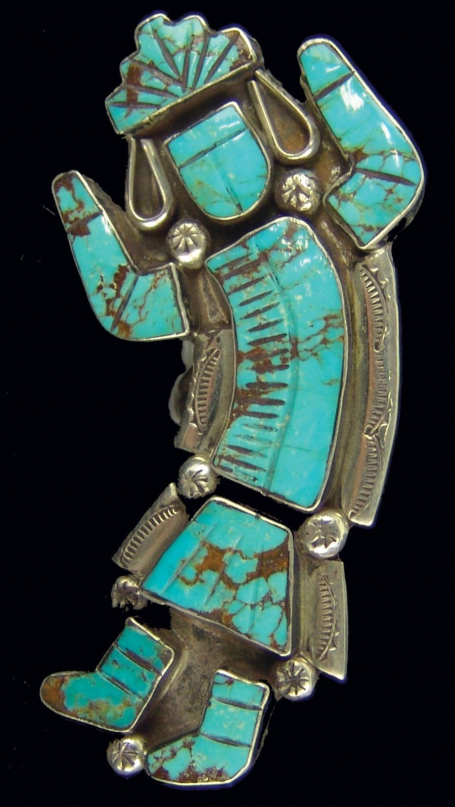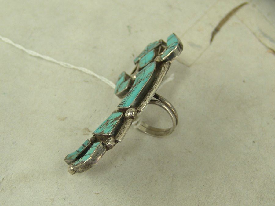 Rare vintage Zuni inlay turquoise and silver rainbow dancer ring with finely carved details on the stones. Very good condition. Great patina.,Mid. 1900s,Size 7, 2 3/4" long