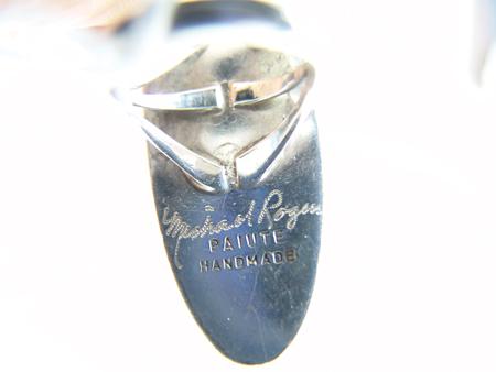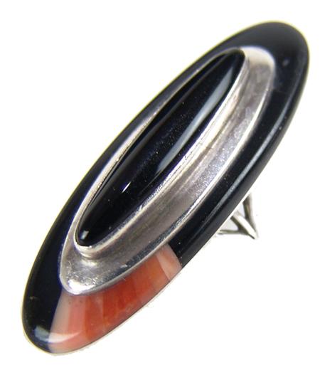 Circa 1990s, Fine original design ring with exposed inlays of jet and spondulus shell. Very good condition. (Rogers is actually Paiute.) Size 7 From the Towne Collection.