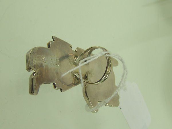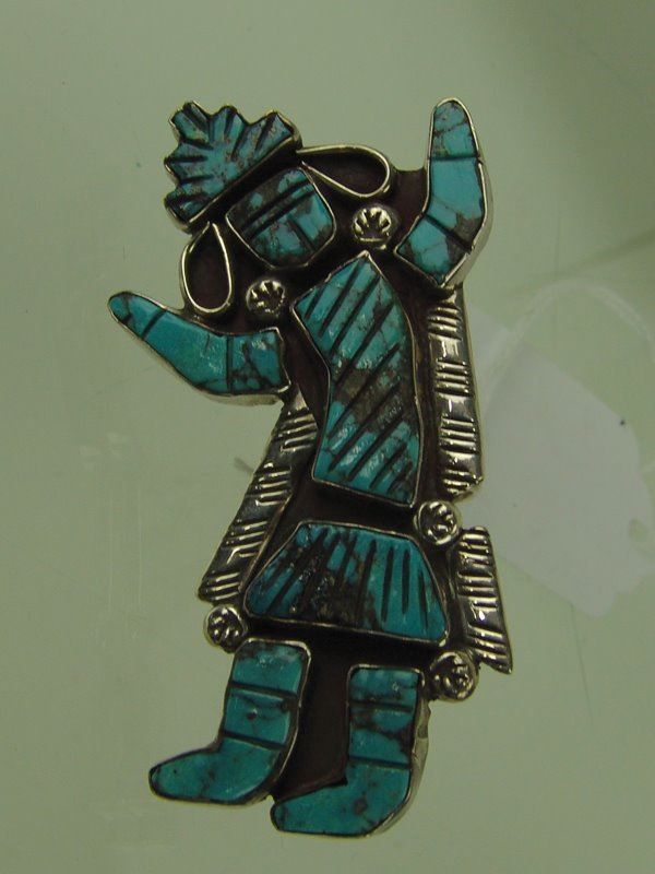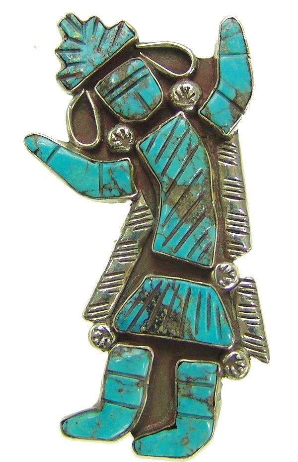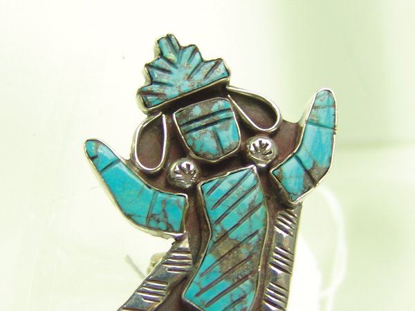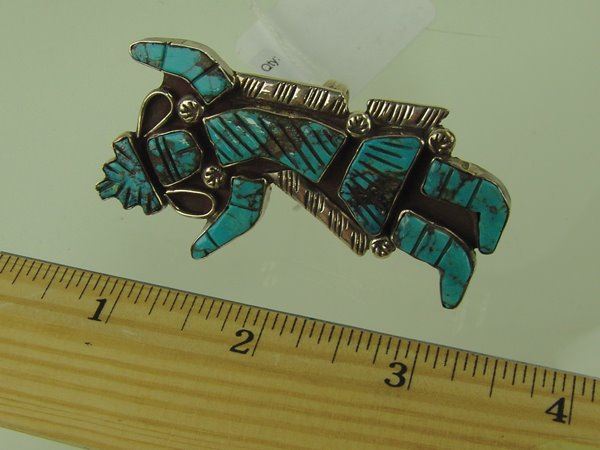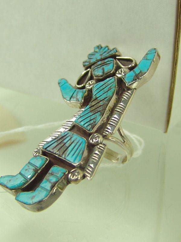 Ca. 1980s 9 Larger sized, turquoise and silver ring done in traditional channel inlay style and featuring the famous devil dancer. Very good condition.