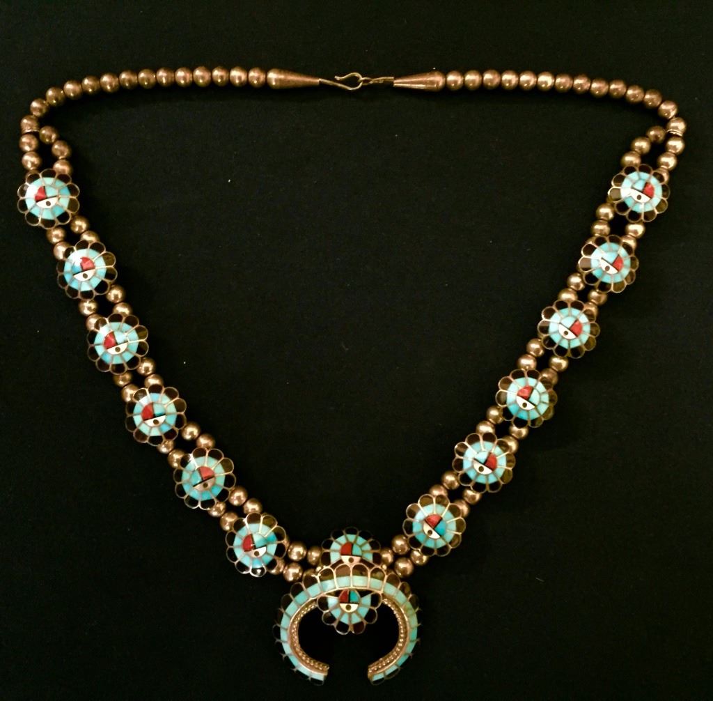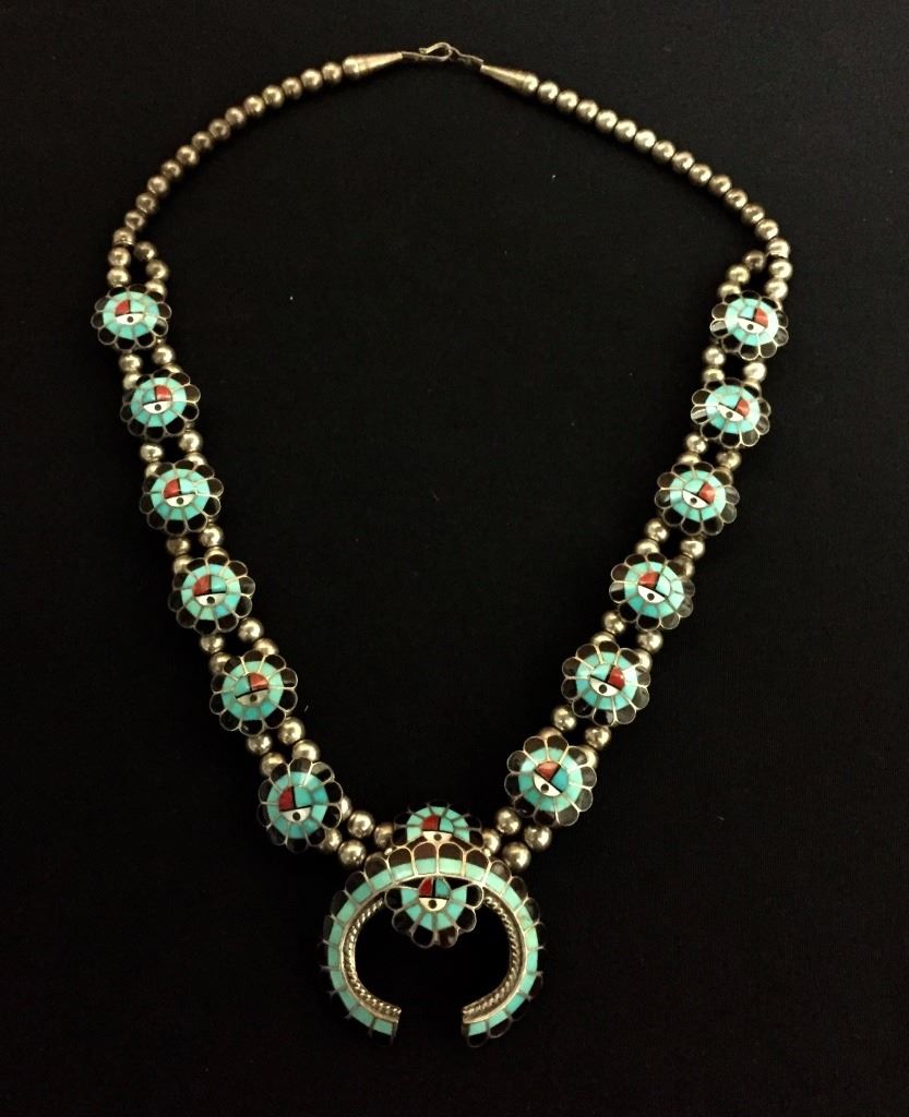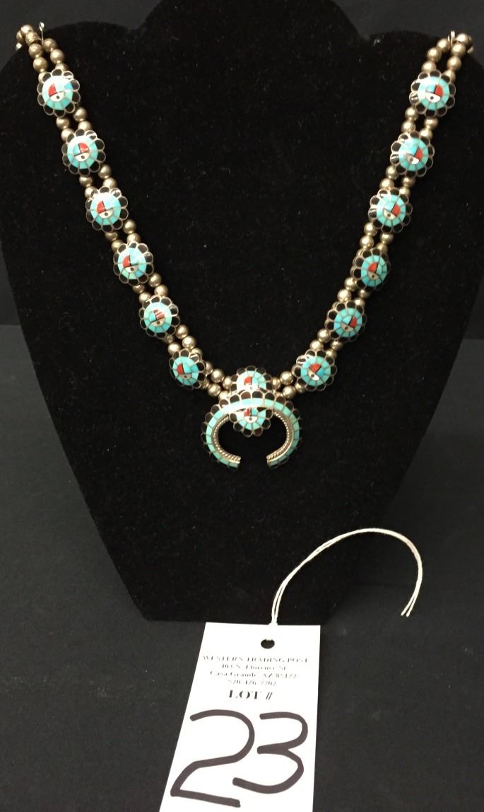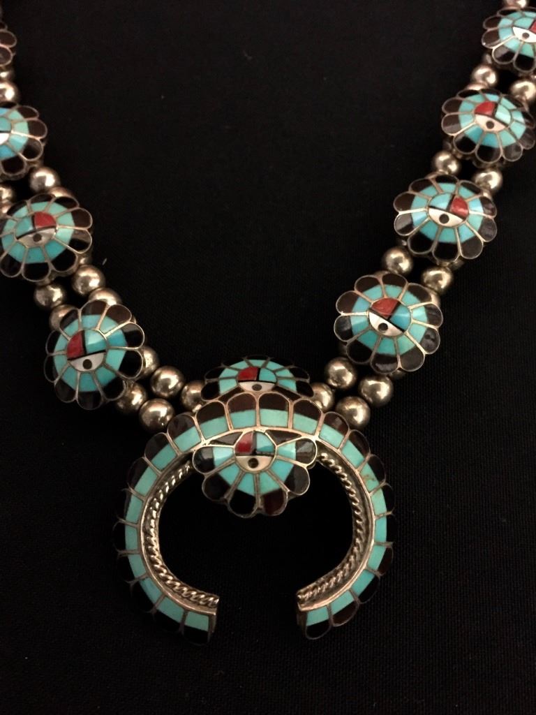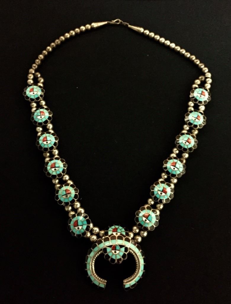 Made by Burdian Soseeah (Zuni), this inlay necklace fits approximately 20” around the neck. Signed and tested as sterling. It weighs approximately 75 g. Good condition. Please look closely at the pics as they are an important part of our description. Shipping: There will be a $5 handling / packaging fee for shipping this lot. The actual cost of postage will be added on top of that.