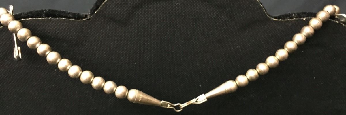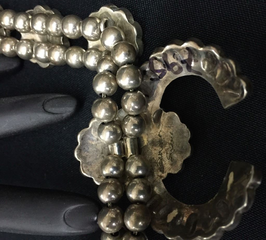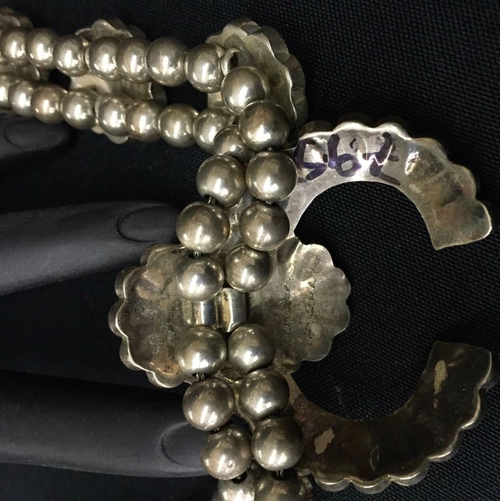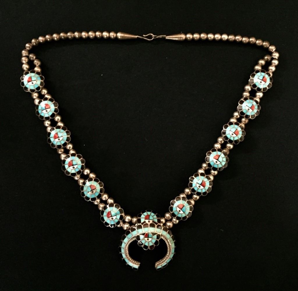 Made by Burdian Soseeah (Zuni), this inlay necklace fits approximately 20” around the neck. Signed and tested as sterling. It weighs approximately 75 g. Good condition. Please look closely at the pics as they are an important part of our description. Shipping: There will be a $5 handling / packaging fee for shipping this lot. The actual cost of postage will be added on top of that.