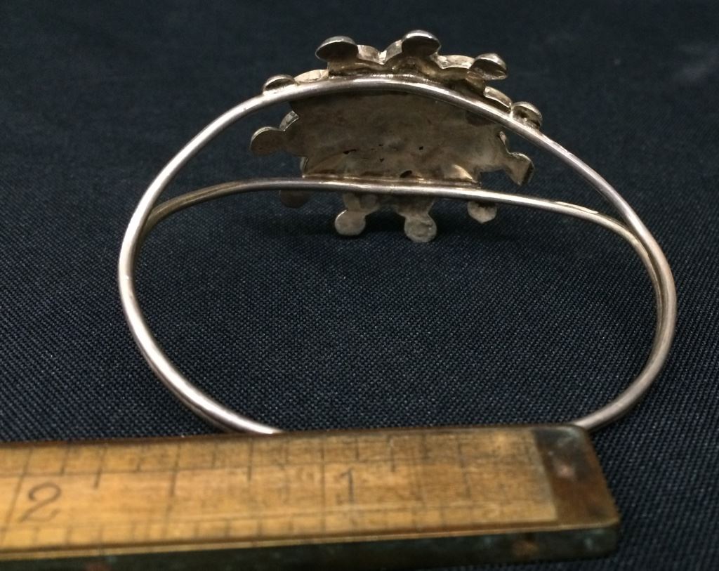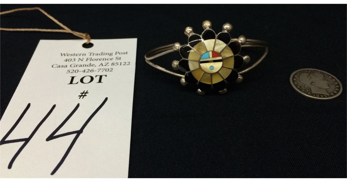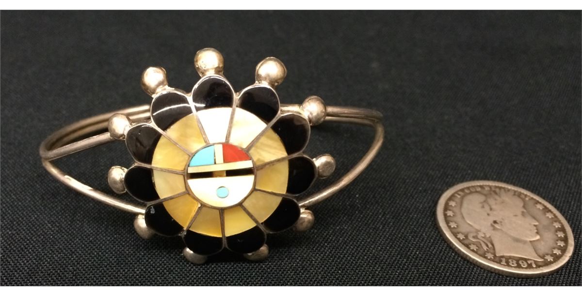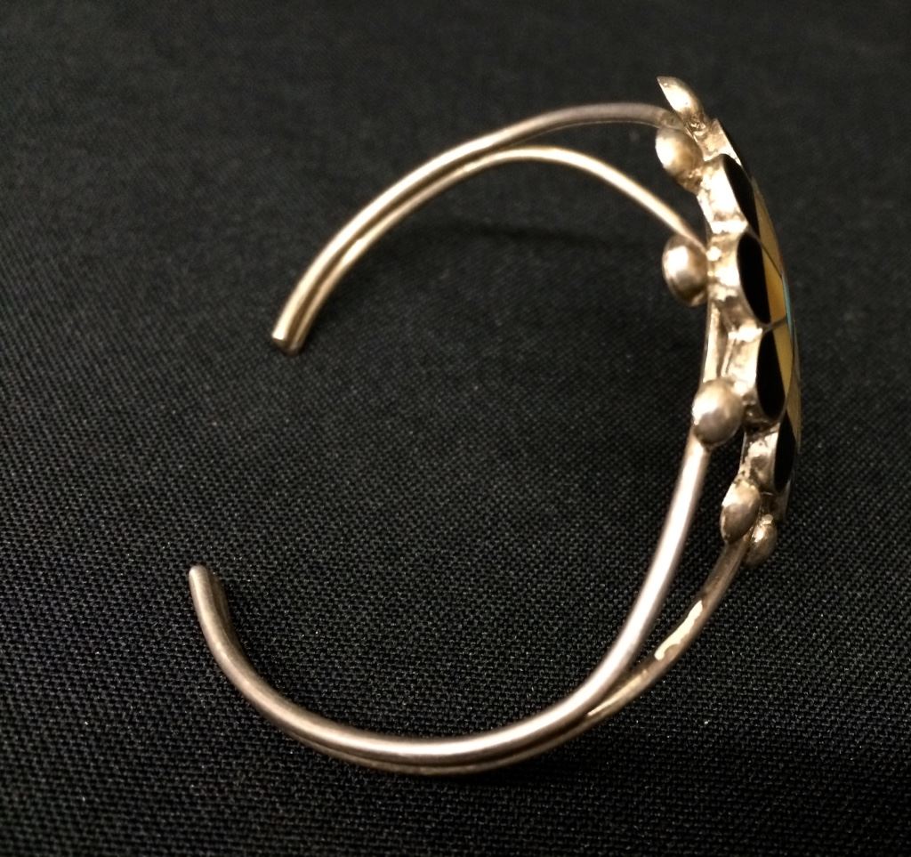 This sterling and inlay bracelet is by Pauline Lonjose, Zuni (signed). Measures 5.25” inside plus there is a 1” opening. It’s just under 1.5” wide and weighs 13g. Good condition. Shipping: There will be a $5 handling / packaging fee for shipping this lot. The actual cost of postage will be added on top of that.