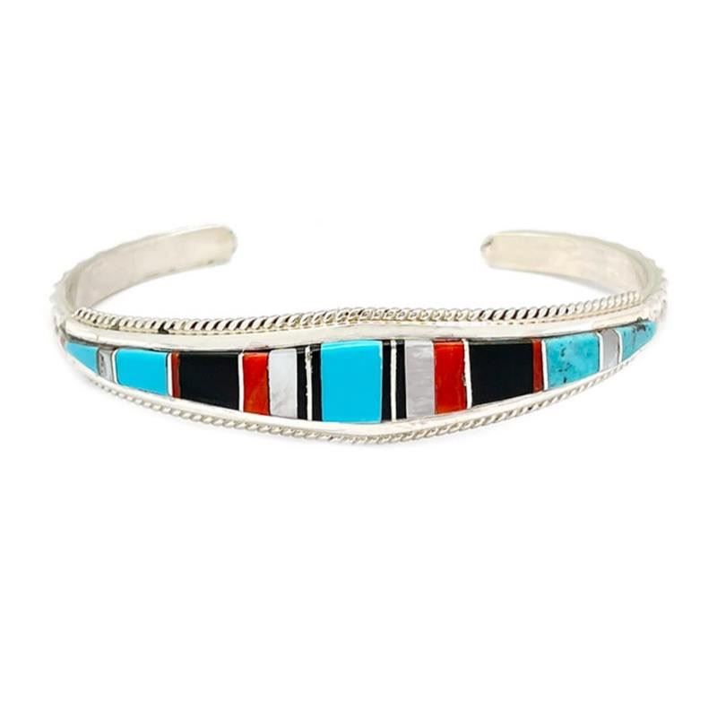 Fab Native American Zuni sterling silver and turquoise, coral, mother of pearl, and jet inlay cuff bracelet by Diedra Luna. Sterling silver inlaid bracelet with traditional Zuni inlay design. It measures about 1/2" in the center and tapers down to 1/4". There is twist wire on the edge of the plain silver border. Zuni hand made and inlaid by Diedra Panteah Luna. Hallmarked on the back. The inside circumference is about 6.5" including gap, the gap is 1 1/4" and the cuff can be carefully adjusted. Great to stack with other bracelets or wear by itself. FREE SHIPPING ON ALL JEWELRY ORDERS WITHIN THE US!