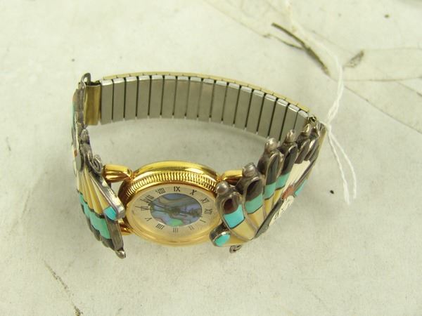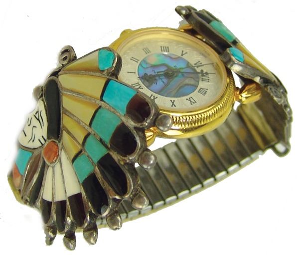 Outstanding, vintage, all silver and raised channel inlay watch tips done in the profile of an Indian chief. Very good condition, nice patina.Ca.1960s - 1970s6-1/4" x 1-1/2"