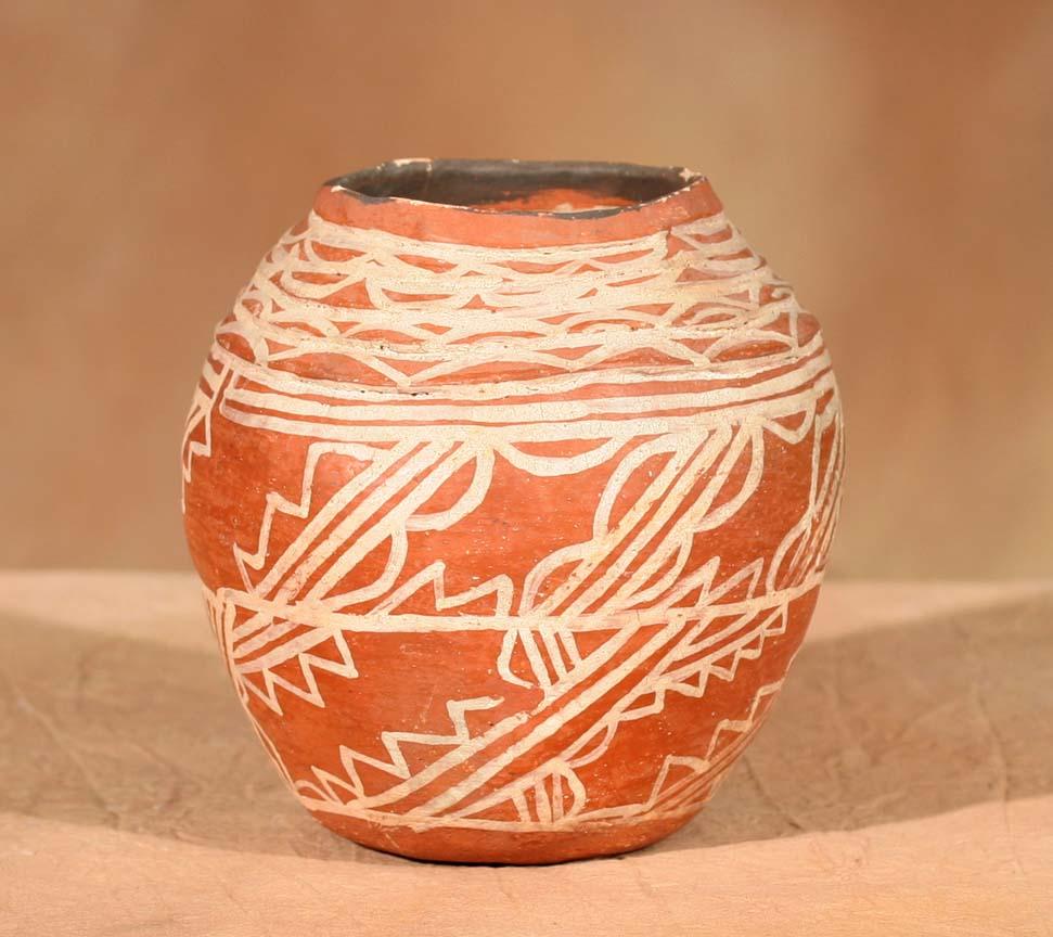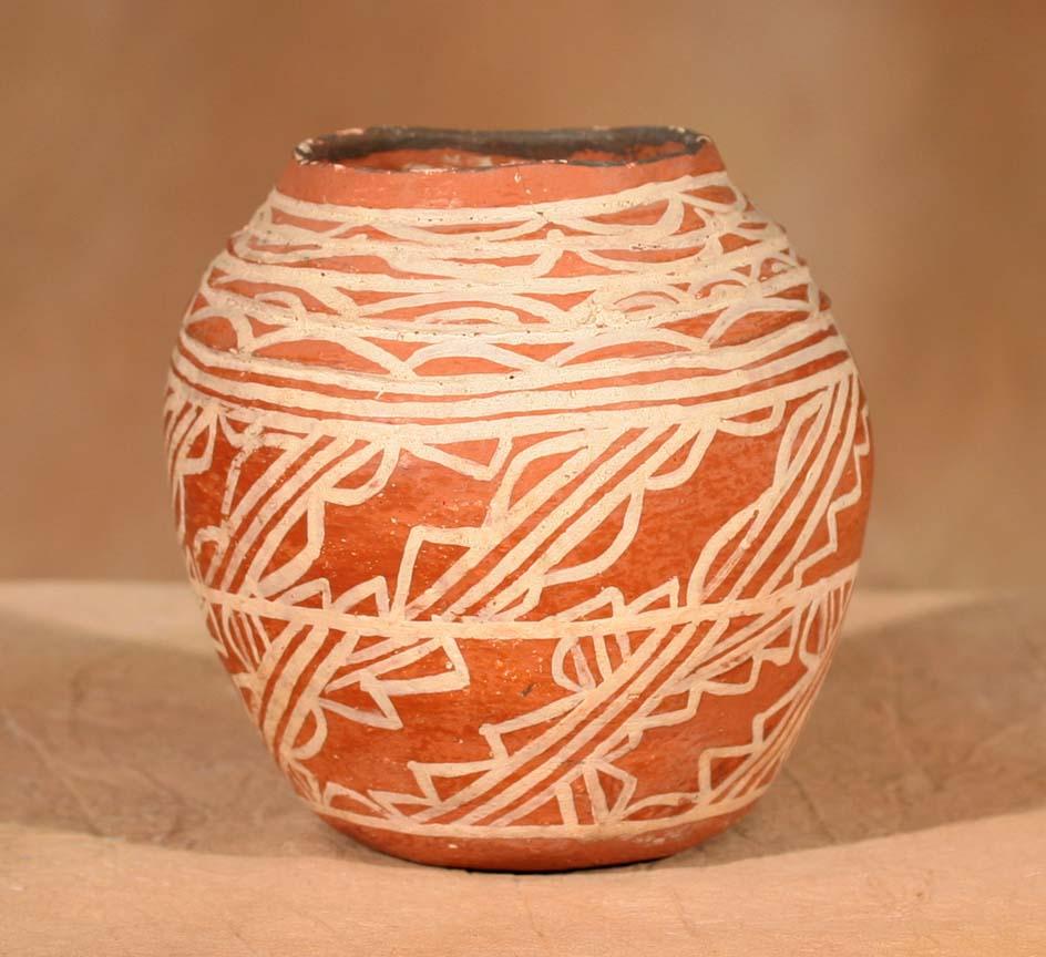 Zuni Jar. 6 ½" x 5 ½". White on red jar with early designs. Circa 1880. (est $500-800). Provenance: Bethany College, Lindsborg, KS. For condition reports please visit: www.auctioninsantafe.com/cr2011.pdf