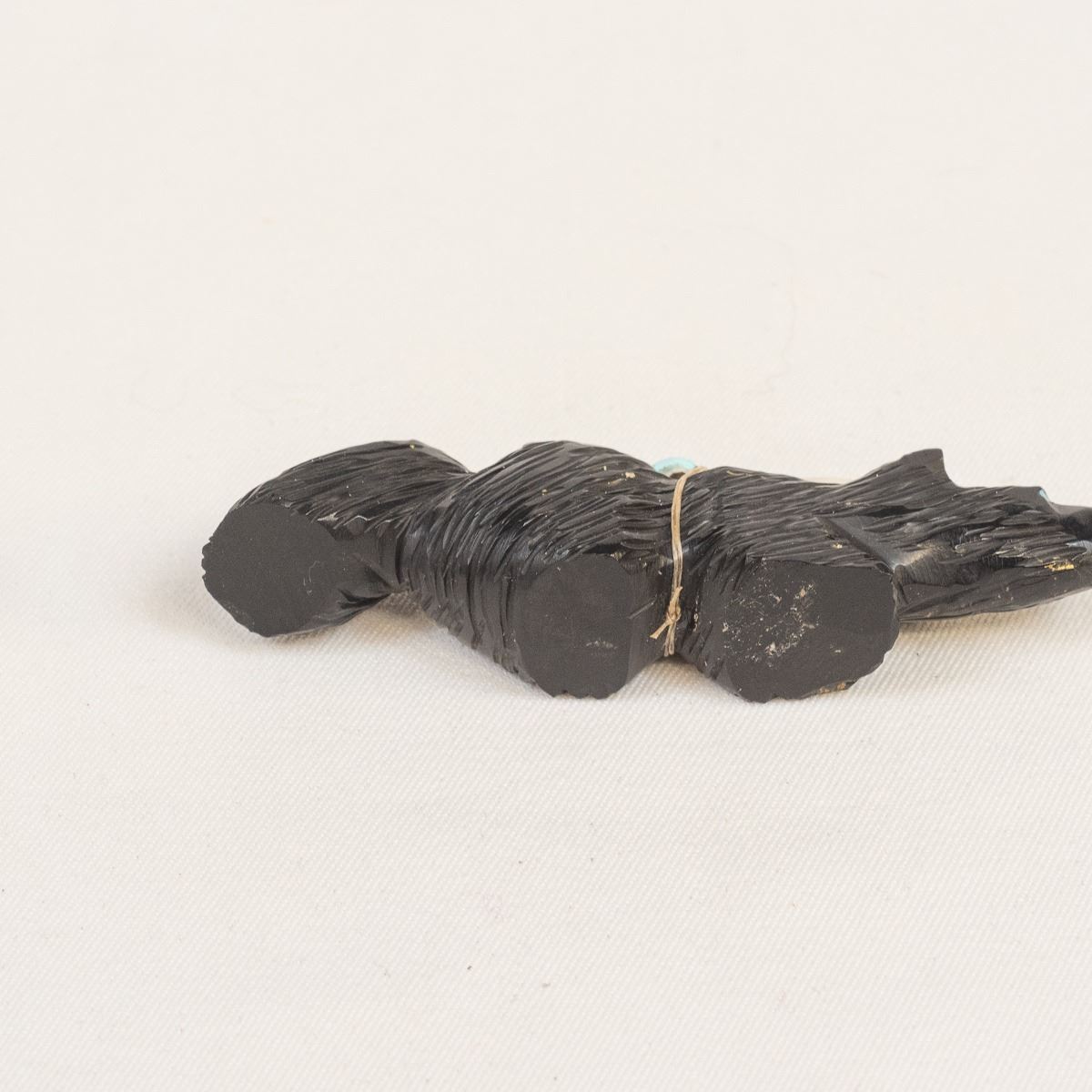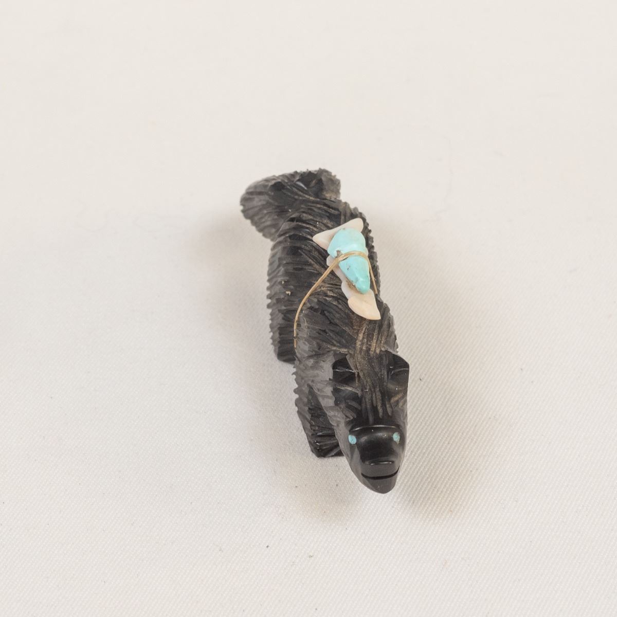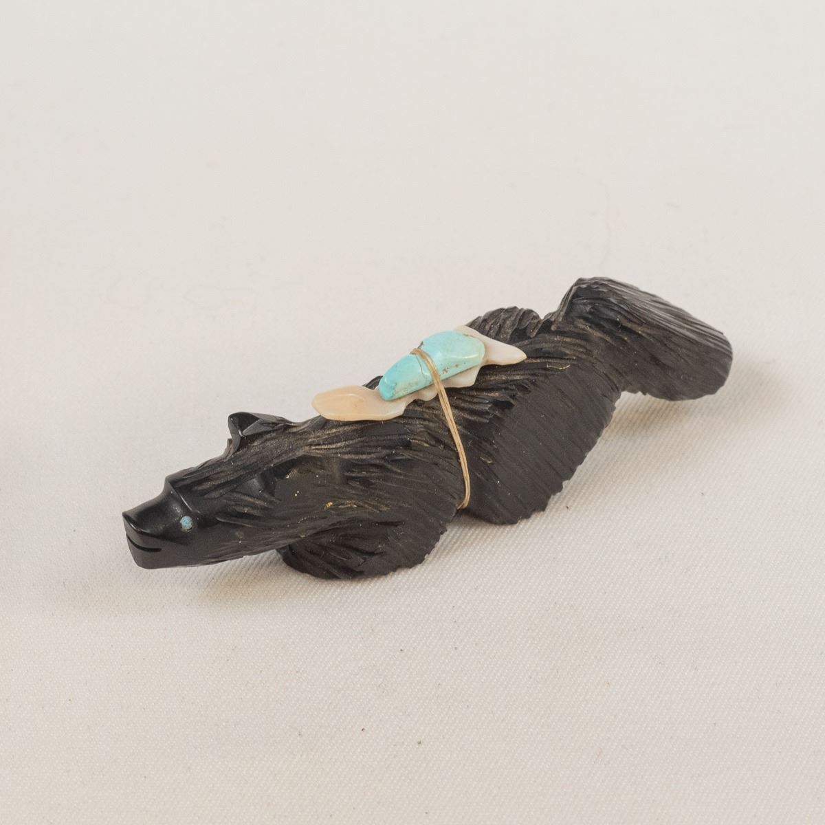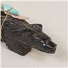 Native American Zuni Jet Bushy Tail Fetish by Eugene Mahooty, measures .75'' x 4''L x 1.5'', turquoise and shell arrowhead spirit bundle, turquoise eyes