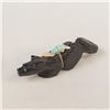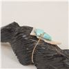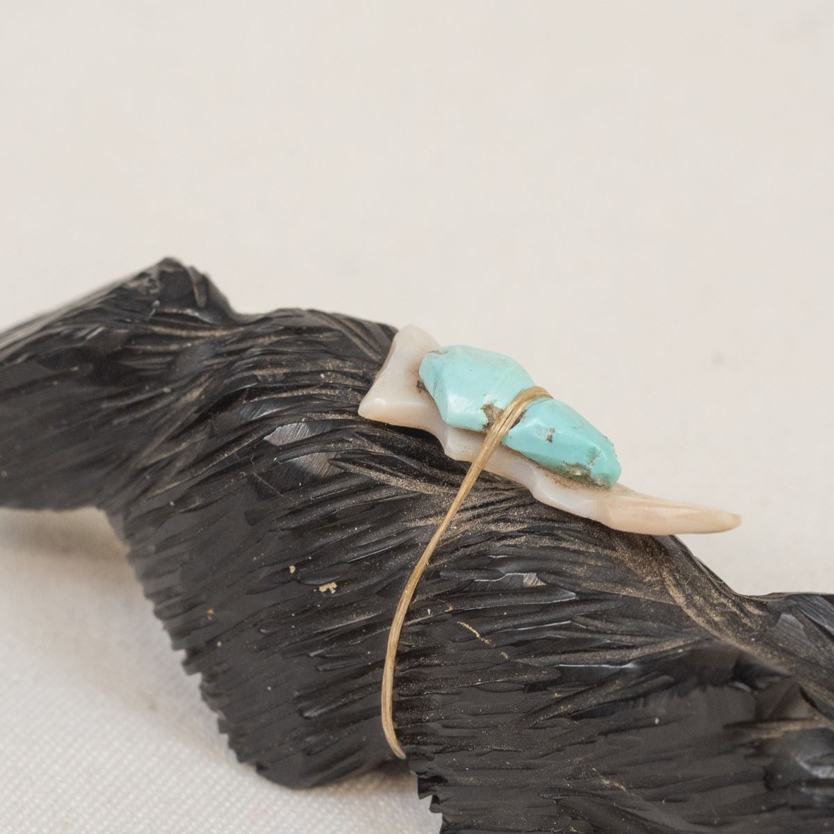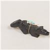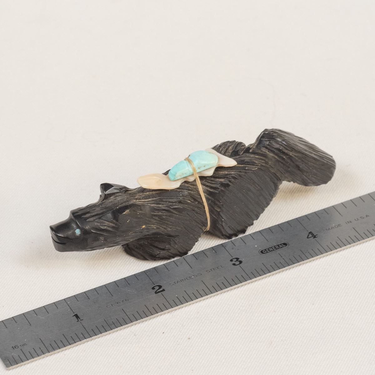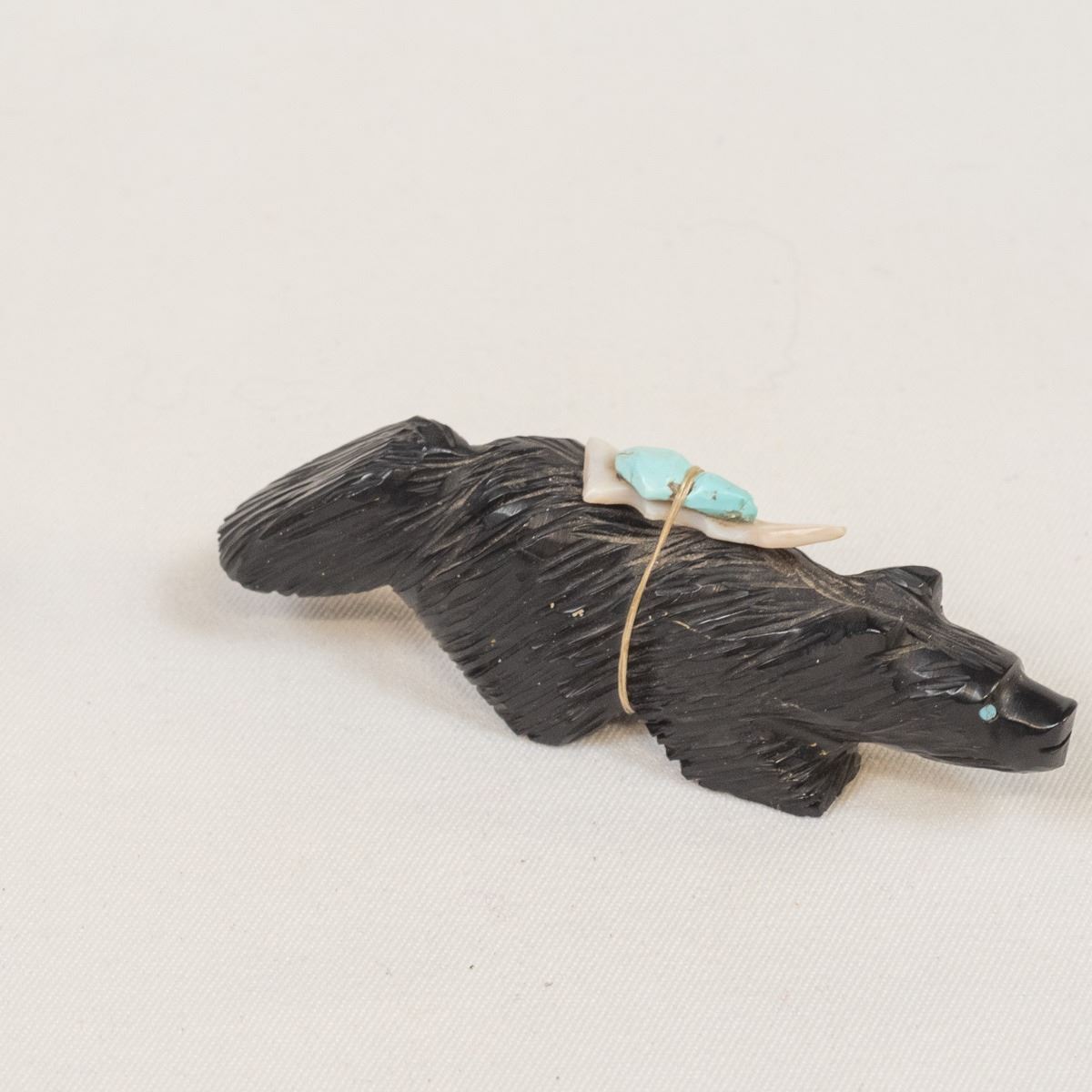 Native American Zuni Jet Bushy Tail Fetish by Eugene Mahooty, measures .75'' x 4''L x 1.5'', turquoise and shell arrowhead spirit bundle, turquoise eyes
