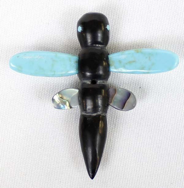 Native American Zuni Jet Turquoise & Abalone Dragonfly Fetish by Herb Halate, measures 2.75'' x 2.5'' x .5'' and has artist's initials on the bottom, has drilled hole through thorax, turquoise eyes