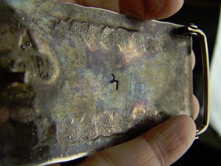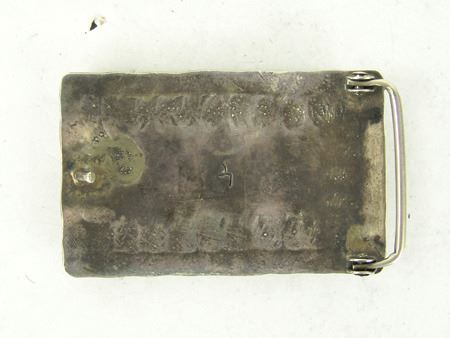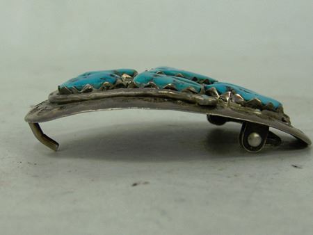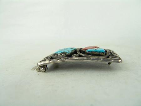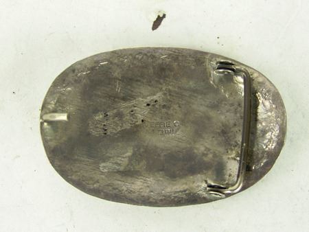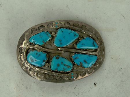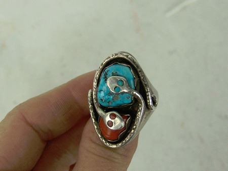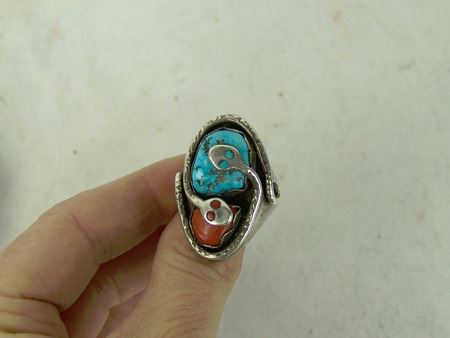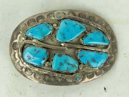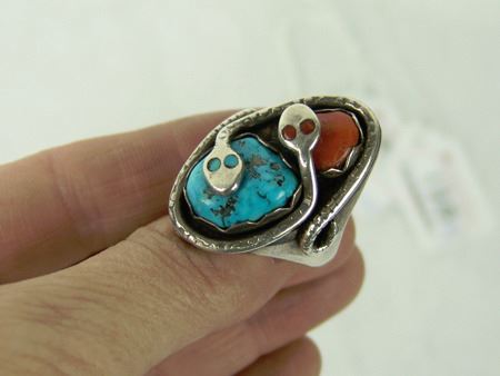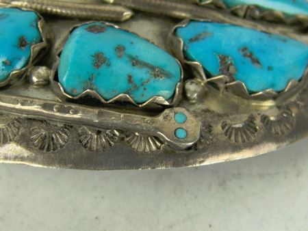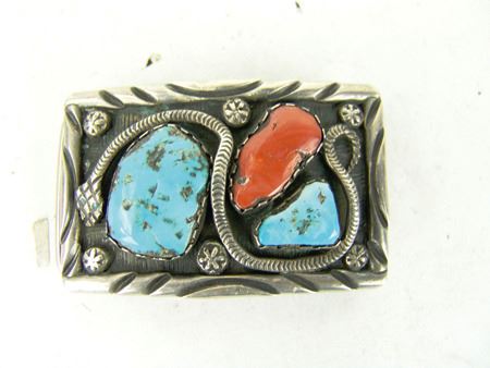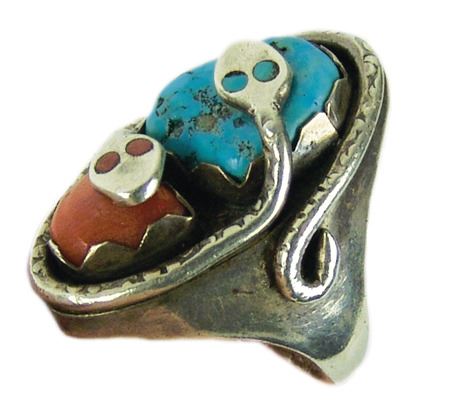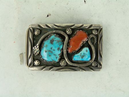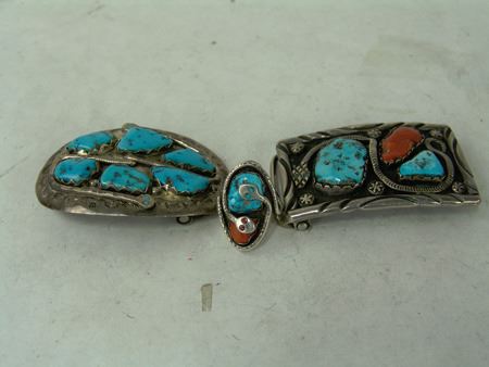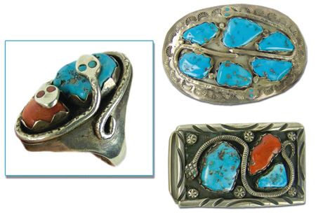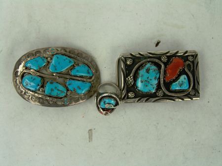 Ca. 1960s-1970s, Three classic pieces of heavy silver done in their unique style with snakes meandering among the turquoise and/or coral stones set in scalloped bezels, including a size 10-1/2 man's ring and two buckles. Oval 2-1/4", rectangle 1-3/8"