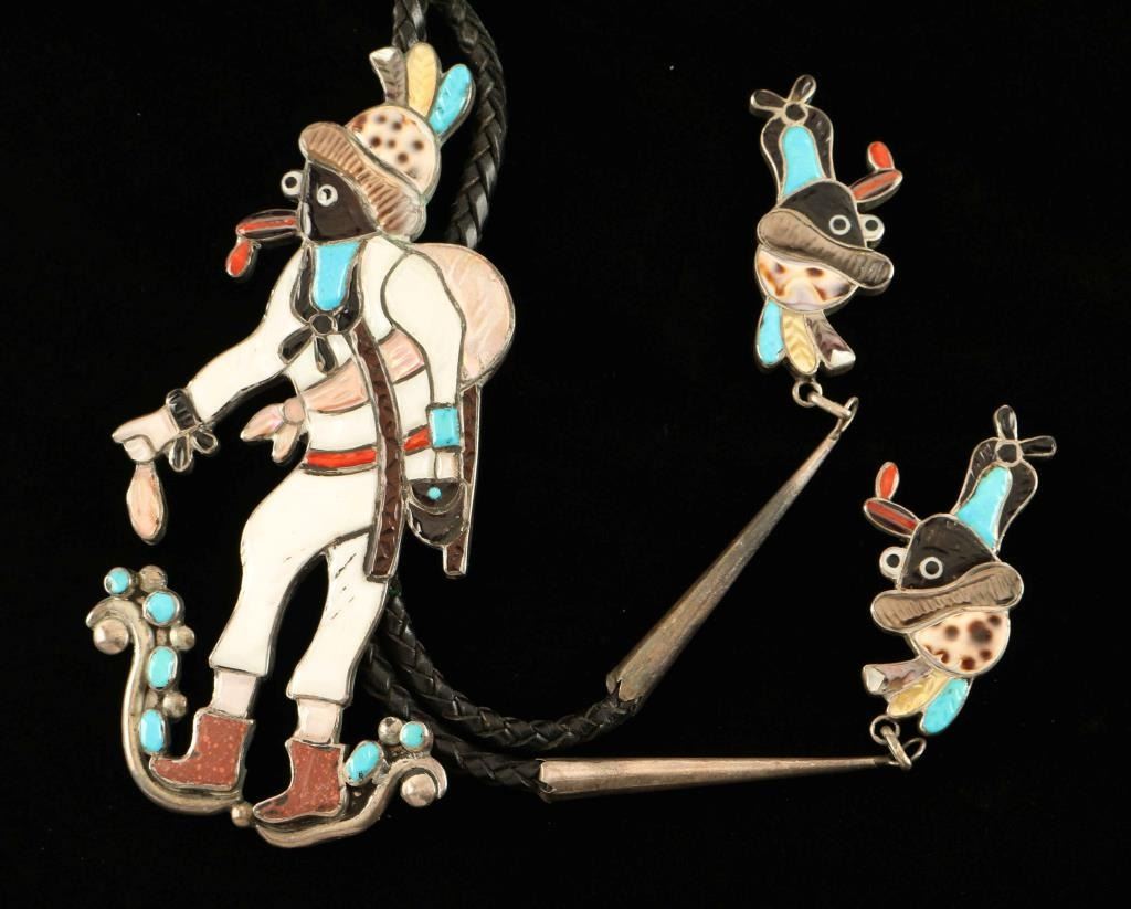 Mudhead design, 1950s style inlaid with mother of pearl, turquoise, jet and others set in sterling. Fancy Mudhead tips.