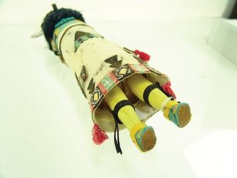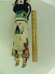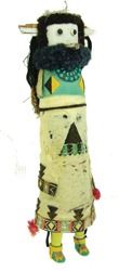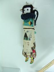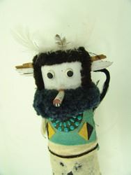 Earlier, hand carved and painted, cedar wood "Shalako" doll with turquoise gorget and traditional wool felt & yarn accoutrements. Fair condition, much of the wool felt is eroded in the front. Early/Mid-1900s. 16"