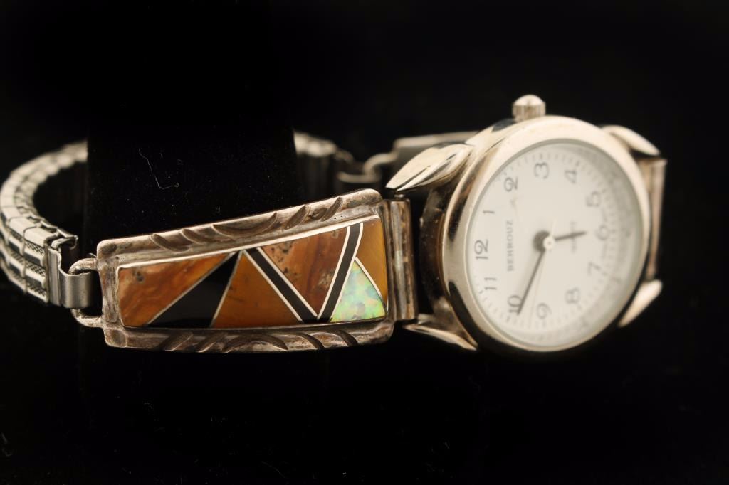 Well done petite Native American sterling silver watch band inlayed with Tigers Eye, Opal & Jet. Stamped "MY" and "Sterling". Includes Behrouz watch (with small crack) and an expandable watch band. Condition is good.