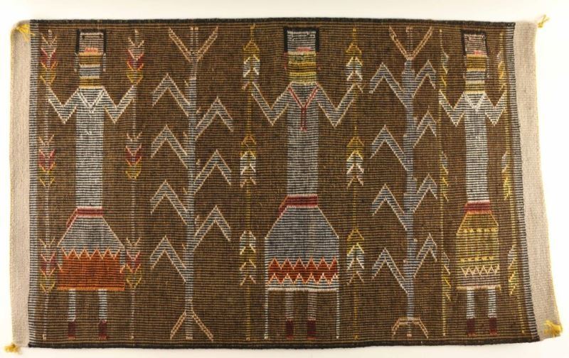 Figural pattern with cornstalks in earth tones of brown, black, gold, orange, and gray. Measures 41 1/2" x 24 3/4". Good condition.