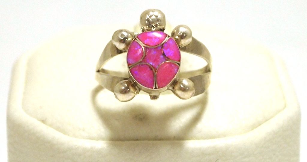 Zuni Matte Pink Opal Inlay Sterling Silver Large Turtle Women's Ring - Vernon Waikaniwa