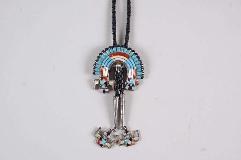 Zuni Men's Bolo Tie Inlaid turquoise, onyx, Mother of Pearl, and red coral. Set in beautiful sterlin
