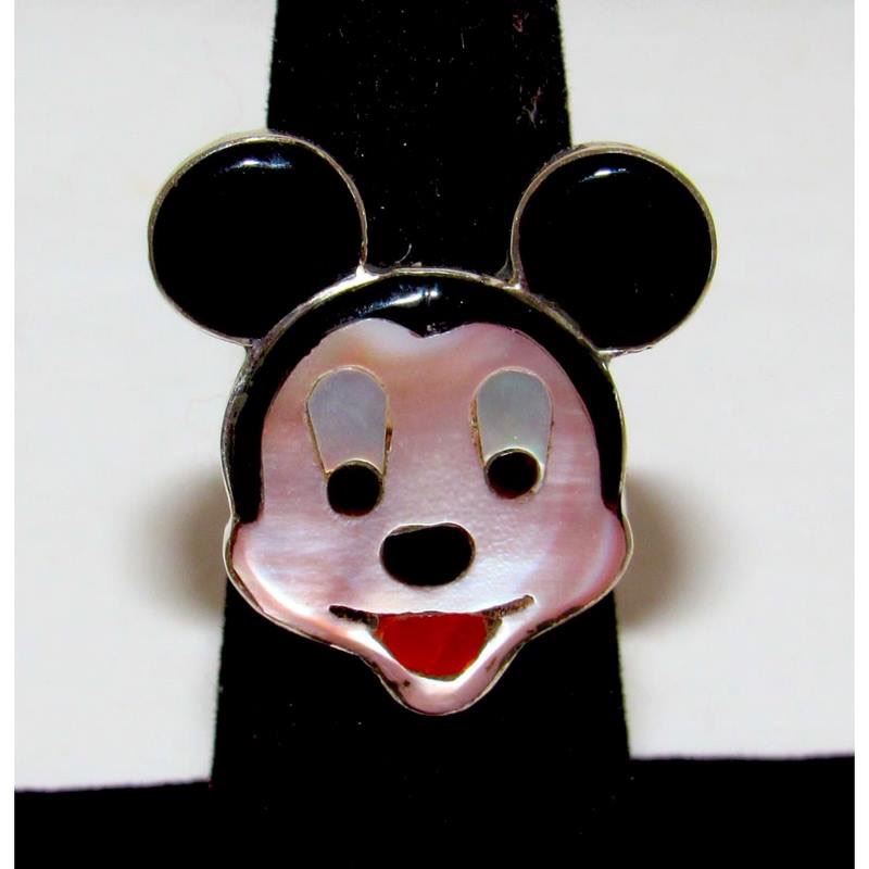 Phenomenal Zuni sterling silver, jet, mother of pearl, coral inlay adorable Disney Mickey Mouse character ring by the collectible Zuni artist Don Dewa. Intricately inlaid design of an adorable Disney character. Multi stone inlay including jet, shell, mother of pearl, turquoise in sterling silver setting. Signed, marked, tested. The ring is size 6, adjustable and measures about 1". Highly collectible Zuni art to add to any jewelry collection! FREE SHIPPING ON ALL JEWELRY ORDERS WITHIN THE US! WE SHIP ALL ITEMS IN-HOUSE!
