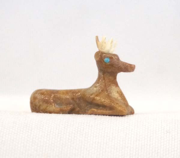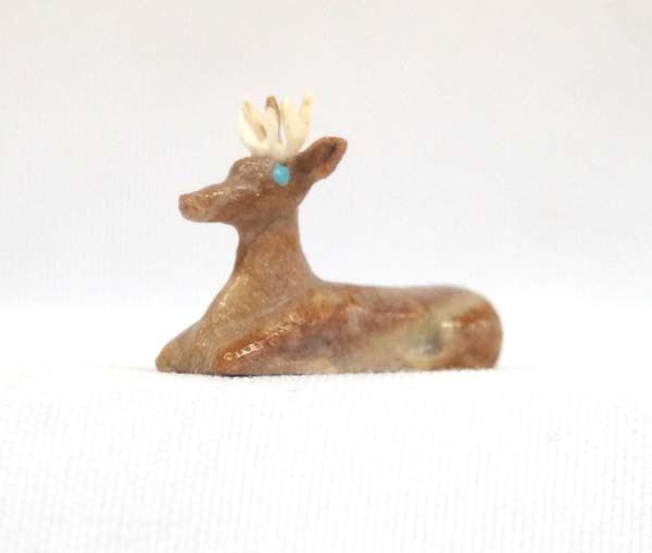 Native American Zuni Miniature Picasso Marble Deer Fetish by Raybert Kanteena, measures 1''L, signed by artist, turquoise eyes