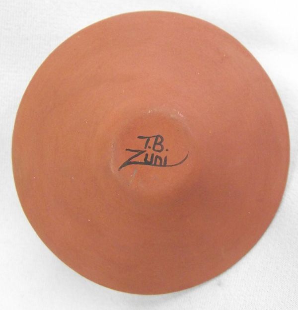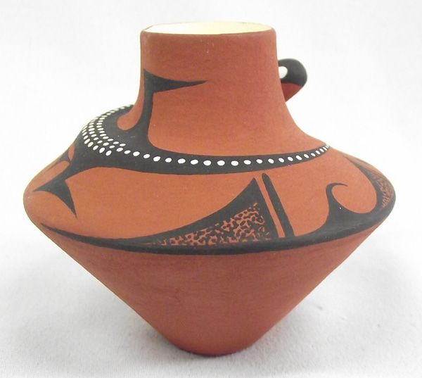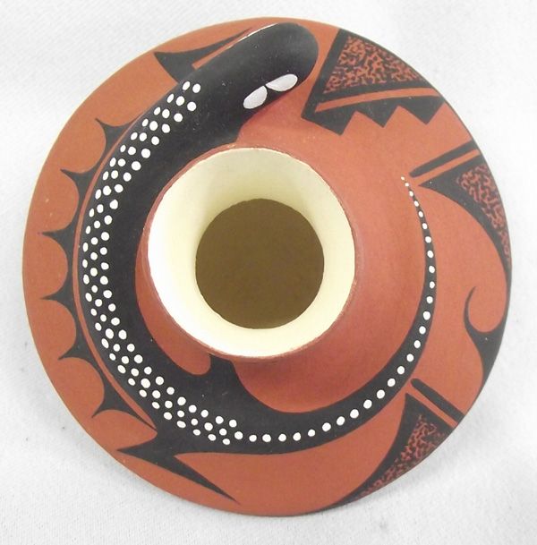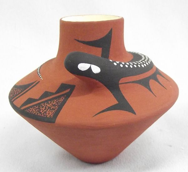 Zuni Miniature Lizard Bowl - Tammy Belson. Engaging lizard twines around the rim of this small pottery jar. Striking black on deep reddish brown. Heavy, sturdy jar. Artist's hallmark on bottom, ''T.B. Zuni.'' Measures 2.75'' x 2.5''.