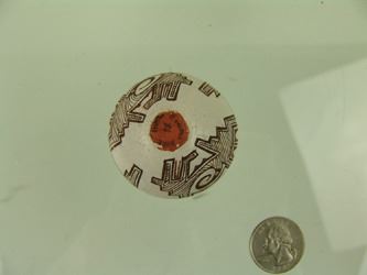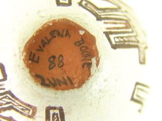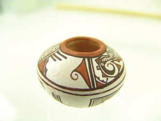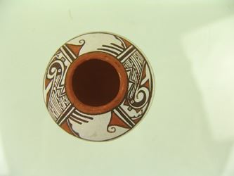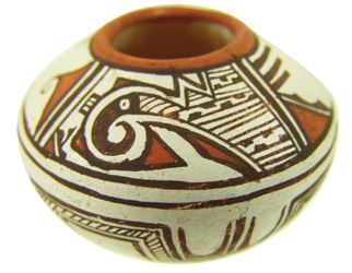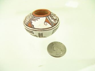 Very fine, miniature, polychrome pottery jar with traditional Zuni, avian inspired designs. Very good condition with minor surface scratches. Ca. 1980s. 1-1/2" x 2"