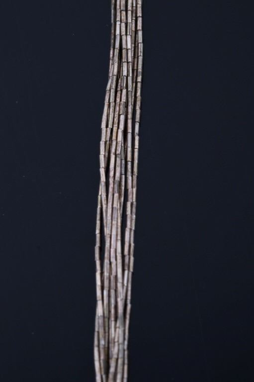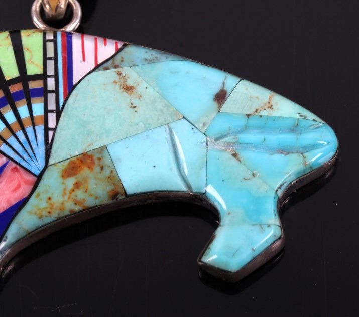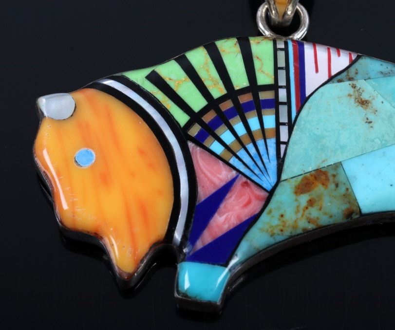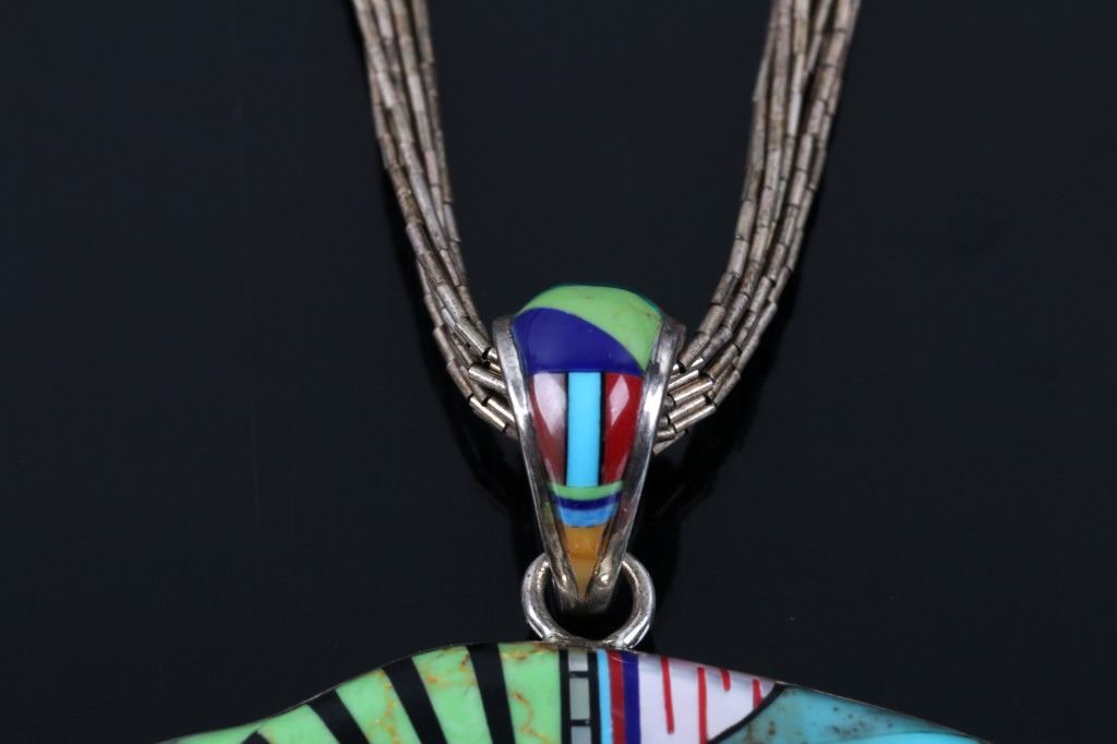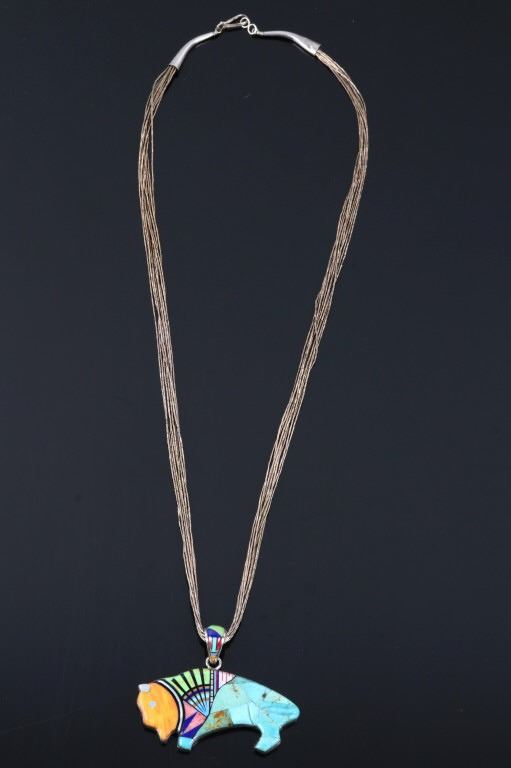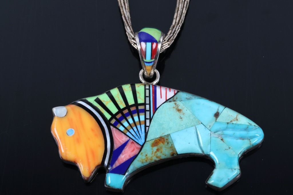 Available in this lot we have a Zuni Native American Mosaic multi stone inlayed and sterling silver buffalo pendant necklaces. The pendant displays a buffalo design with a mosaic pattern displaying turquoise, onyx, mother of pearl, Lapis Lazuli, coral, along with other stones. The pendant is backed with sterling silver and marked "Sterling S*". The pendant is set onto a ten strand liquid silver necklace with silver caps. The caps are marked "Sterling". The piece shows good condition overall with a warm patina across the necklace. The necklace measures 24" long unclasped with the pendant measuring 2 1/4" wide by 1 3/4" tall.