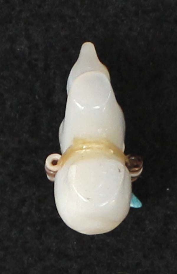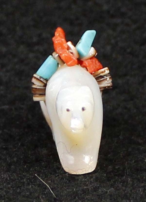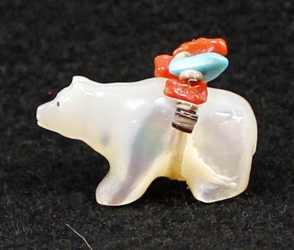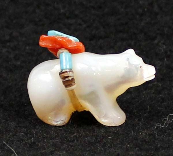 Native American Zuni Mother of Pearl Bear Fetish by Fernando Laiwakete, measures .5'' x 1'' and has artist's initials on the bottom, spirit bundle includes shell heishi, coral, and turquoise