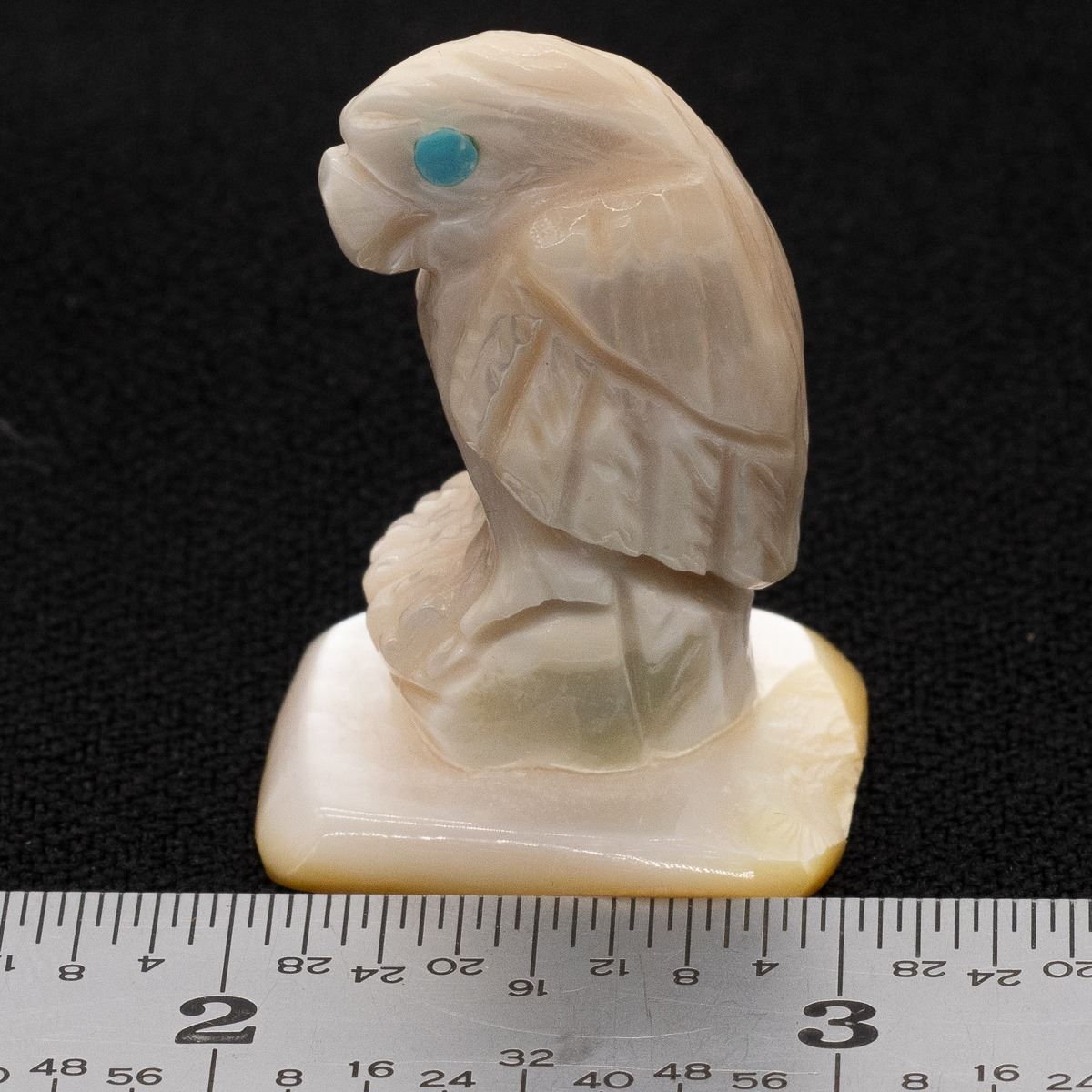 Native American Zuni Mother of Pearl Eagle Fetish by Carlos Tsattie, measures 1'' x 1.5'' x .5'' and is signed on the bottom, turquoise eyes