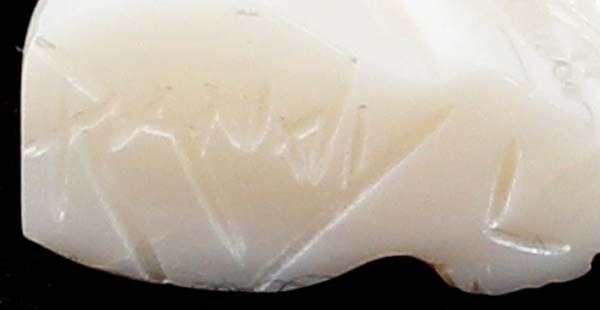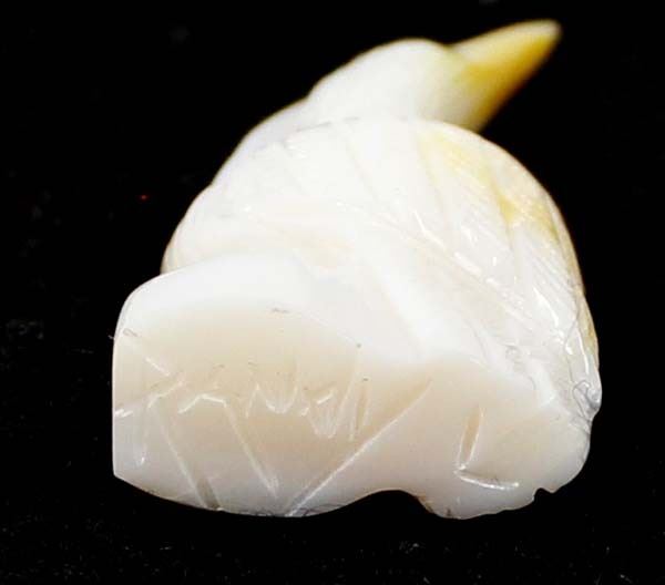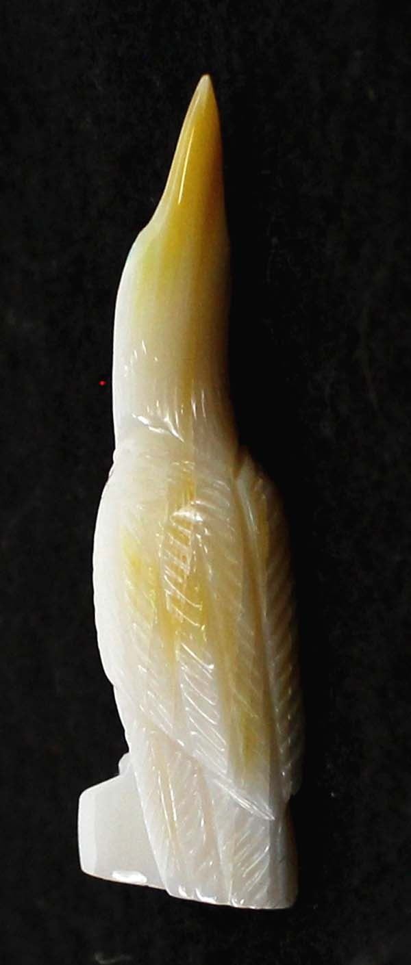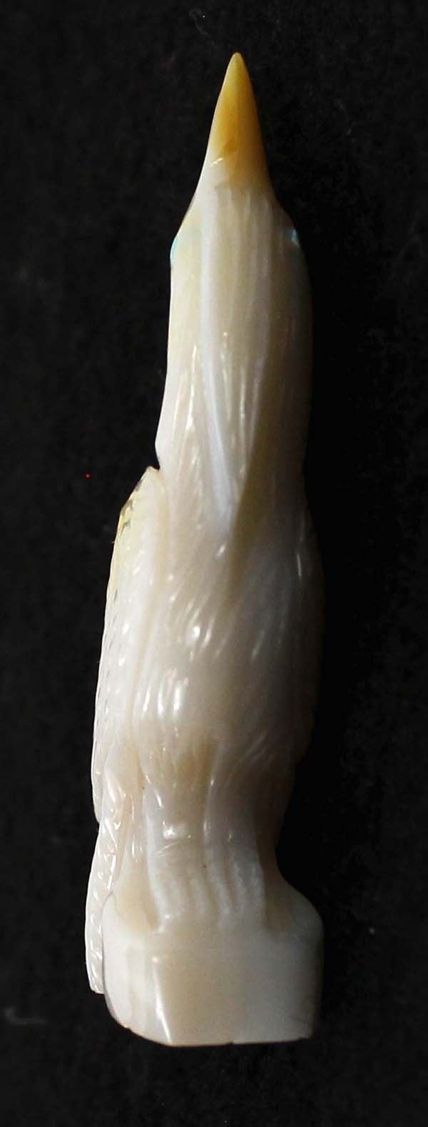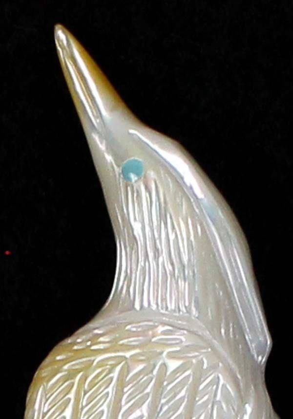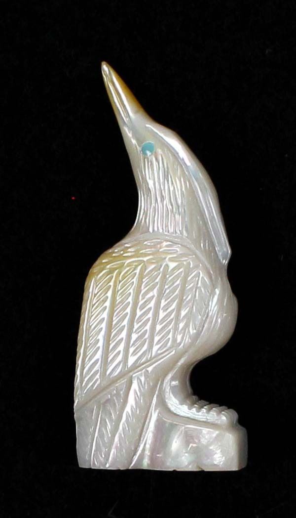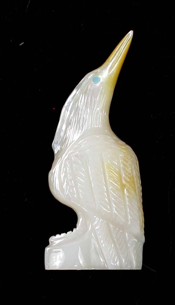 Native American Zuni Mother of Pearl Egret Fetish by Randy Lucio, measures .75'' x 2''H, signed on the bottom, turquoise eyes, beautiful fetish